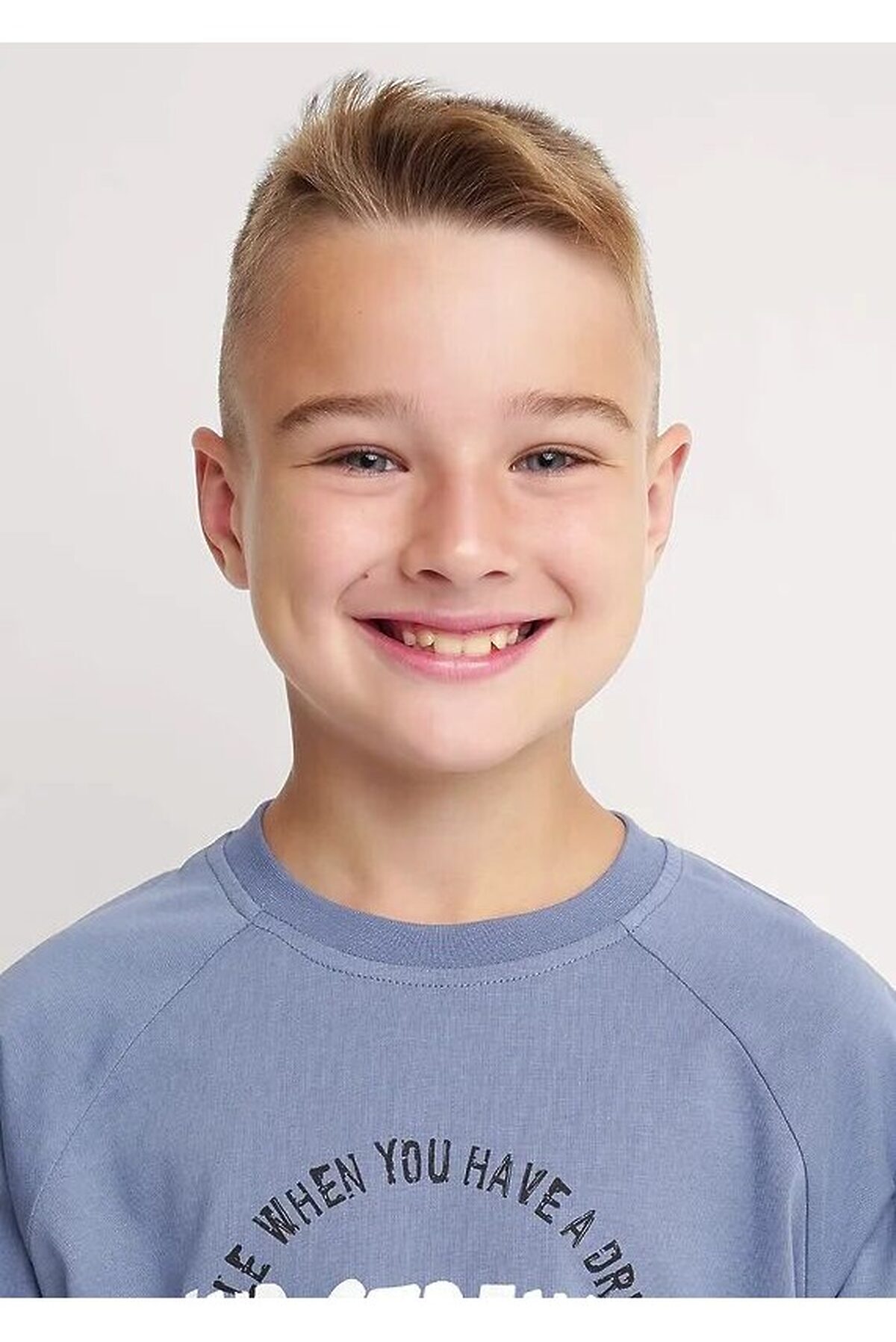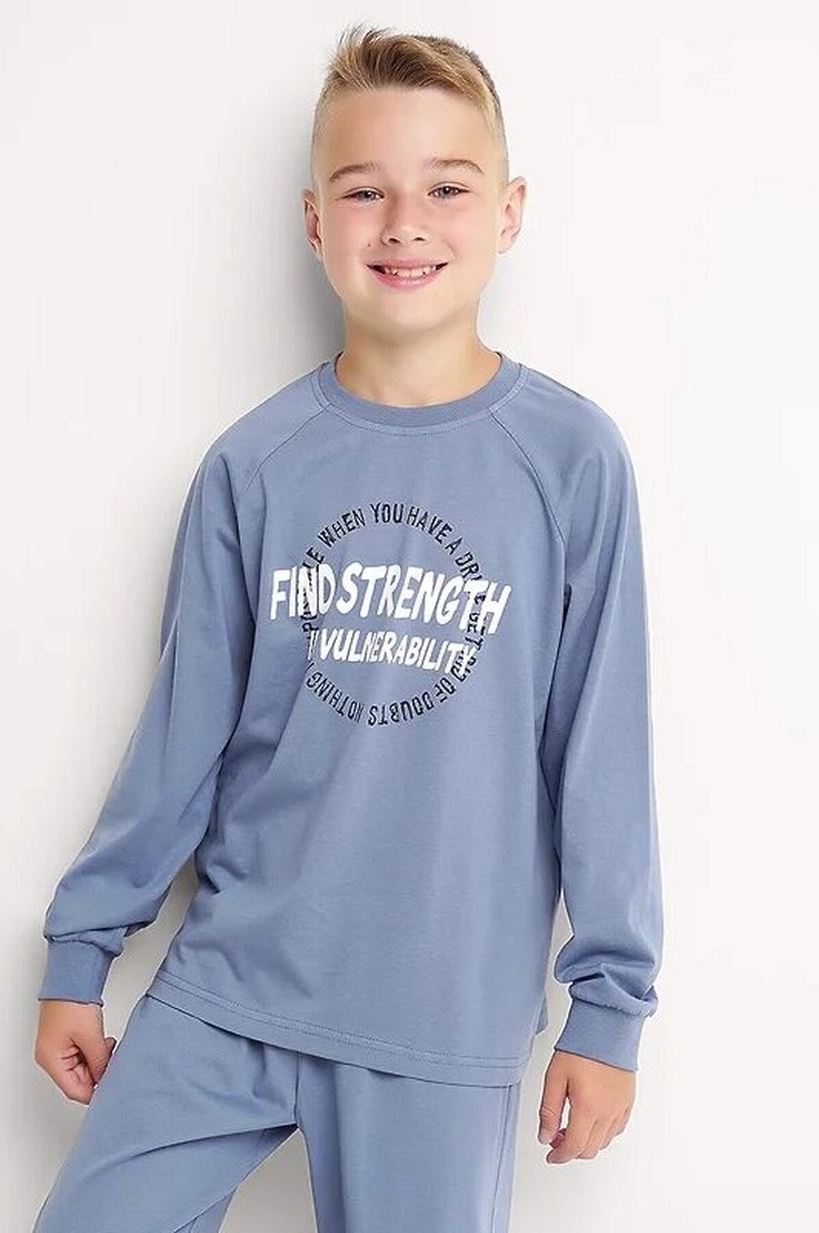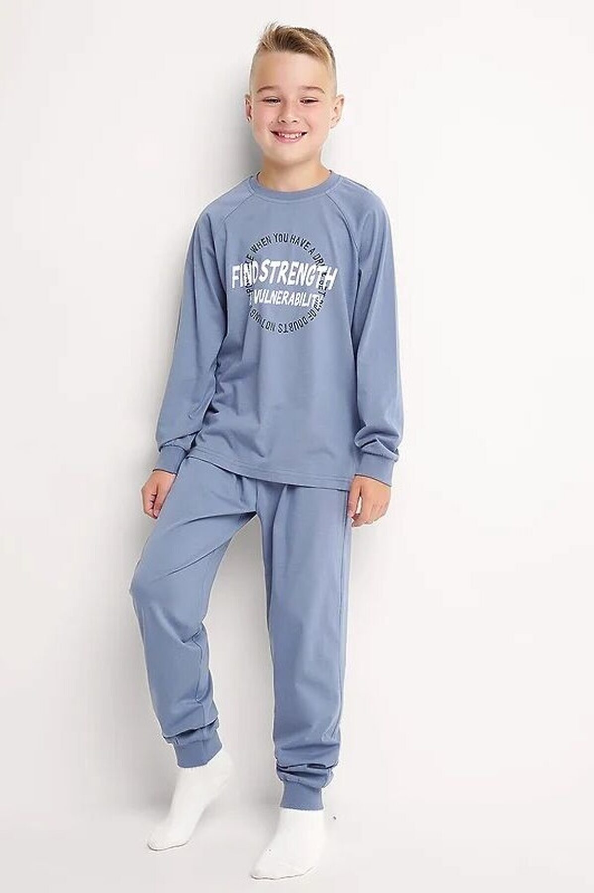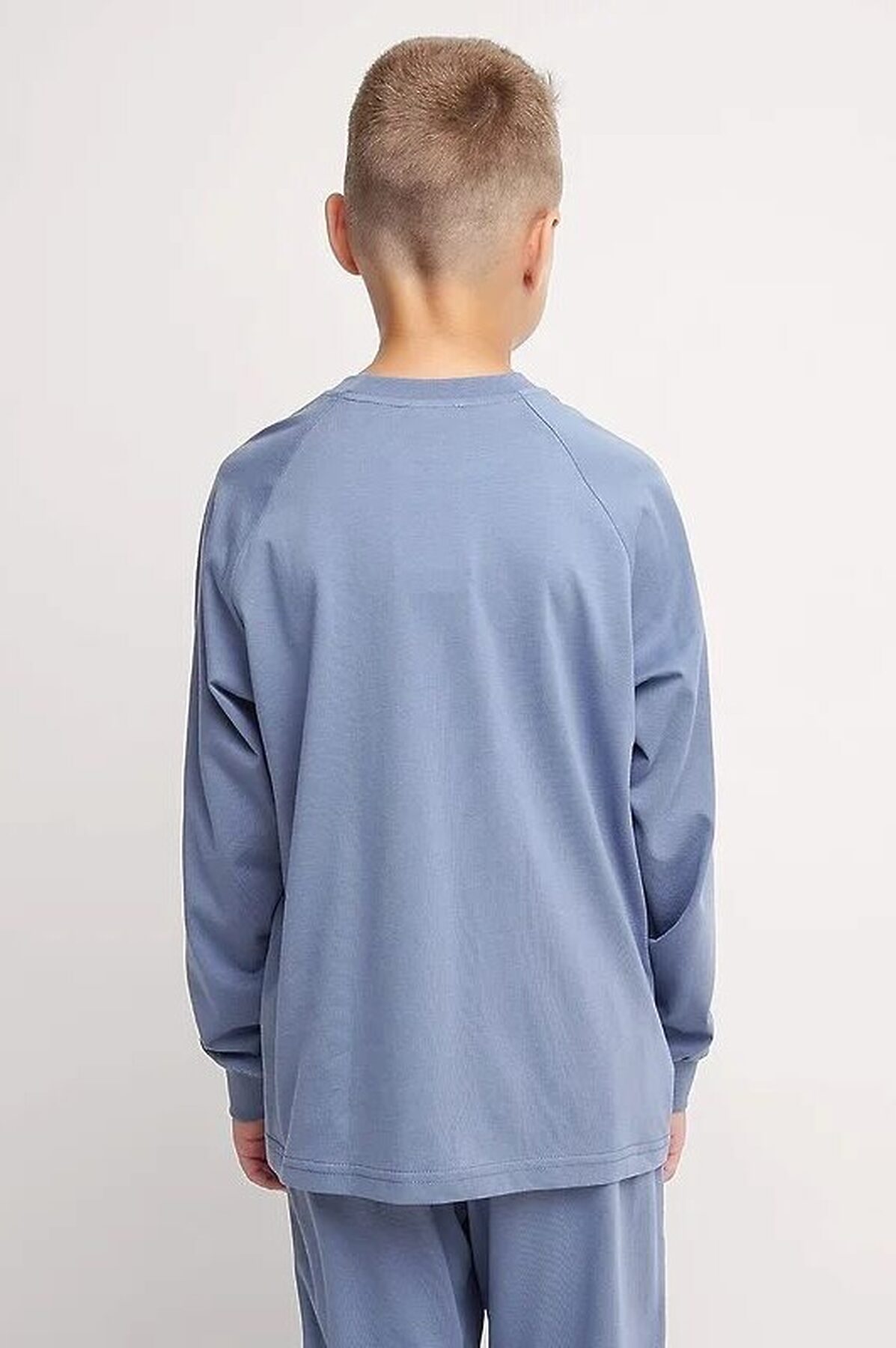 Комплект хлопковой пижамы из джемпера и брюк. Джемпер свободного кроя дополнен эластичной горловиной и манжетами. Брюки среднего объема, эластичный пояс обеспечит комфорт и идеальную посадку. По низу брюк эластичные манжеты.