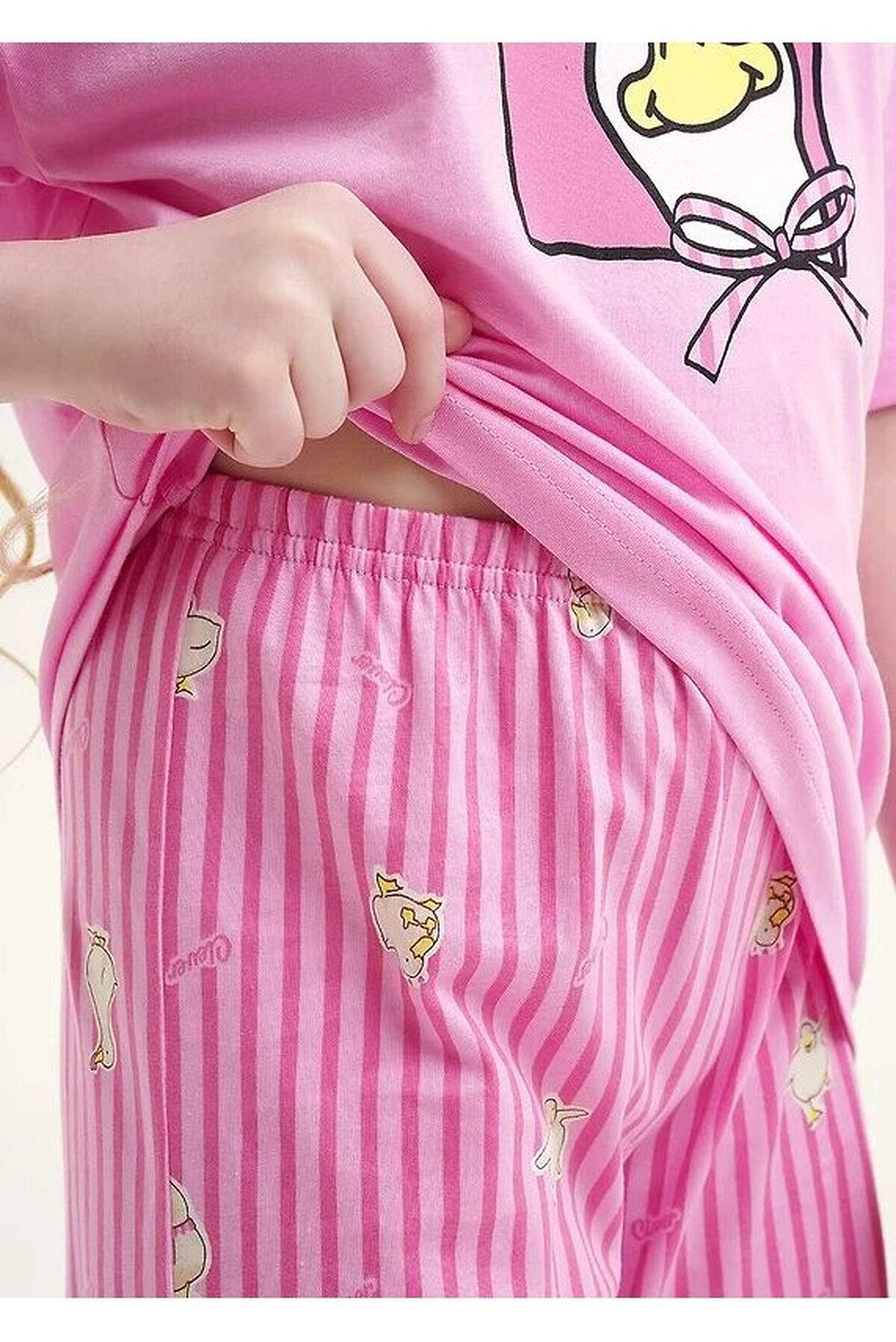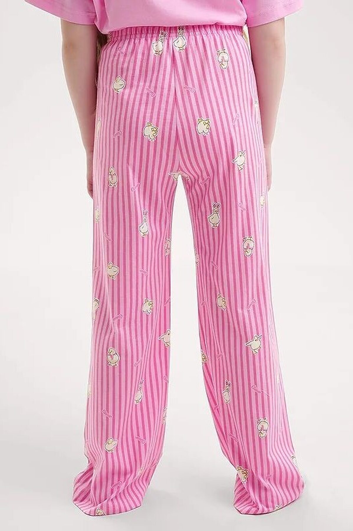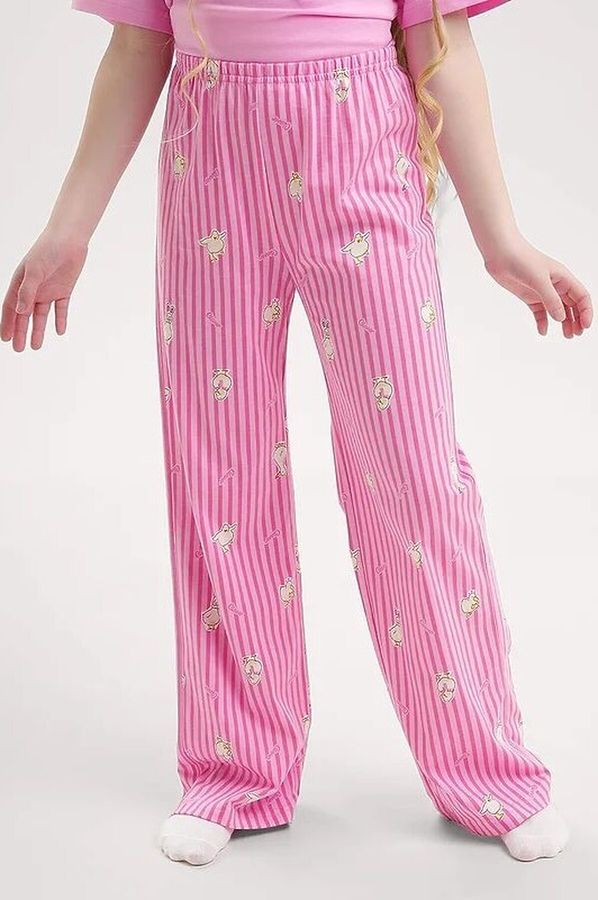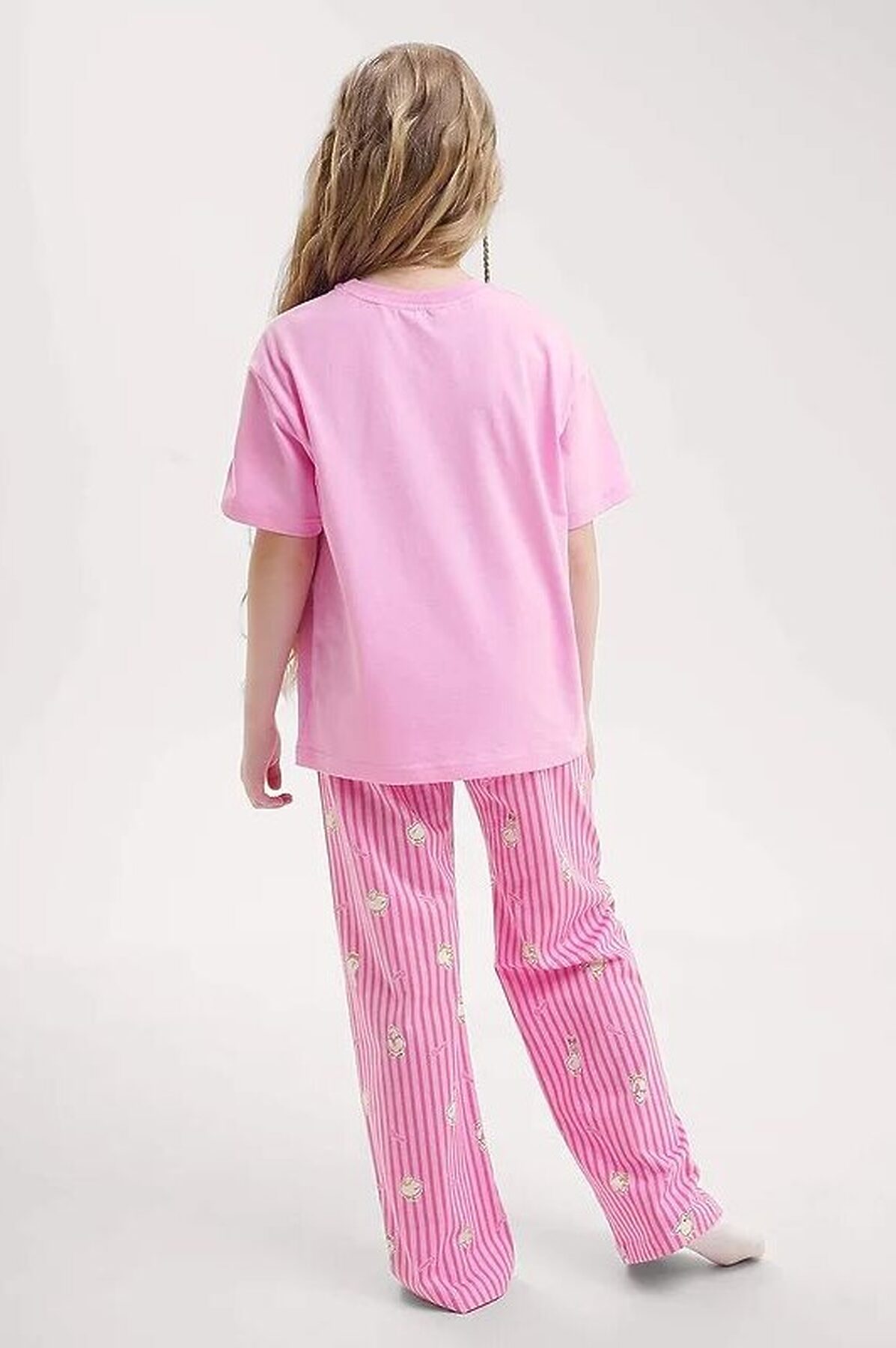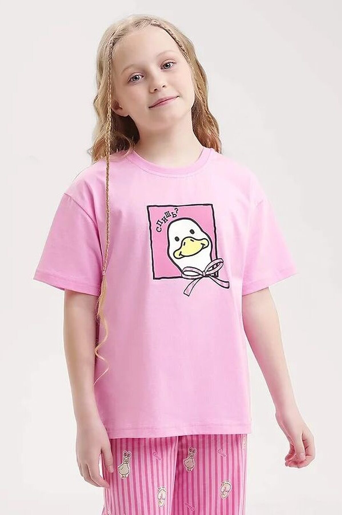 Комплект хлопковой пижамы из футболки и брюк. Футболка свободного кроя дополнена эластичной горловиной и стильным принтом. Брюки среднего объема, эластичный пояс обеспечит комфорт и идеальную посадку, а стильная набивка подарит хорошее настроение.