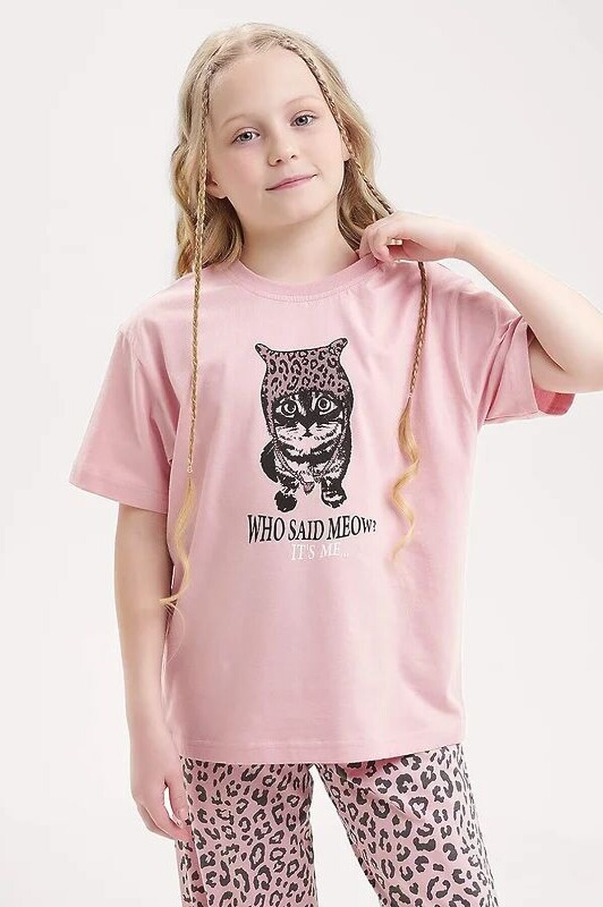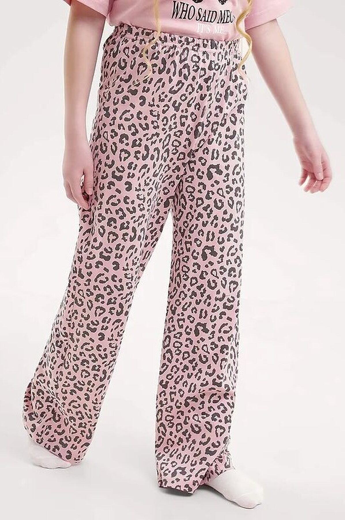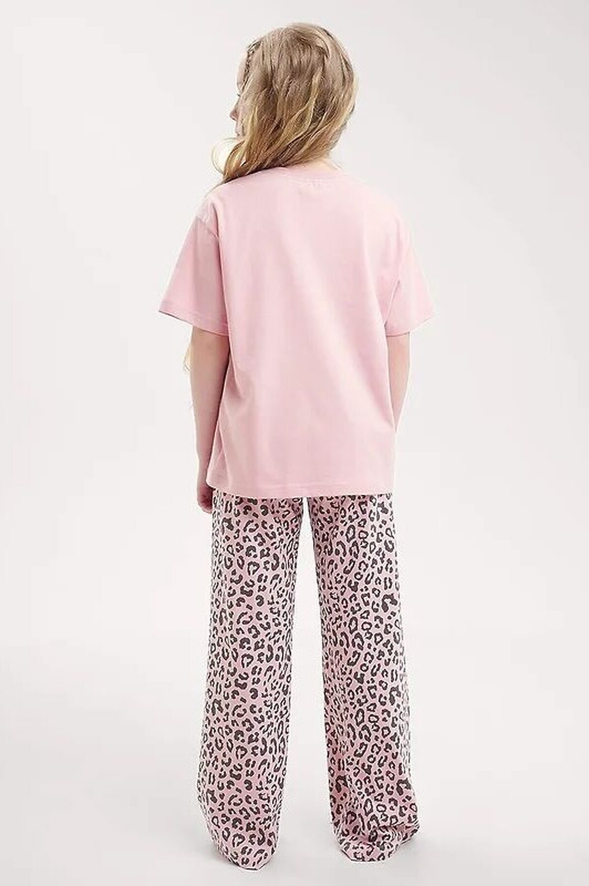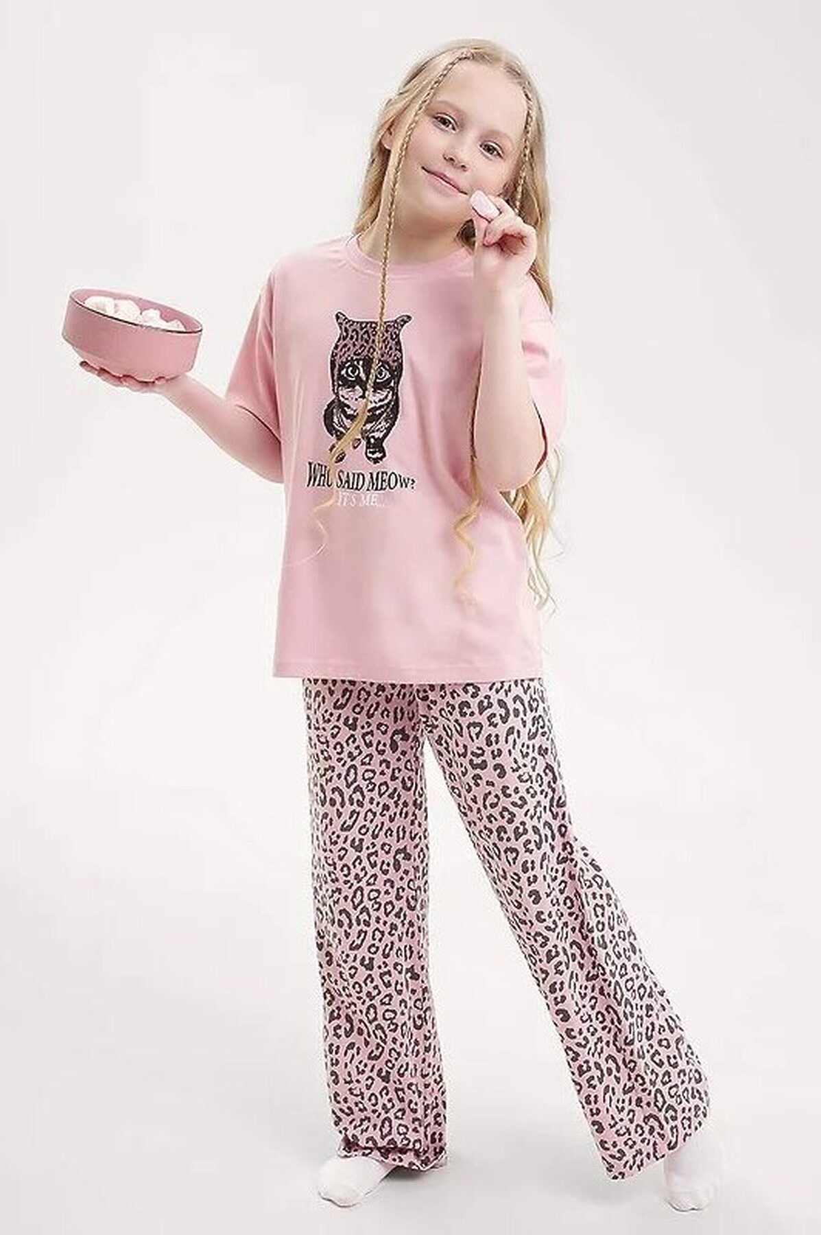 Комплект хлопковой пижамы из футболки и брюк. Футболка свободного кроя дополнена эластичной горловиной и стильным принтом. Брюки среднего объема, эластичный пояс обеспечит комфорт и идеальную посадку, а стильная набивка подарит хорошее настроение.