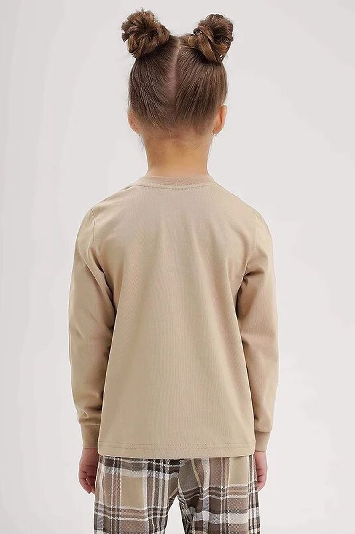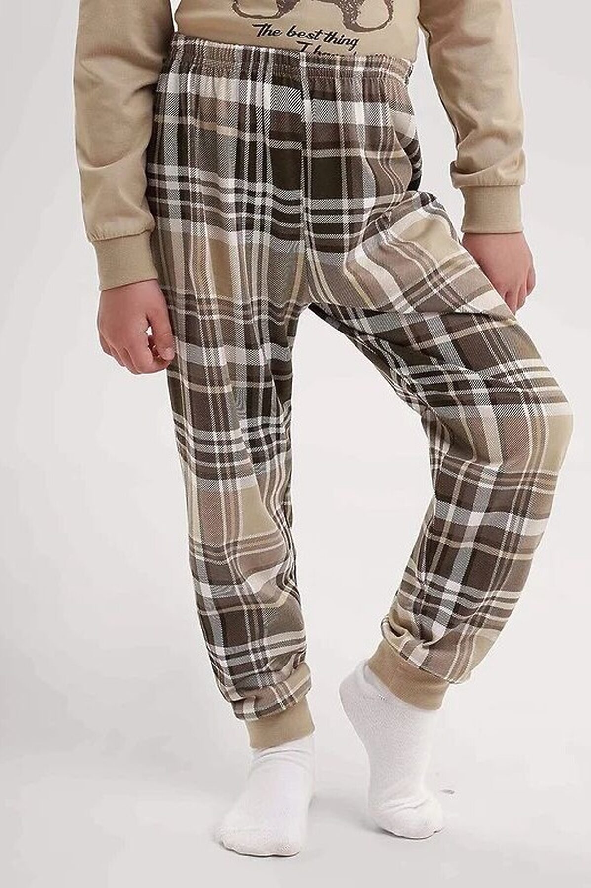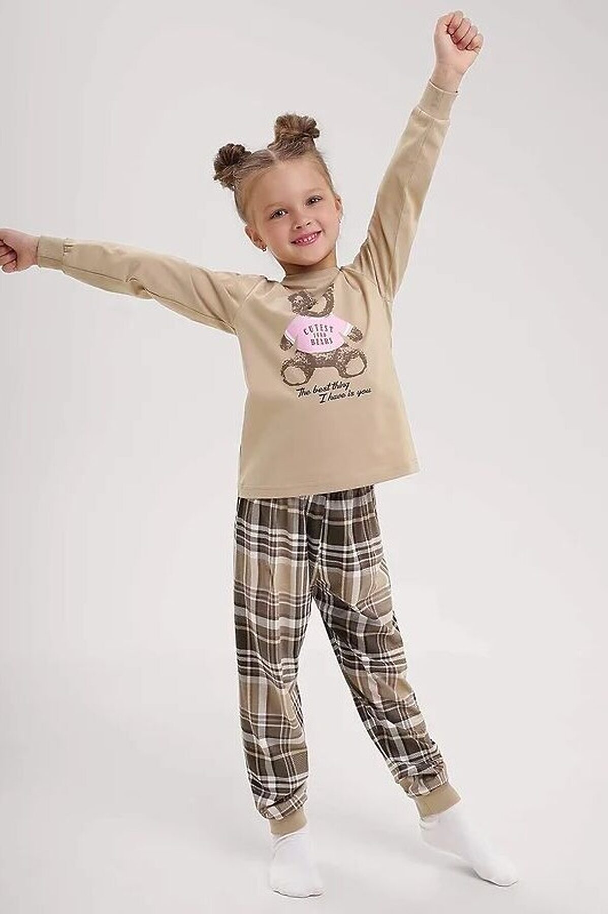 Комплект хлопковой пижамы из джемпера и брюк. Джемпер свободного кроя дополнен эластичной горловиной и манжетами. Брюки среднего объема, эластичный пояс обеспечит комфорт и идеальную посадку. По низу брюк эластичные манжеты.
