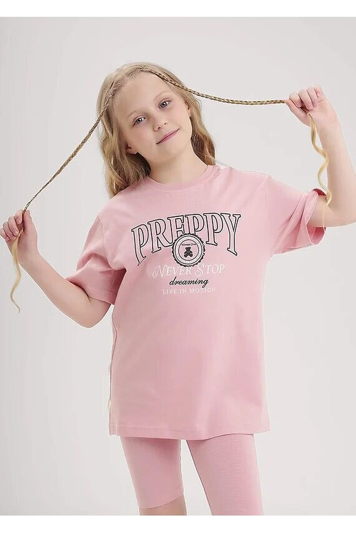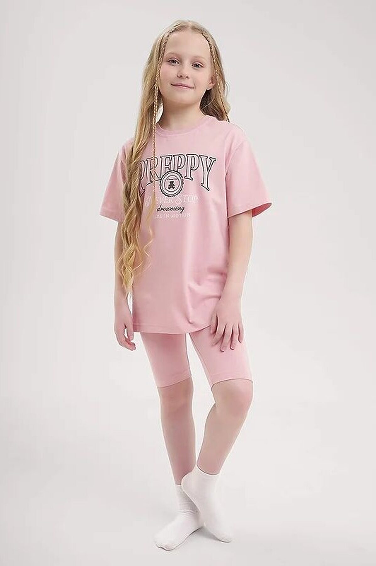 Комплект домашней пижамы из велосипедок и футболки. Футболка свободного кроя дополнена эластичной горловиной и стильным принтом. Велосипедки дополнены эластичным поясом для большего удобства.
