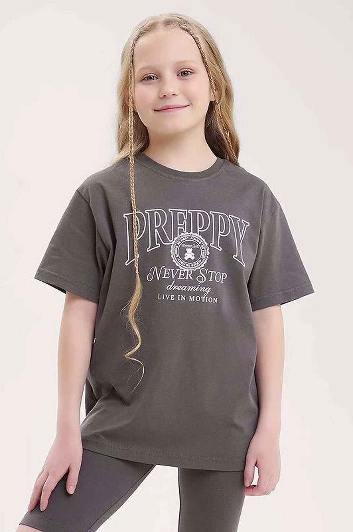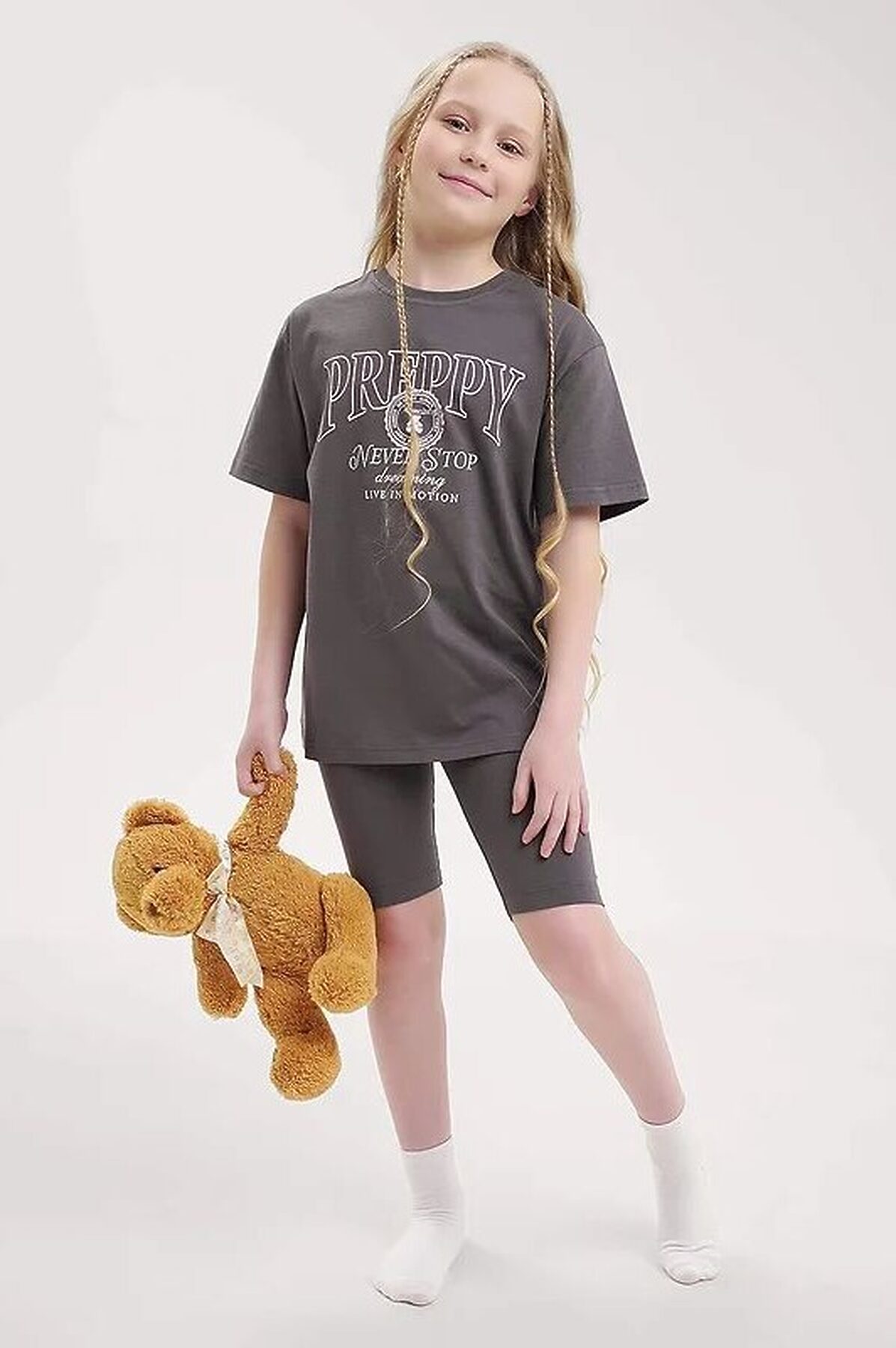 Комплект домашней пижамы из велосипедок и футболки. Футболка свободного кроя дополнена эластичной горловиной и стильным принтом. Велосипедки дополнены эластичным поясом для большего удобства.