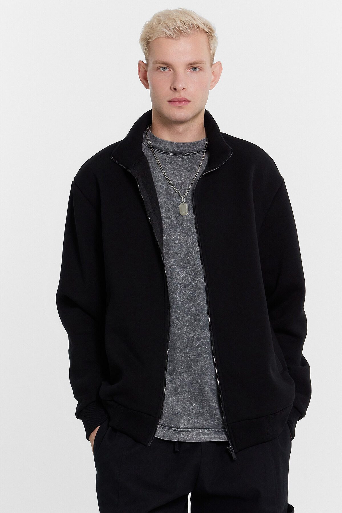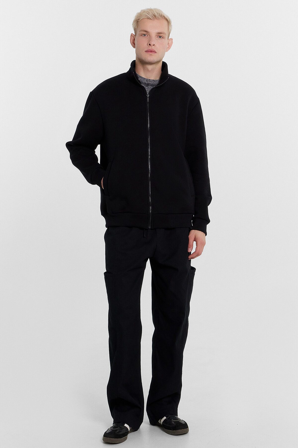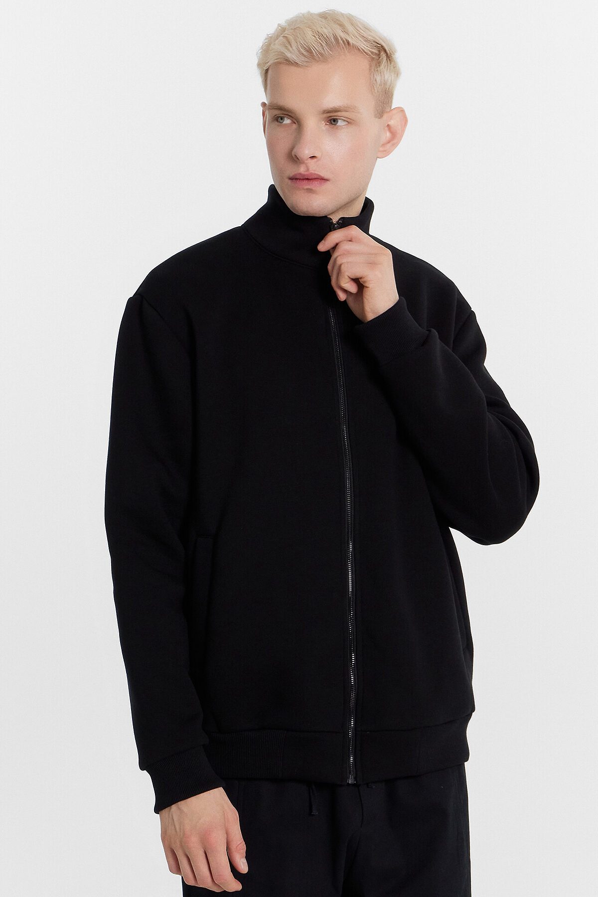 Жакет изготовлен из трикотажного полотна футер. Жакет прямого силуэта свободный, длиной до середины бедер. Горловина округлой формы с воротником стойкой из основного полотна. Рукава втачные, длинные с отрезными манжетами. По переду обработаны прорезные карманы с листочкой. Центральная застежка на тесьму молнию. Пояс и манжеты - рибана.