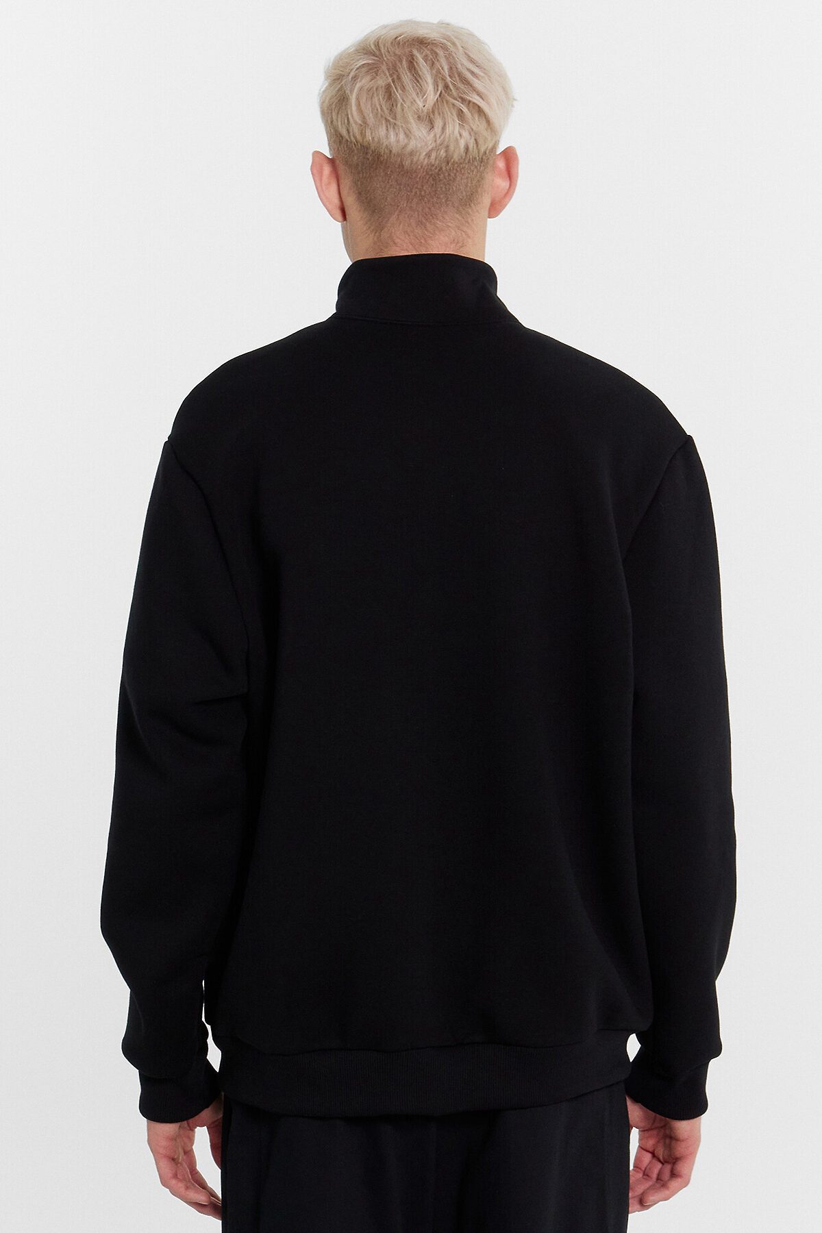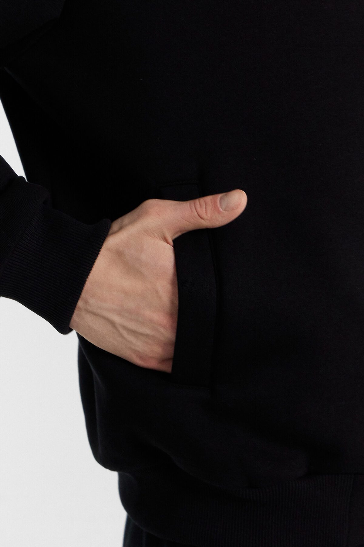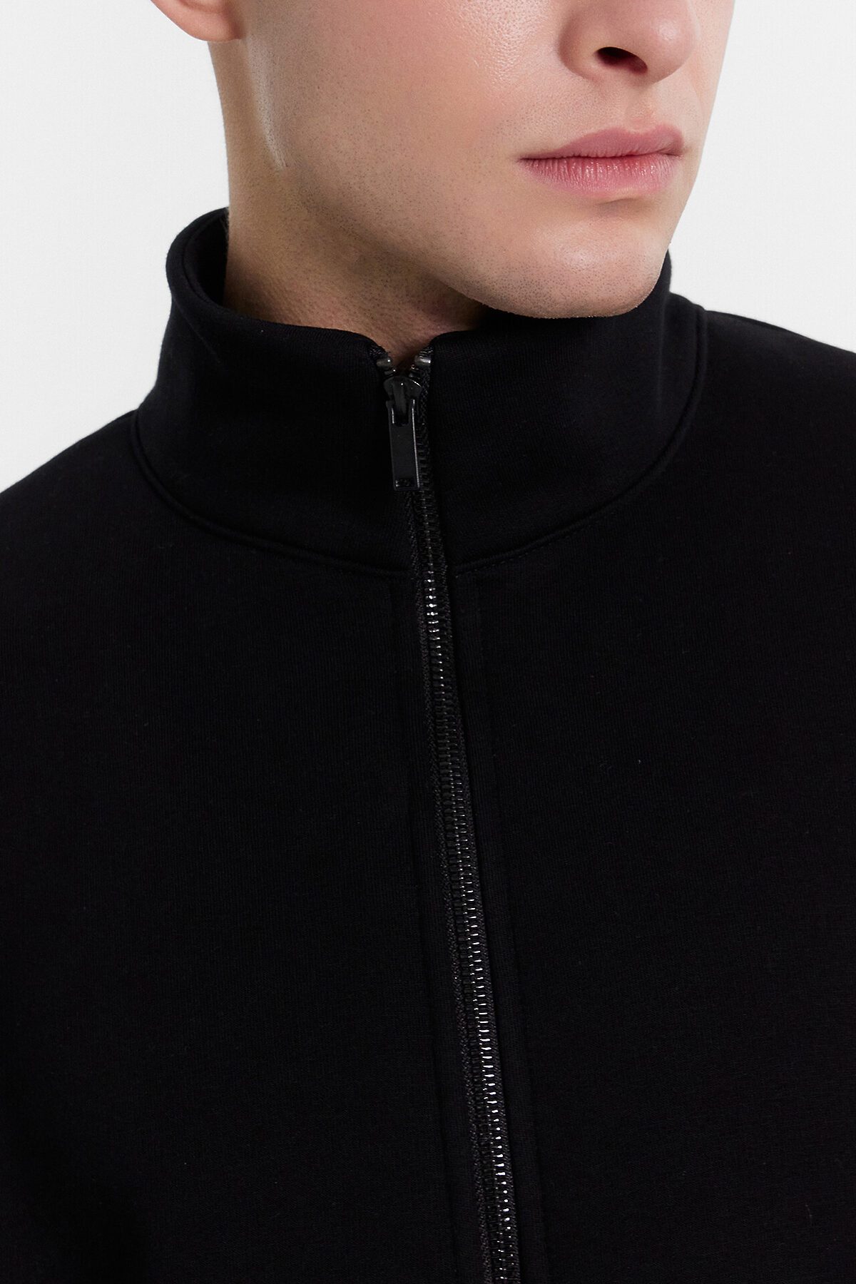 Жакет изготовлен из трикотажного полотна футер. Жакет прямого силуэта свободный, длиной до середины бедер. Горловина округлой формы с воротником стойкой из основного полотна. Рукава втачные, длинные с отрезными манжетами. По переду обработаны прорезные карманы с листочкой. Центральная застежка на тесьму молнию. Пояс и манжеты - рибана.