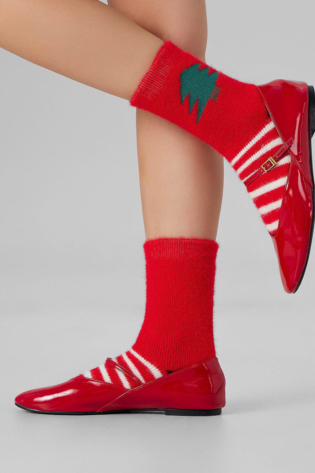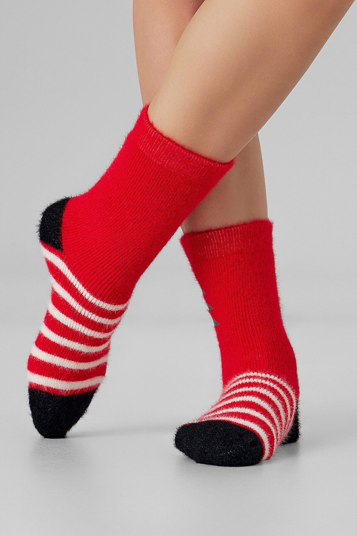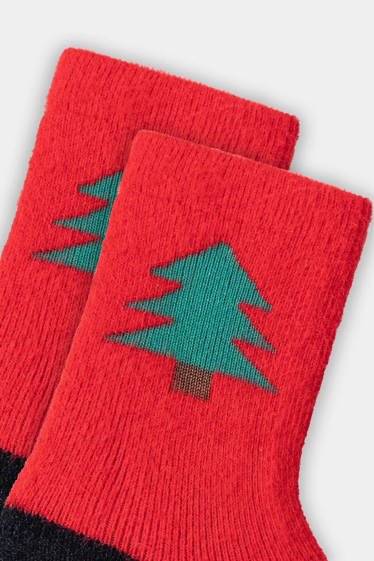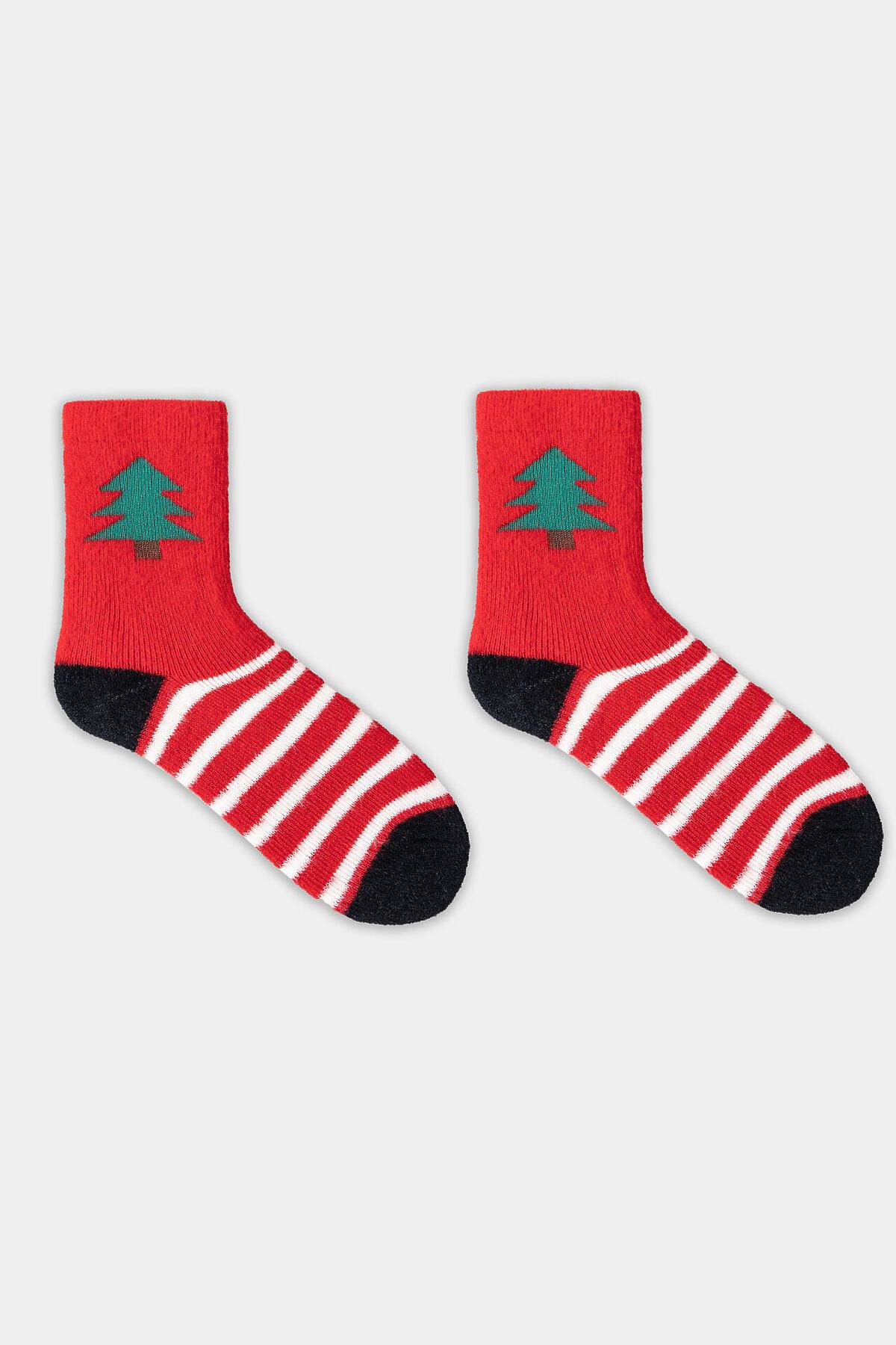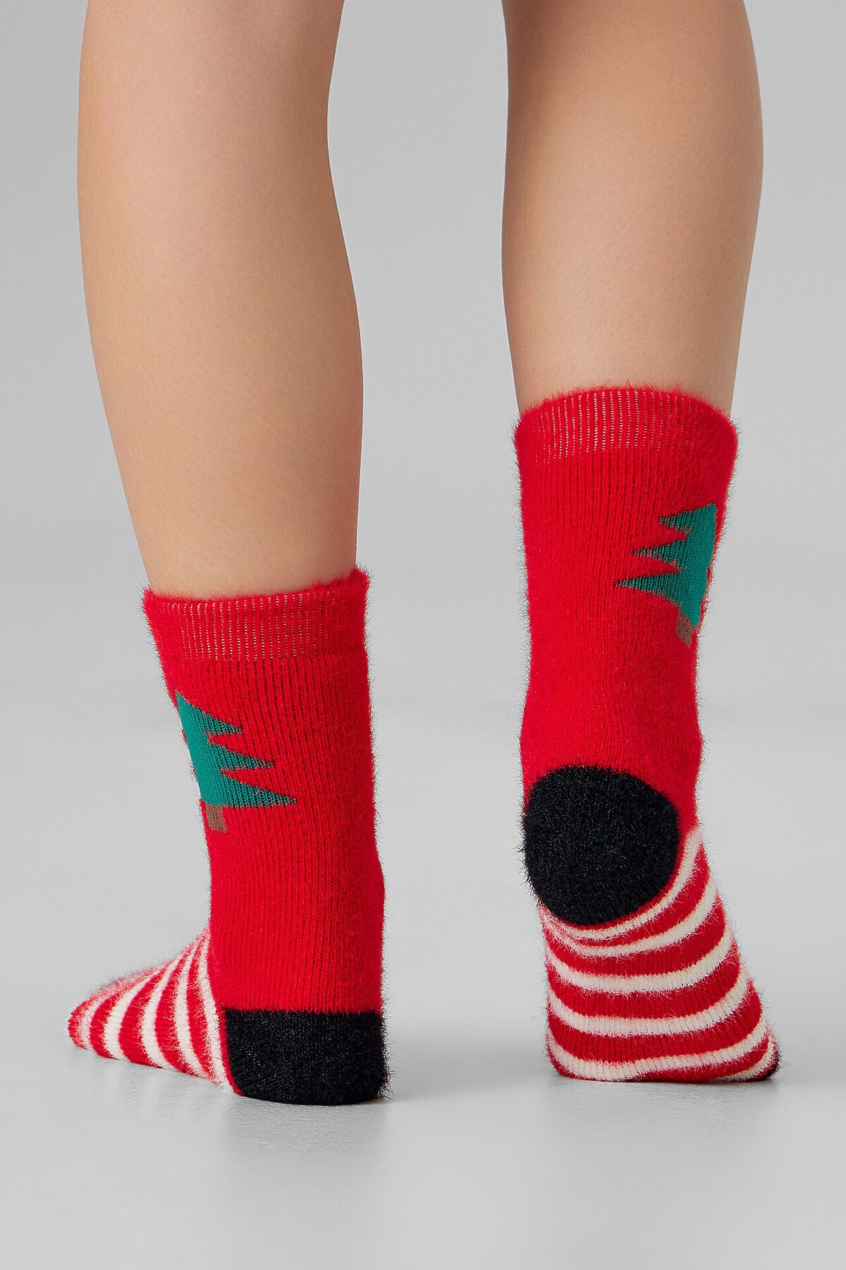 рис.3435 Женские, высокие, плюшевые носки из пушистой пряжи с рисунком в виде елки.
