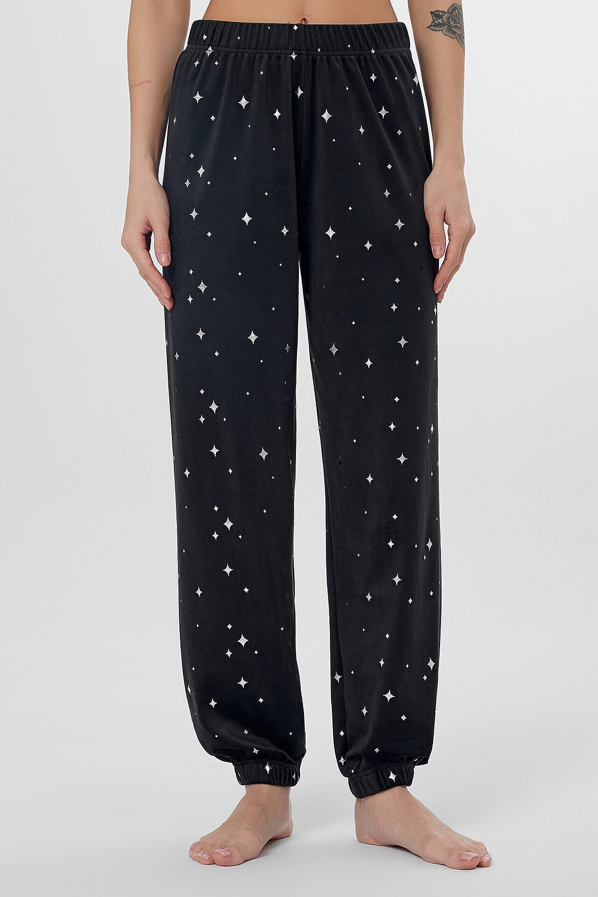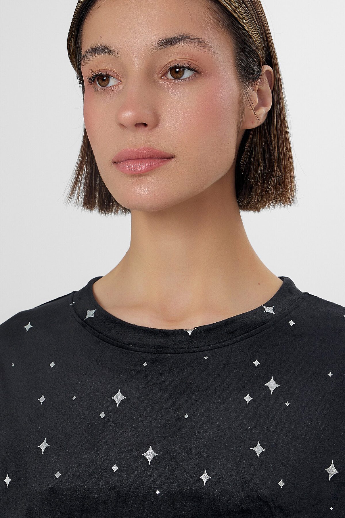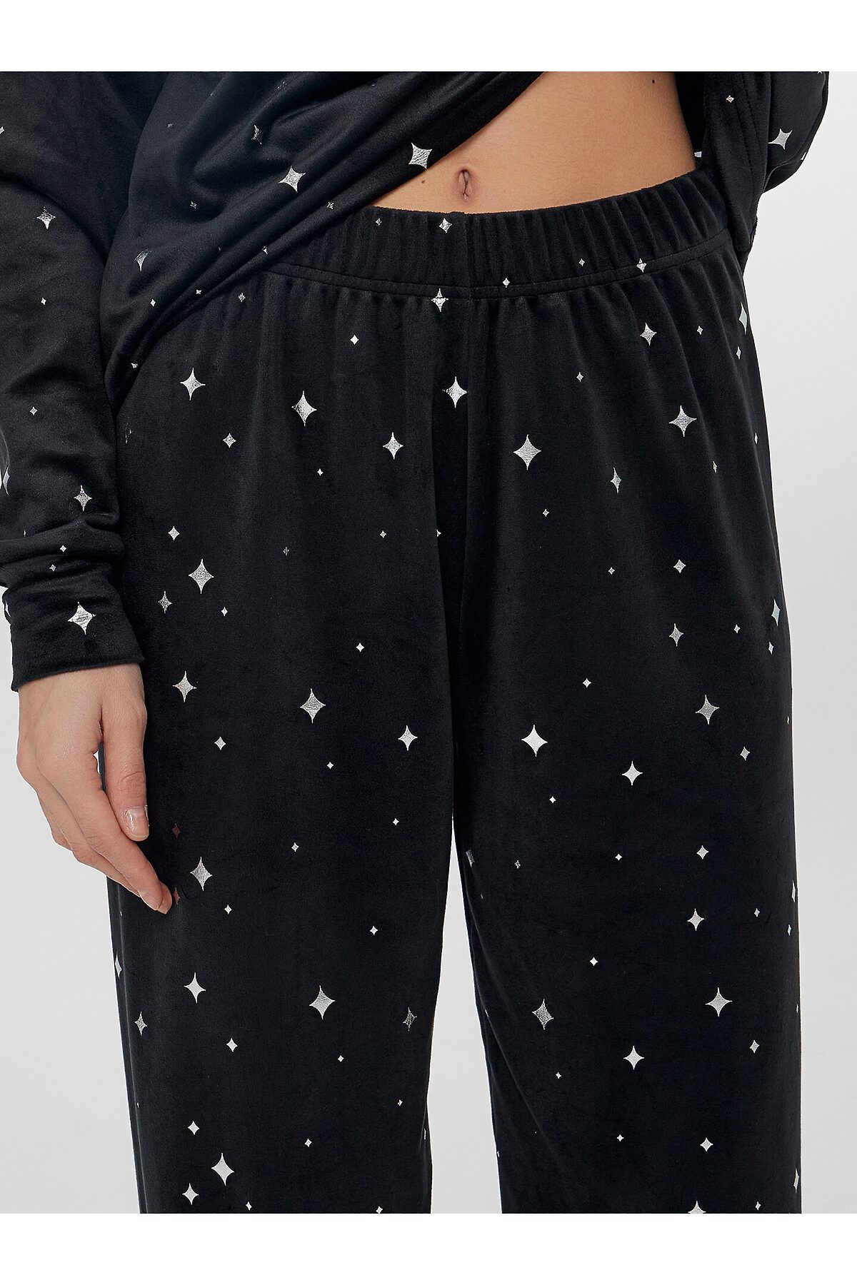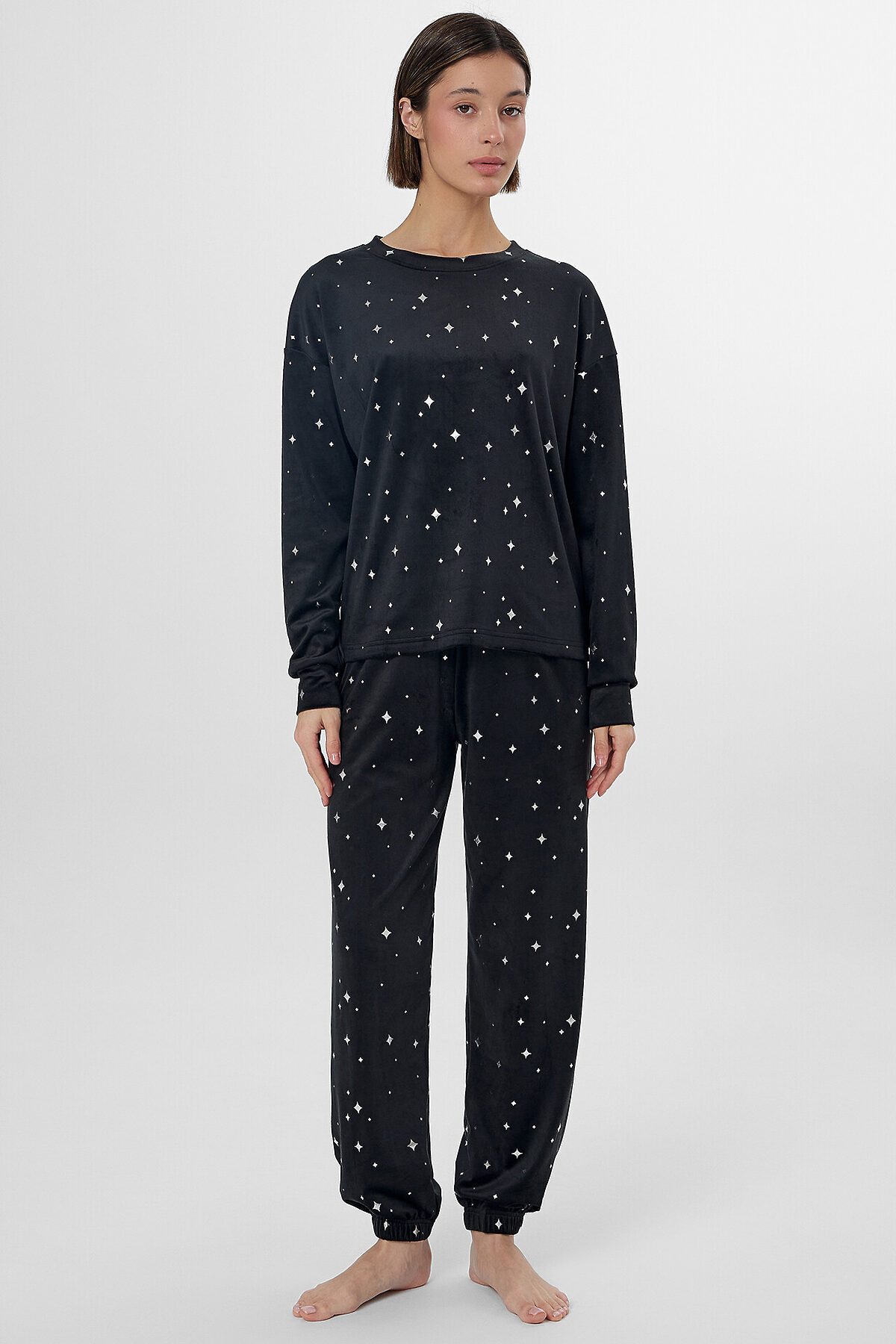 Комплект состоит из джемпера и брюк. Джемпер прямого силуэта. Горловина круглой формы, обработана обтачкой из основного полотна. Линия плеча спущена. Рукава длинные втачные . По низу рукавов отрезные манжеты из основного полотна. Низ джемпера обработан швом в подгибку на плоскошовной машине. Брюки прямые, свободные. Пояс цельнокроеный с эластичной тесьмой внутри (внутр. 40мм 40RV). По низу в шве подгибки эластичная тесьма (внутр. 30мм 30RV).