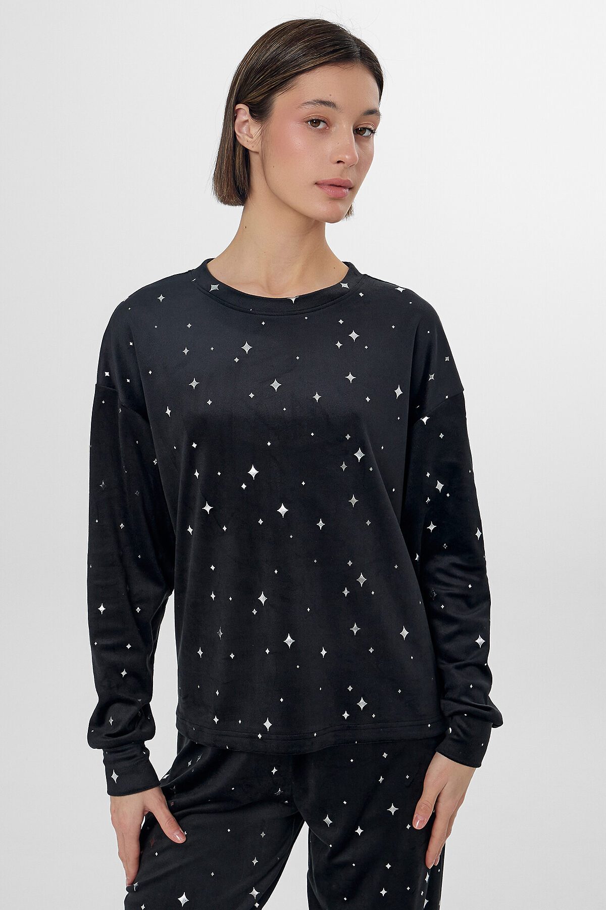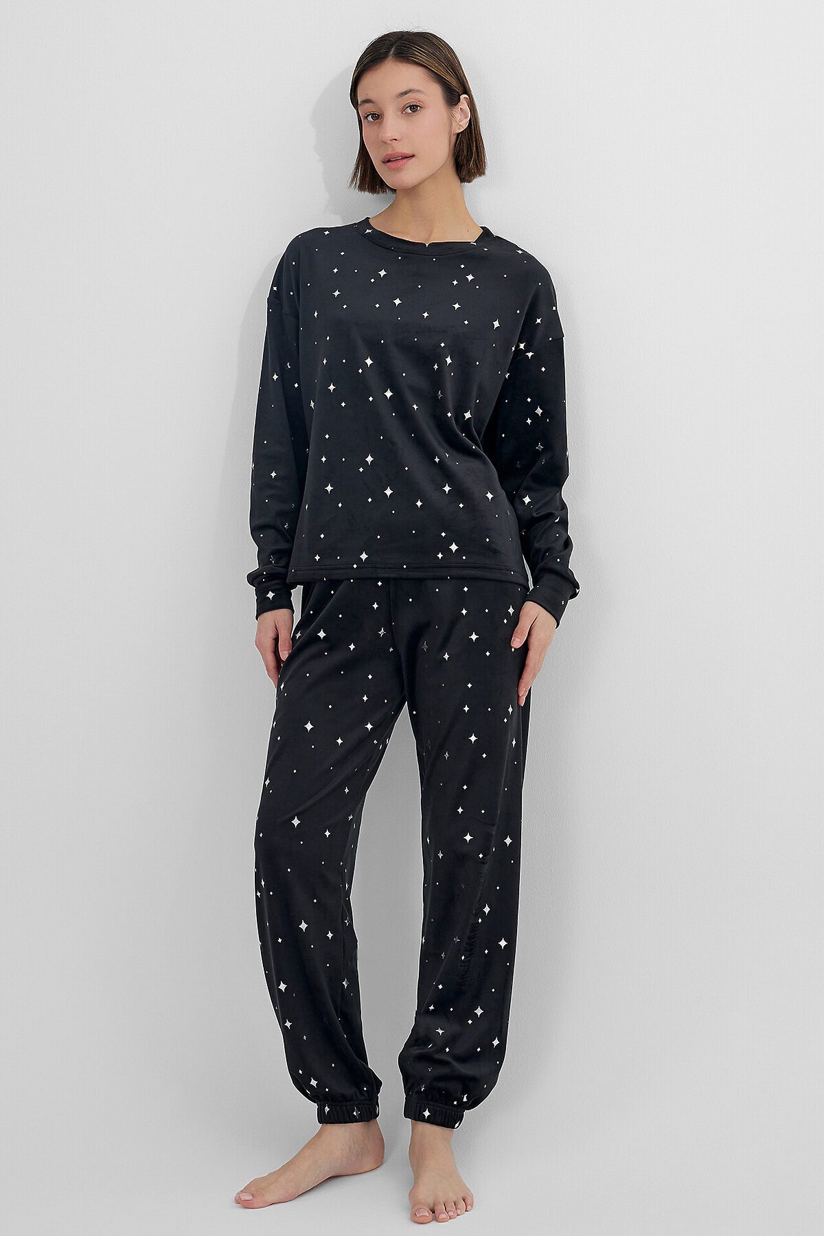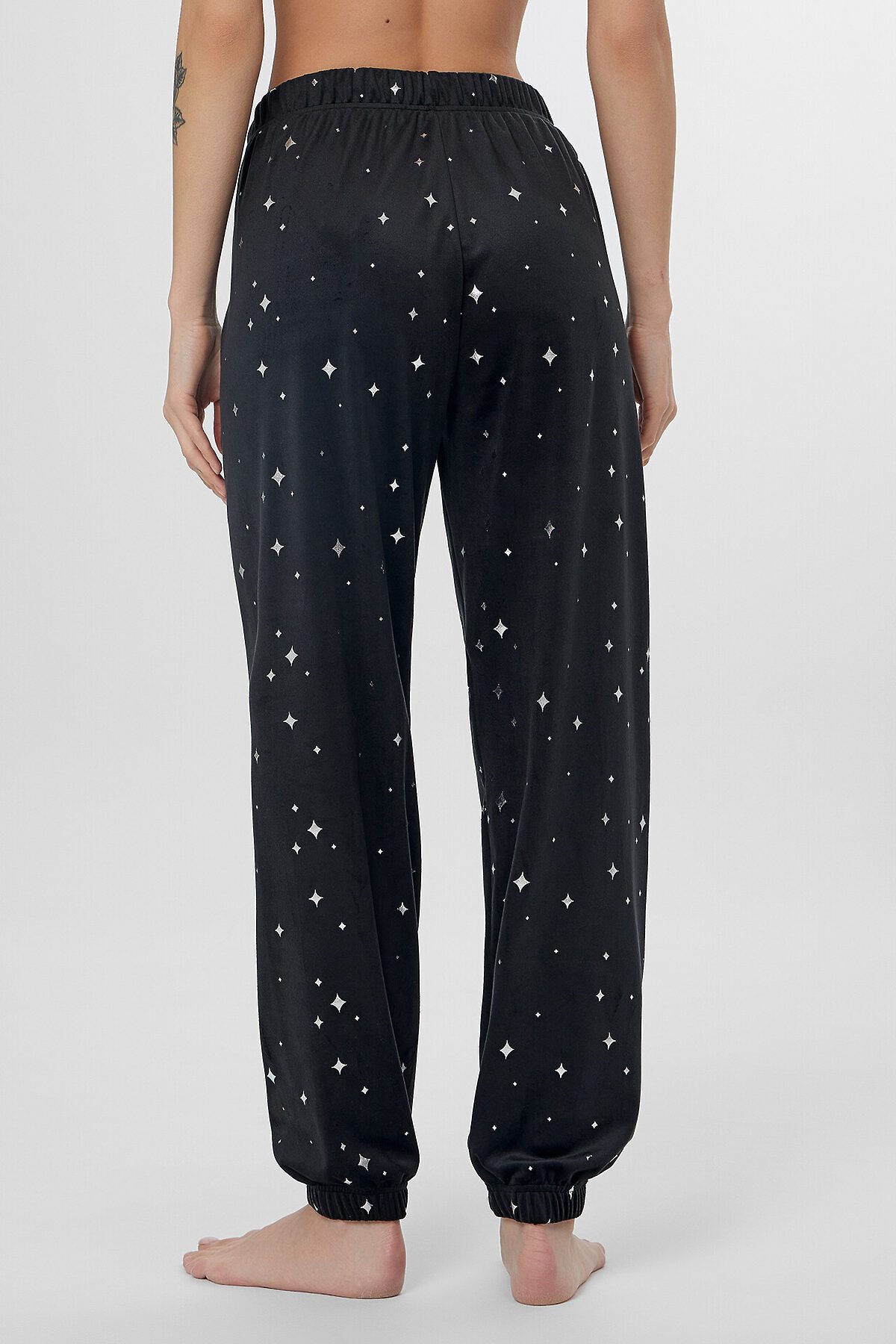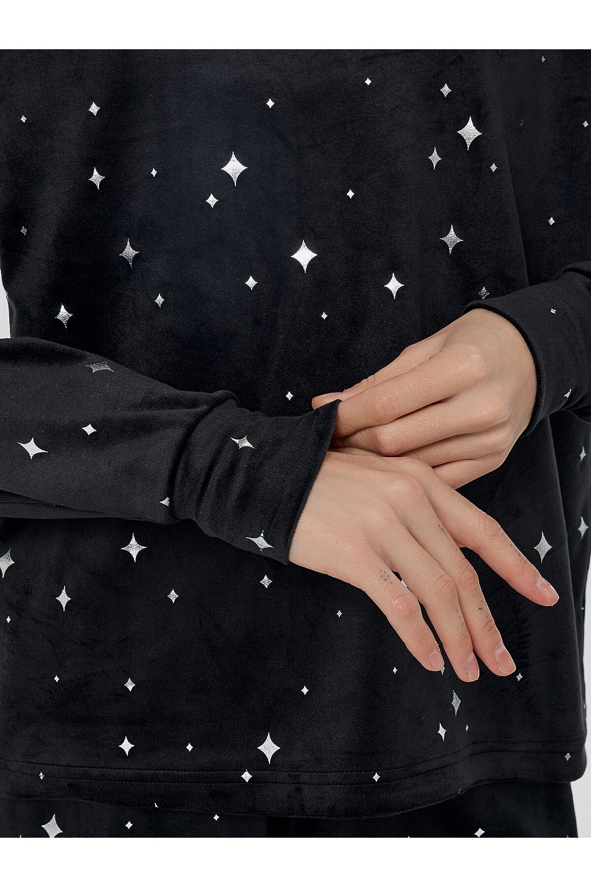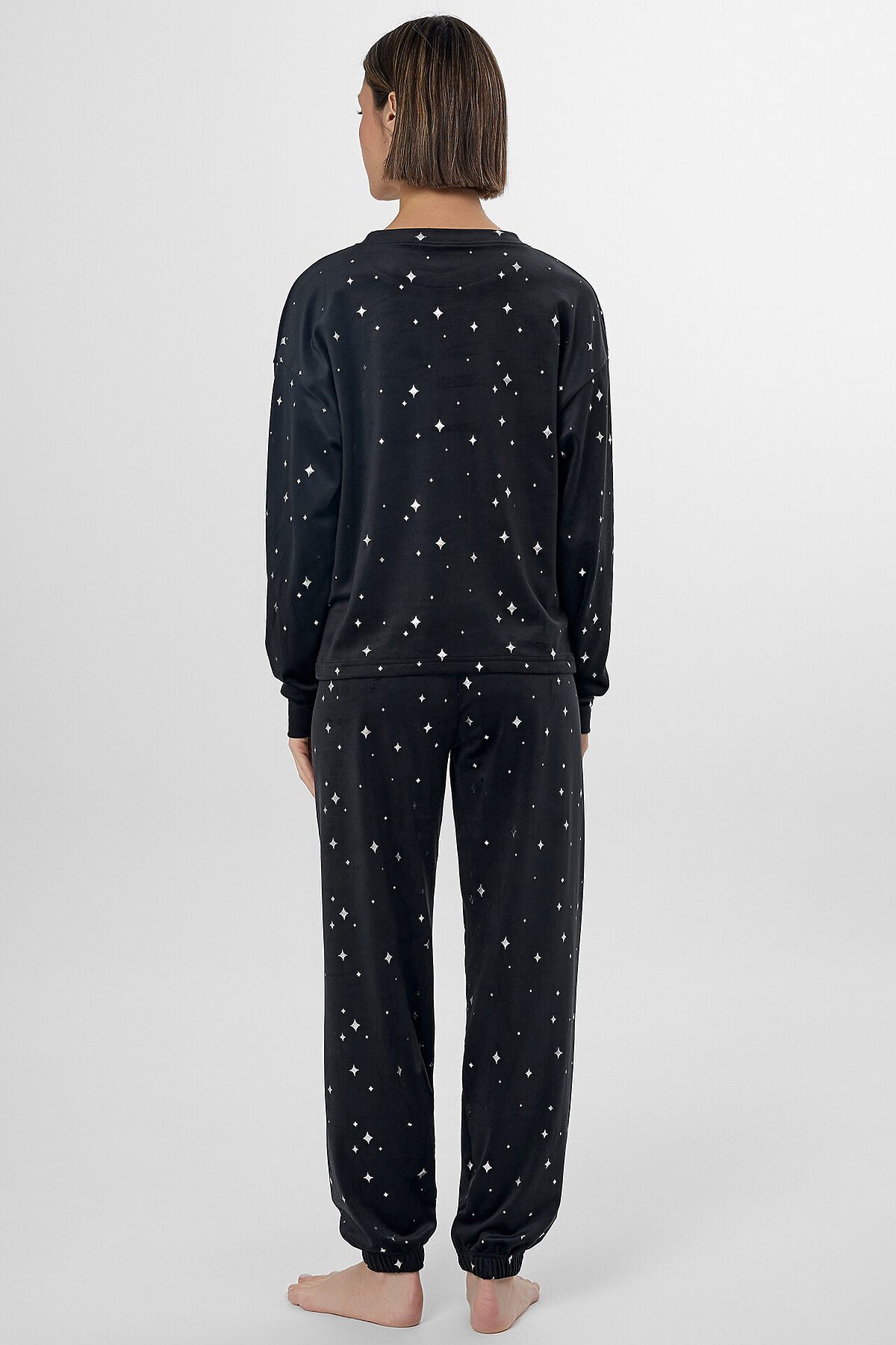 Комплект состоит из джемпера и брюк. Джемпер прямого силуэта. Горловина круглой формы, обработана обтачкой из основного полотна. Линия плеча спущена. Рукава длинные втачные . По низу рукавов отрезные манжеты из основного полотна. Низ джемпера обработан швом в подгибку на плоскошовной машине. Брюки прямые, свободные. Пояс цельнокроеный с эластичной тесьмой внутри (внутр. 40мм 40RV). По низу в шве подгибки эластичная тесьма (внутр. 30мм 30RV).