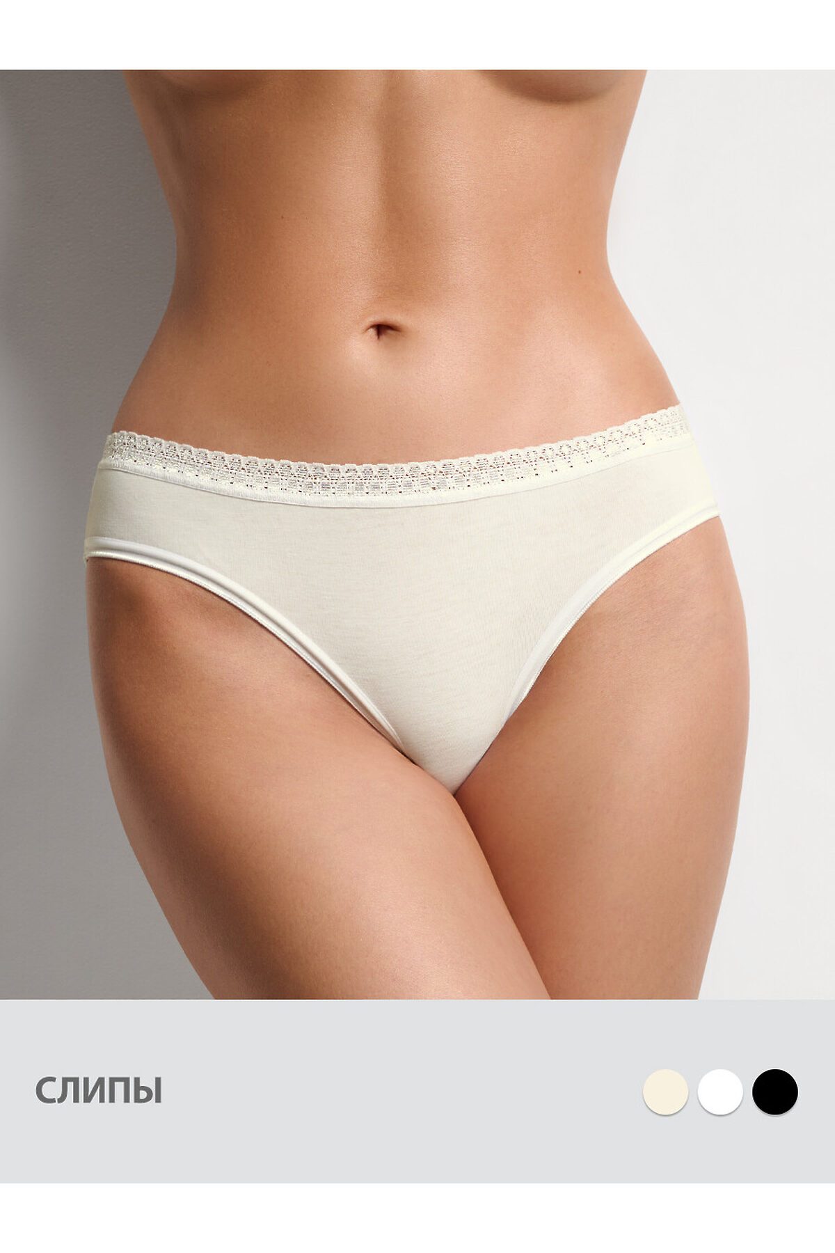 Трусы-слипы с классической посадкой из качественного хлопка с ажурной эластичной тесьмой по поясу, добавляющей модели женственности и изящества.