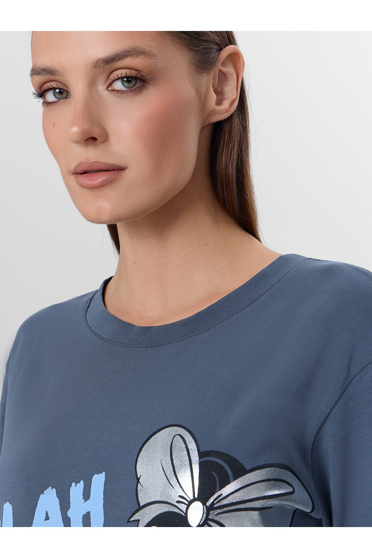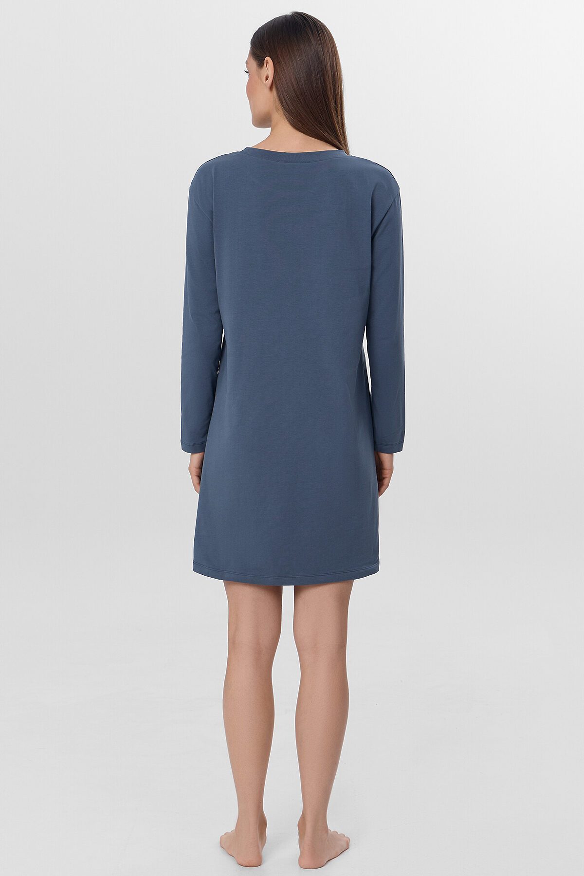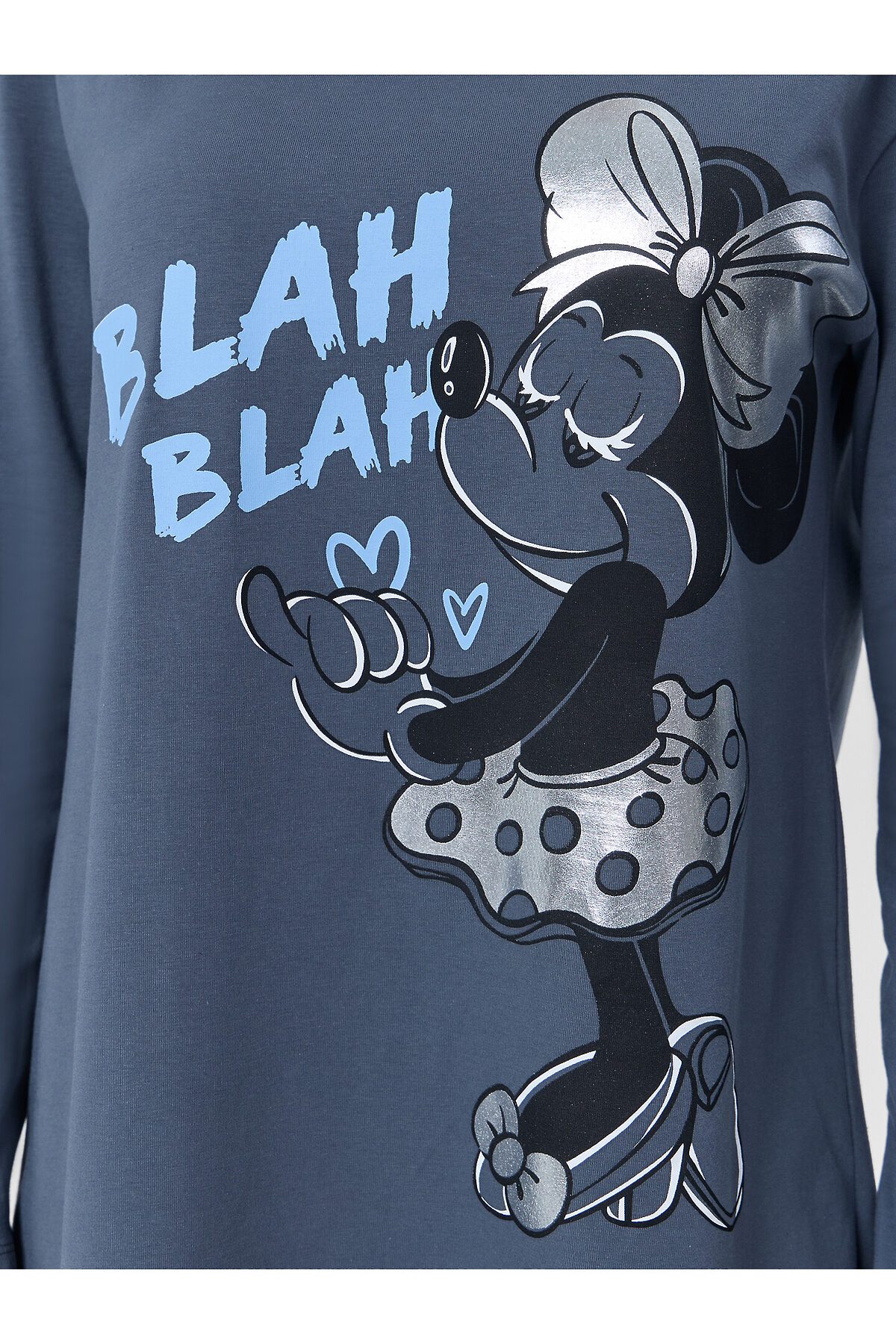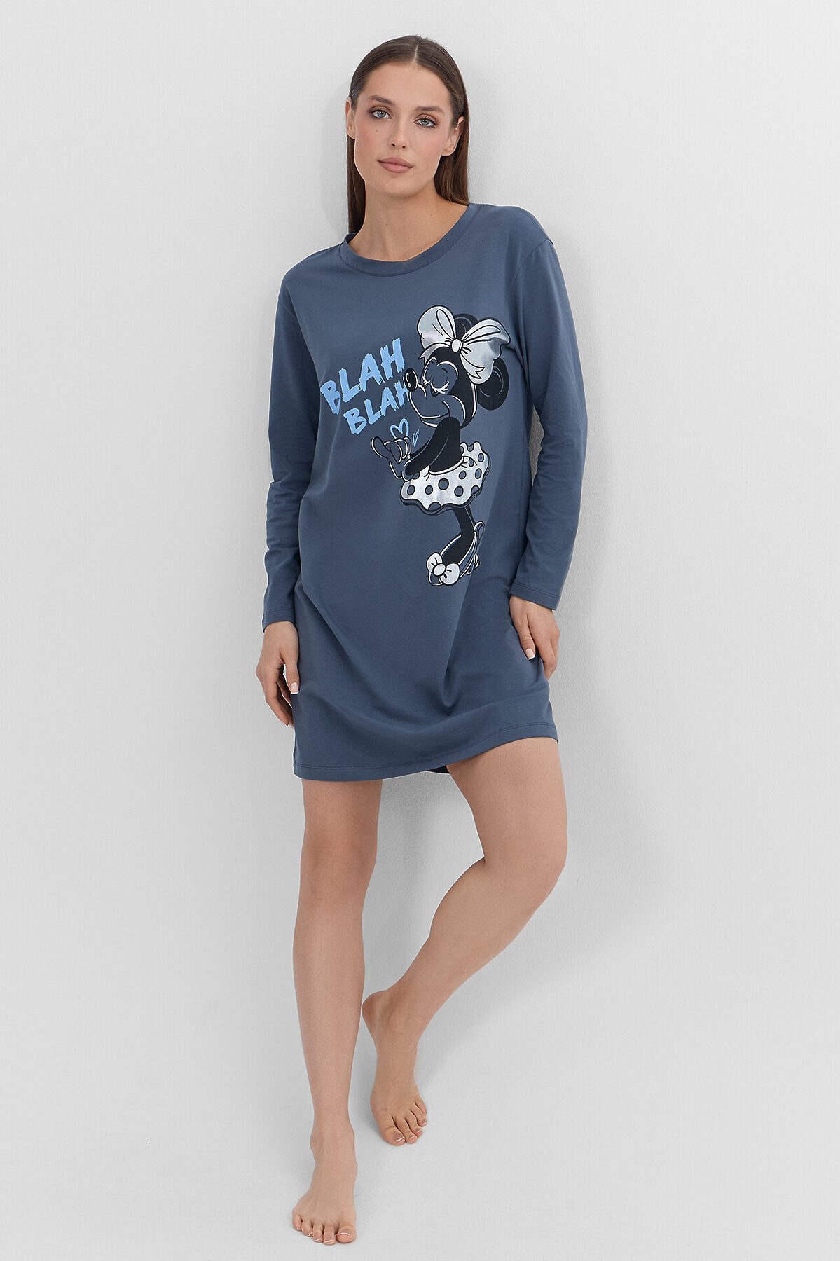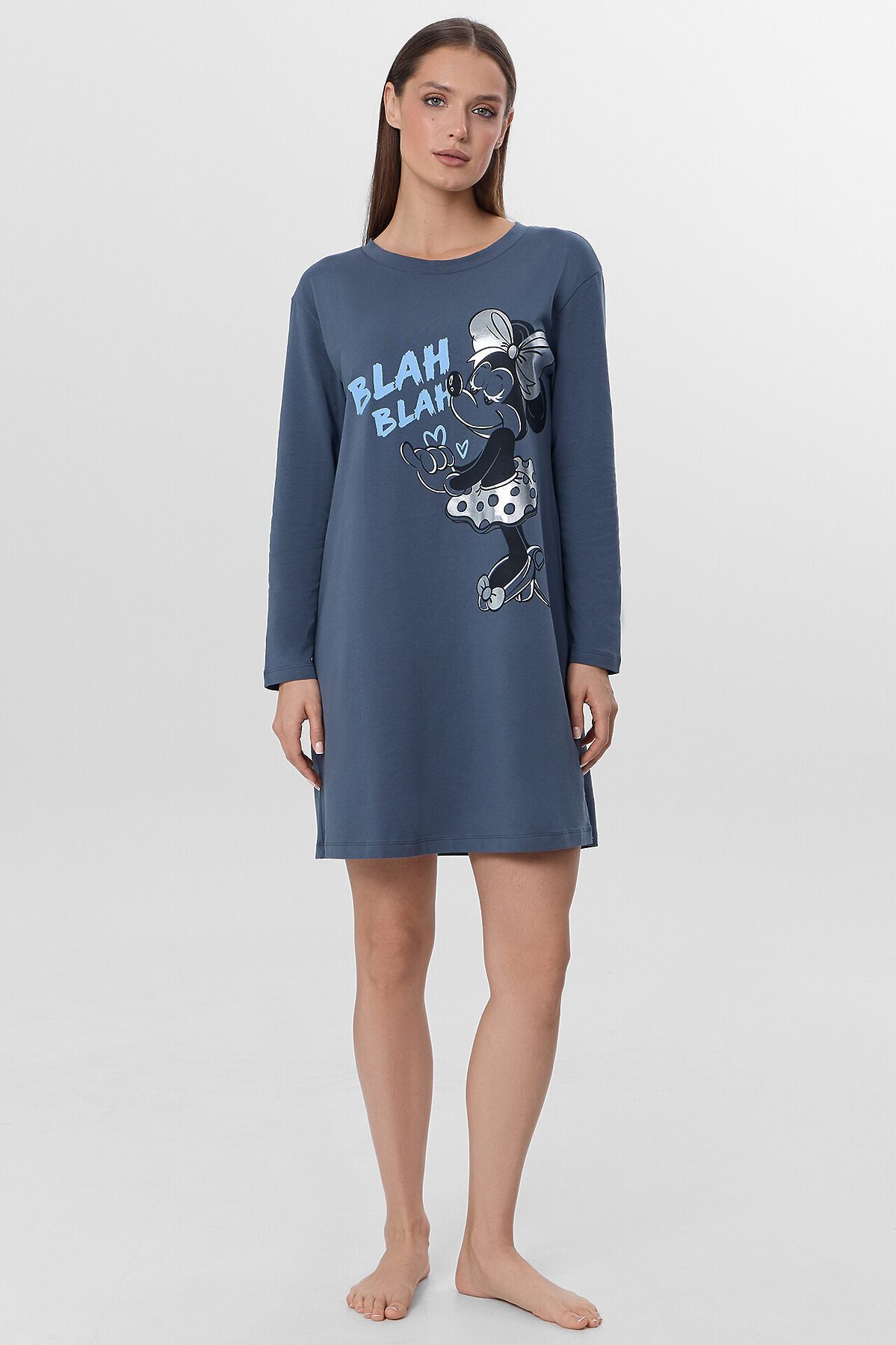Женское домашнее платье с надписью «Бла бла» и принтом Минни Маус создано для ежедневного комфорта и домашнего настроения. Свободный крой дарит легкость и свободу движений, позволяя чувствовать себя уютно в любой ситуации — от утренней чашки кофе до вечернего отдыха. Круглая горловина и длинные рукава со слегка спущенной линией плеч формируют мягкий силуэт, располагающий к отдыху. Аккуратная обработка рукавов и низа обеспечивает аккуратный вид и сохранение формы.