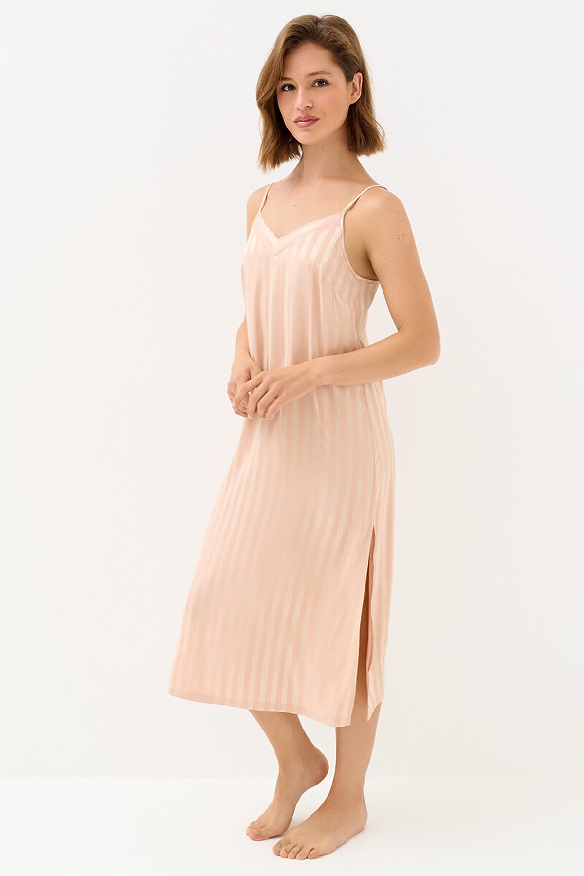 Женская длинная сорочка в полоску с V-образным вырезом, однотонным кантом, регулируемыми бретелями и разрезом слева. Изготовлена из гладкого и лёгкого искусственного шёлка, который приятно ощущается на теле и хорошо сохраняет форму. Деликатная обработка краёв обеспечивает дополнительный комфорт. Современная интерпретация домашней классики — стильная и эффектная повседневная сорочка, которая грациозно струится по фигуре и изящно подчёркивает силуэт.