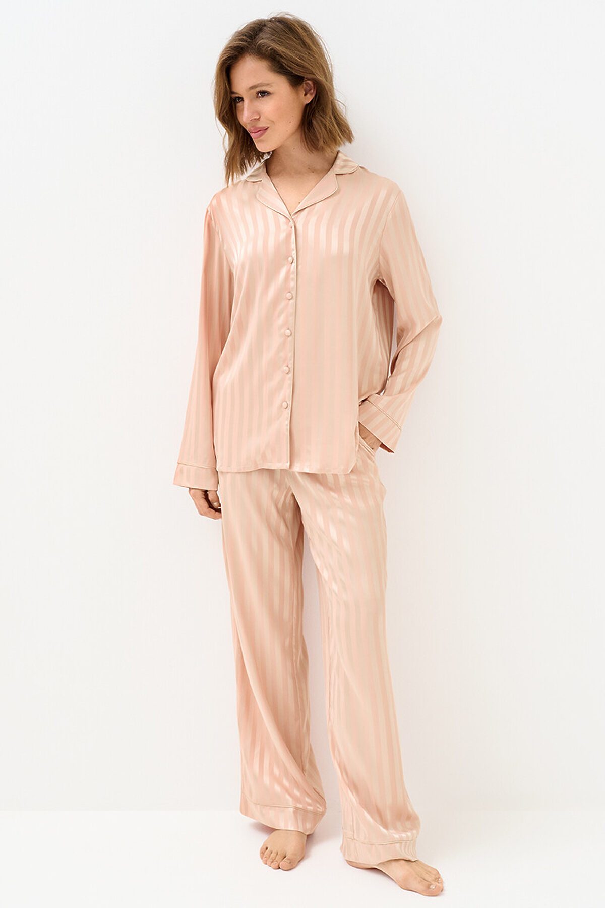 Женская пижама в полоску: рубашка на пуговицах с длинными рукавами и отложным воротником, с однотонным кантом и манжетами; прямые брюки с поясом на резинке, боковыми карманами и манжетами с однотонным кантом. Изготовлена из гладкого и лёгкого искусственного шёлка, который приятно ощущается на теле и хорошо сохраняет форму. Деликатная обработка краёв обеспечивает дополнительный комфорт. Воплощение элегантности в домашнем формате: расслабленный силуэт, благородное сияние ткани и лаконичный принт. Отлично подходит для дома и сна.