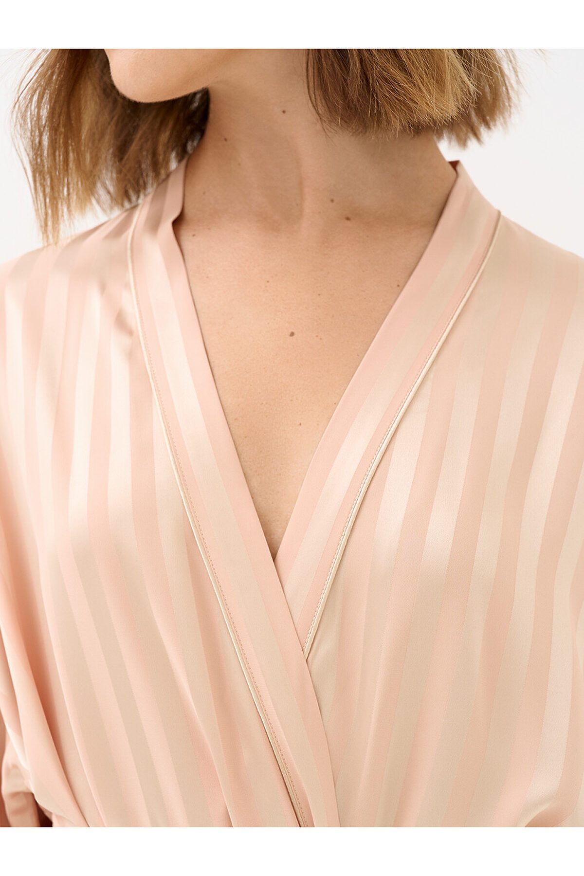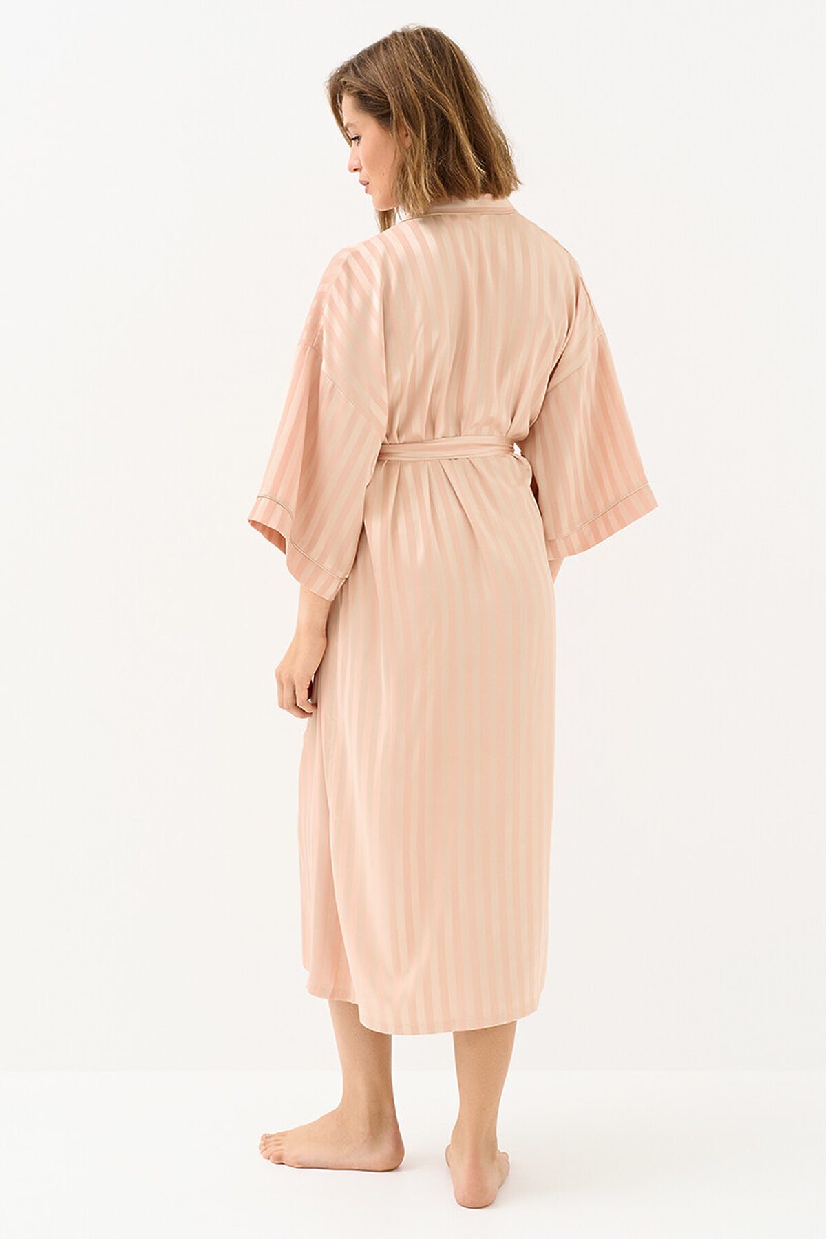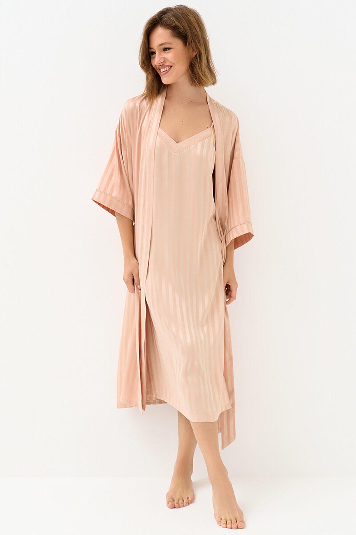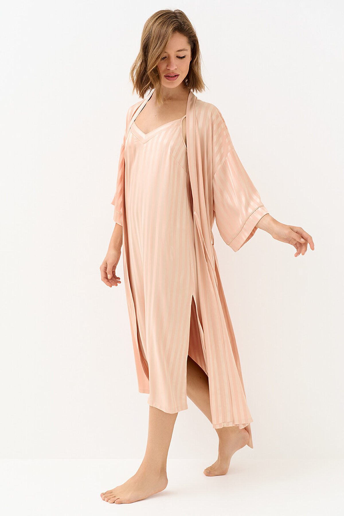 Женский длинный халат на поясе с лаконичным принтом в полоску и широкими рукавами ¾. Изготовлен из гладкого и лёгкого искусственного шёлка, который приятно ощущается на теле и хорошо сохраняет форму. Деликатная обработка краёв обеспечивает дополнительный комфорт. Удобный и стильный халат свободного кроя — идеальный выбор на каждый день.