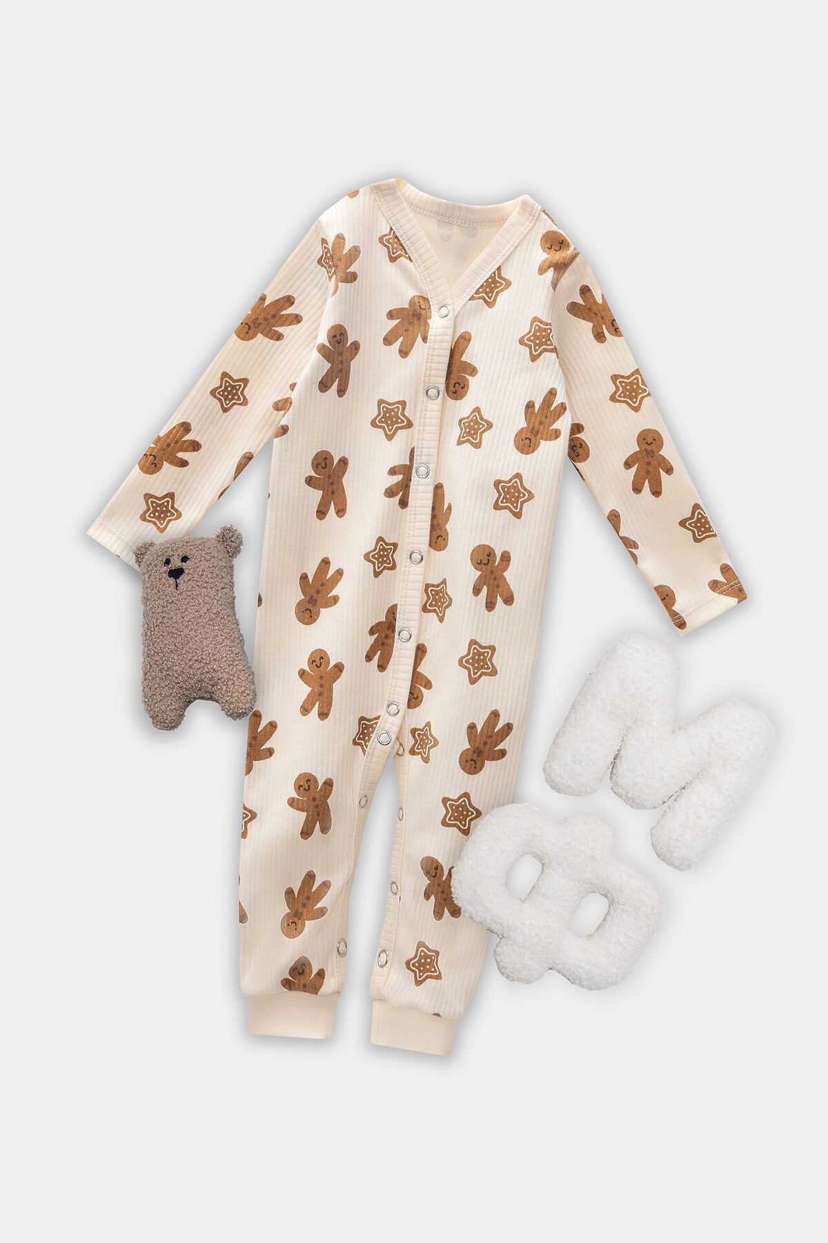 Комбинезон выполнен из из интерлока в рубчик. Спинка цельнокроенная. Перед с застежкой по всей длине и по обеим ножкам. Застежка на книпперах 9 мм- 14 шт. Рукава длинные, втачные, одношовные. Низ рукавов обработан на 2х игольной плоскошовной машине швом в подгибку. Срезы горловины и бортов обработаны обтачками из основного полотна. По низу ножек притачные манжеты из из трикотажной рибаны 1*1 R-59, R11-049.01.230, 97% хлопок; 3% эластан, 230 гр, 165 см