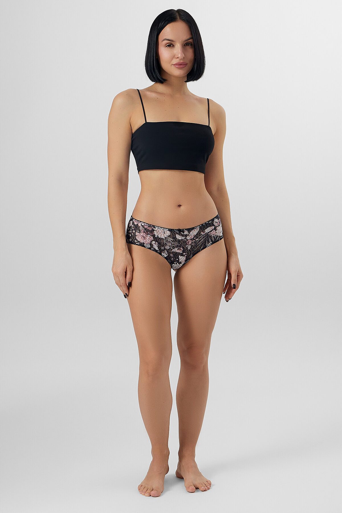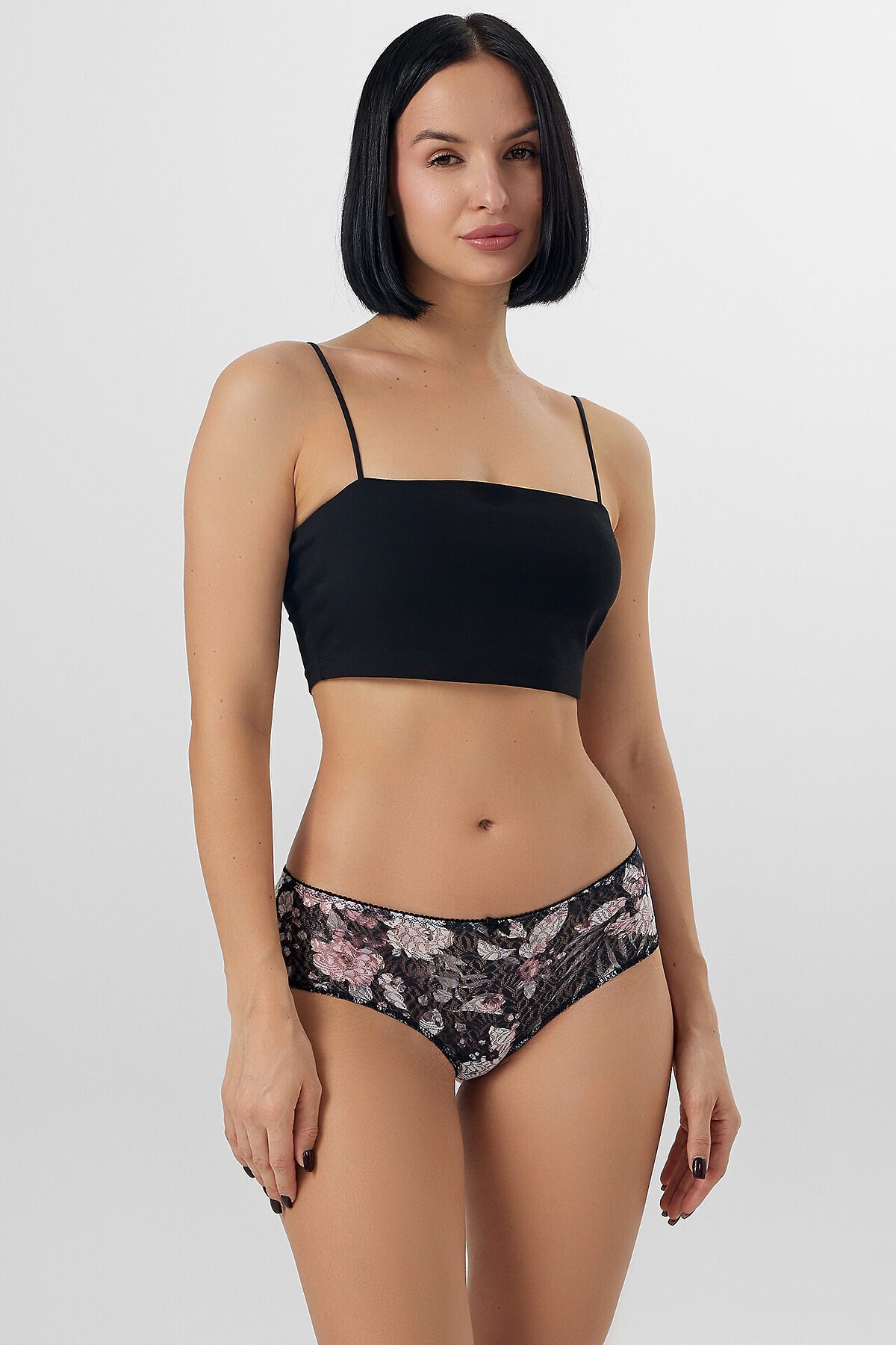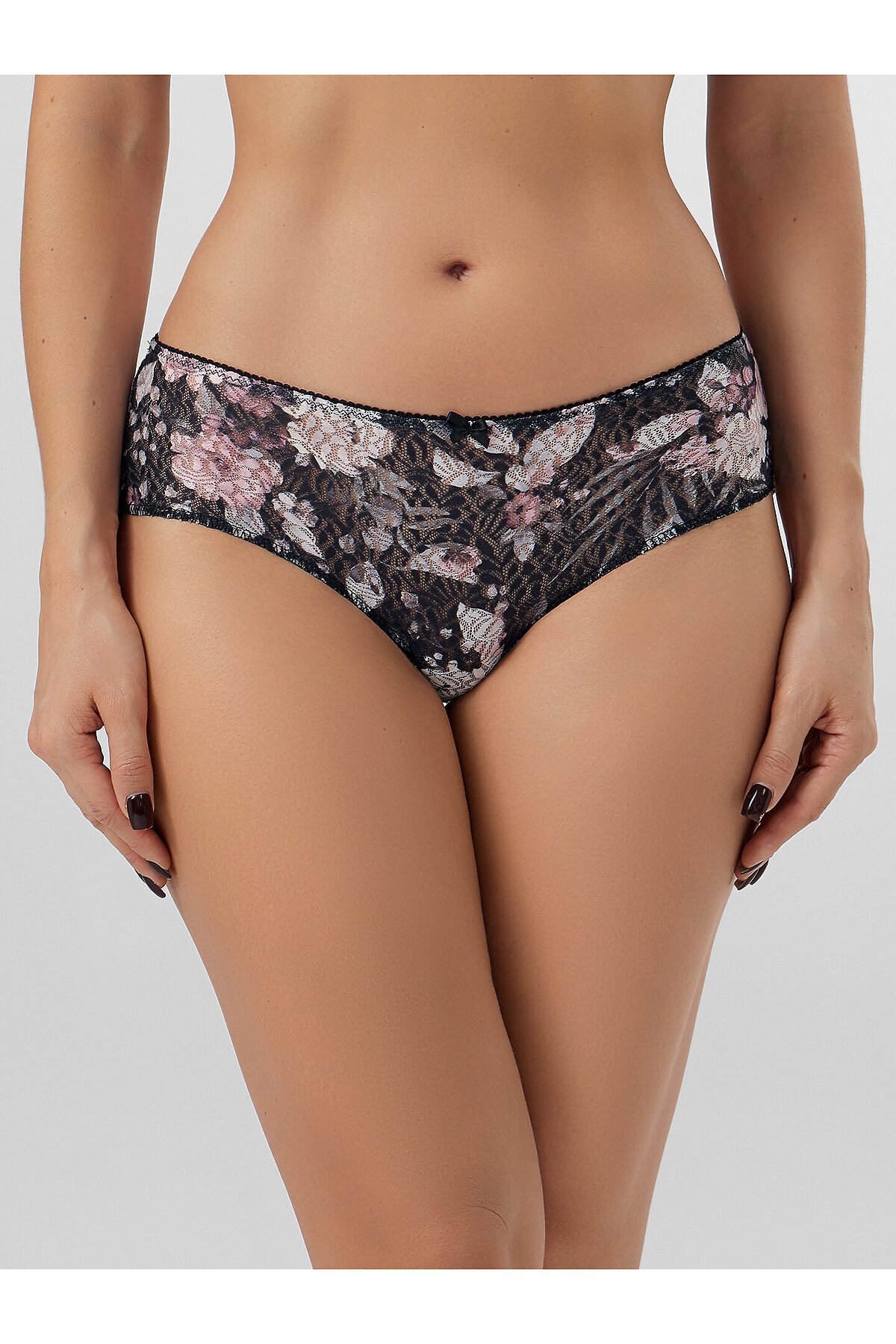 Трусы женские, средняя линия талии, шорты. Передняя деталь выполнена из кружевного полотна. Задние детали выполнены из кружева. Подкладка ластовицы из хлопка, отлетная по верхнему срезу. Верхний срез обработан тесьмой с зубом. Нижние срезы передней детали обработаны жилкой.