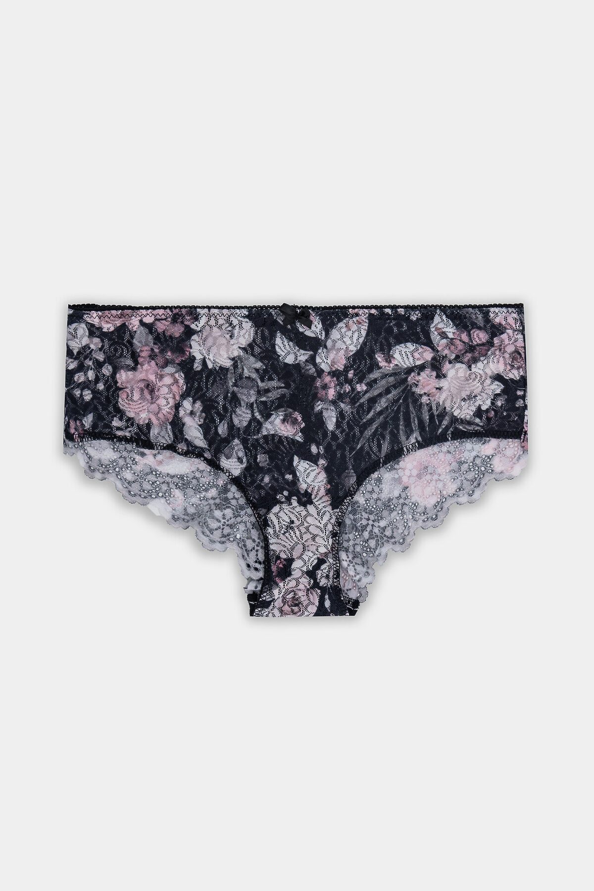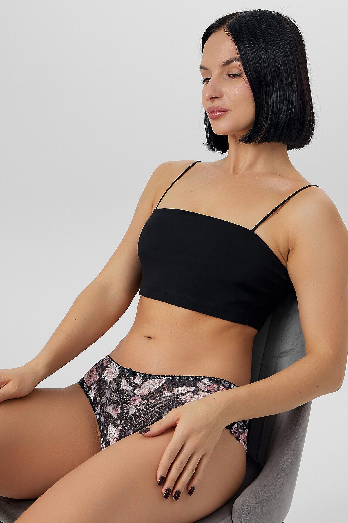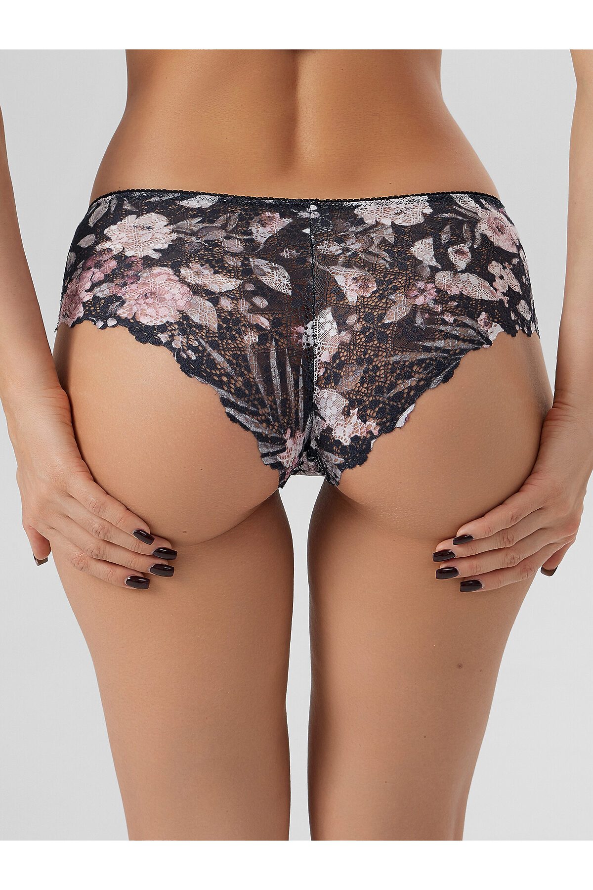 Трусы женские, средняя линия талии, шорты. Передняя деталь выполнена из кружевного полотна. Задние детали выполнены из кружева. Подкладка ластовицы из хлопка, отлетная по верхнему срезу. Верхний срез обработан тесьмой с зубом. Нижние срезы передней детали обработаны жилкой.