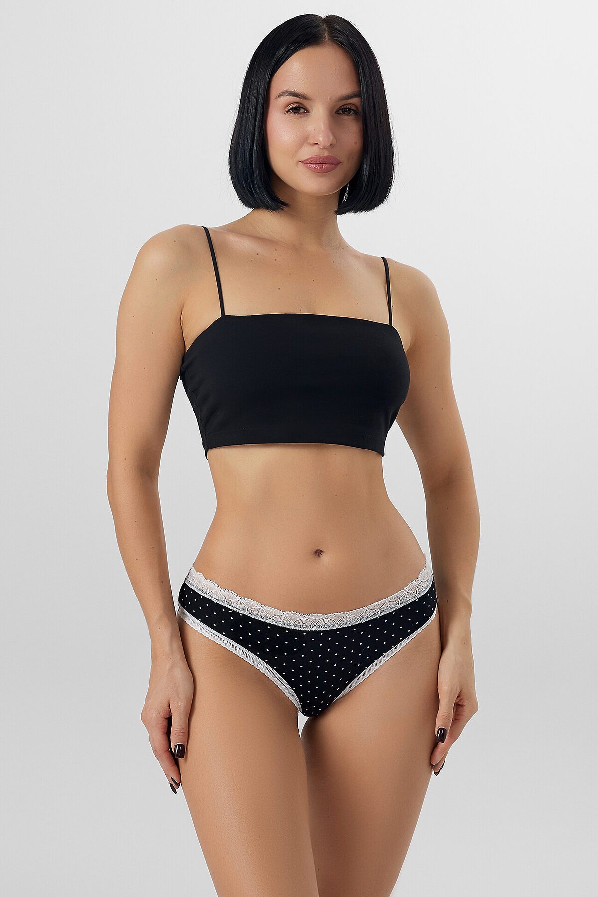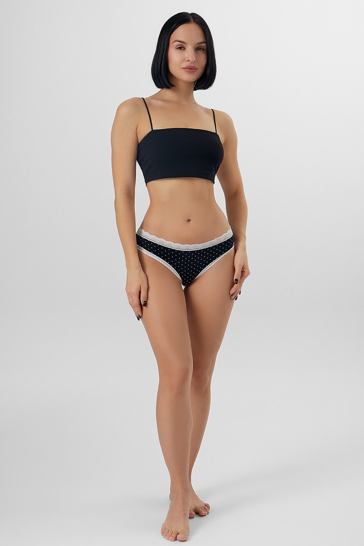 Трусы женские бразаилиана со средней посадкой из кулирки. Передняя деталь цельная. Нижние срезы обработаны эластичной тесьмой 14 мм (декоративная Dt12-14, девсел 1294К) на п/ш машине. Нижняя ластовица отлетная по переднему срезу, выполнена из основного полотна. По талии эл. тесьма 30мм (декоративная эл. девсел Tk0030743) настрочена на плоскошовной машине.