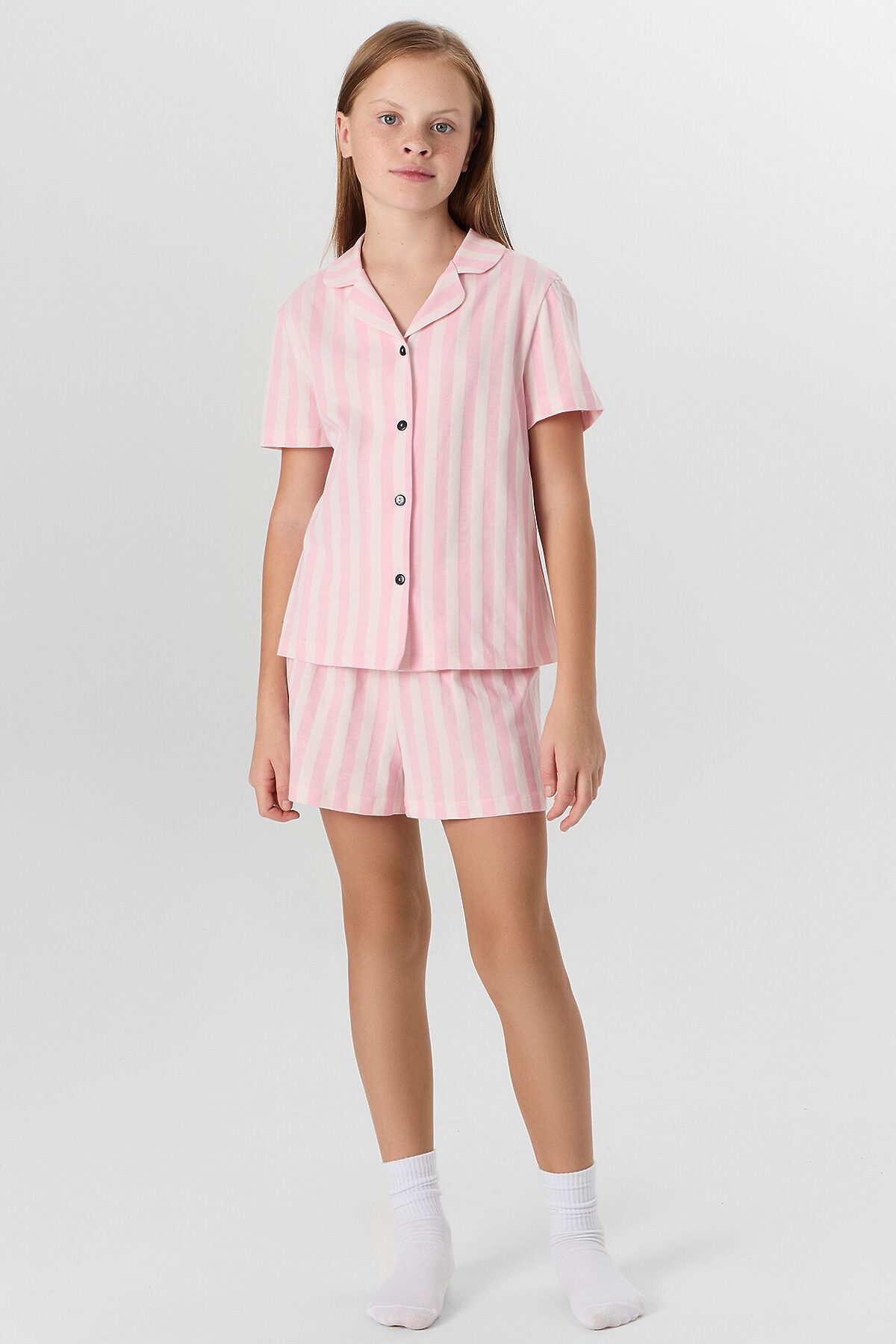 Комплект состоит из рубашки и шорт. Рубашка прямого силуэта, с отложным воротником, спинка цельнокроеная. Плечо слегка спущено. Рукав втачной, одношовный, короткий. Центральная застежка на пуговицы. Шорты слегка расширены к низу. Пояс цельнокроеный с эластичной тесьмой внутри. Низ застрочен швом в подгибку.