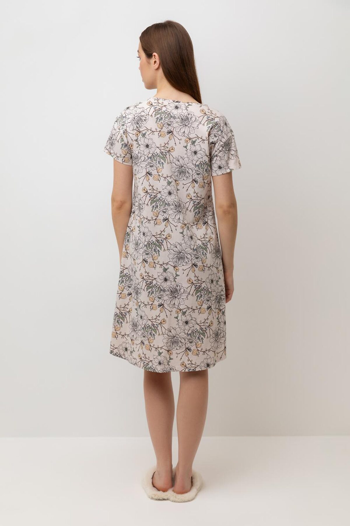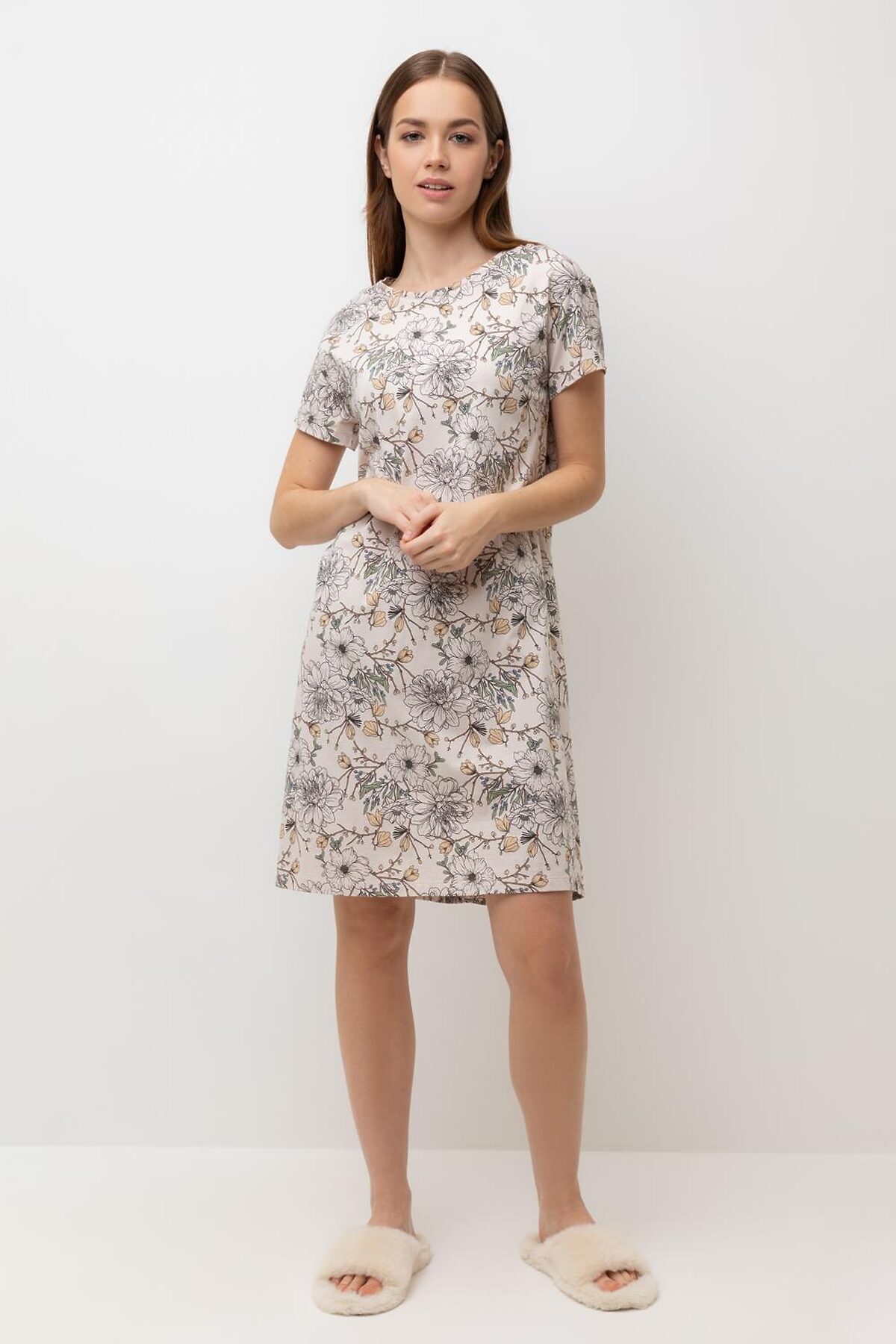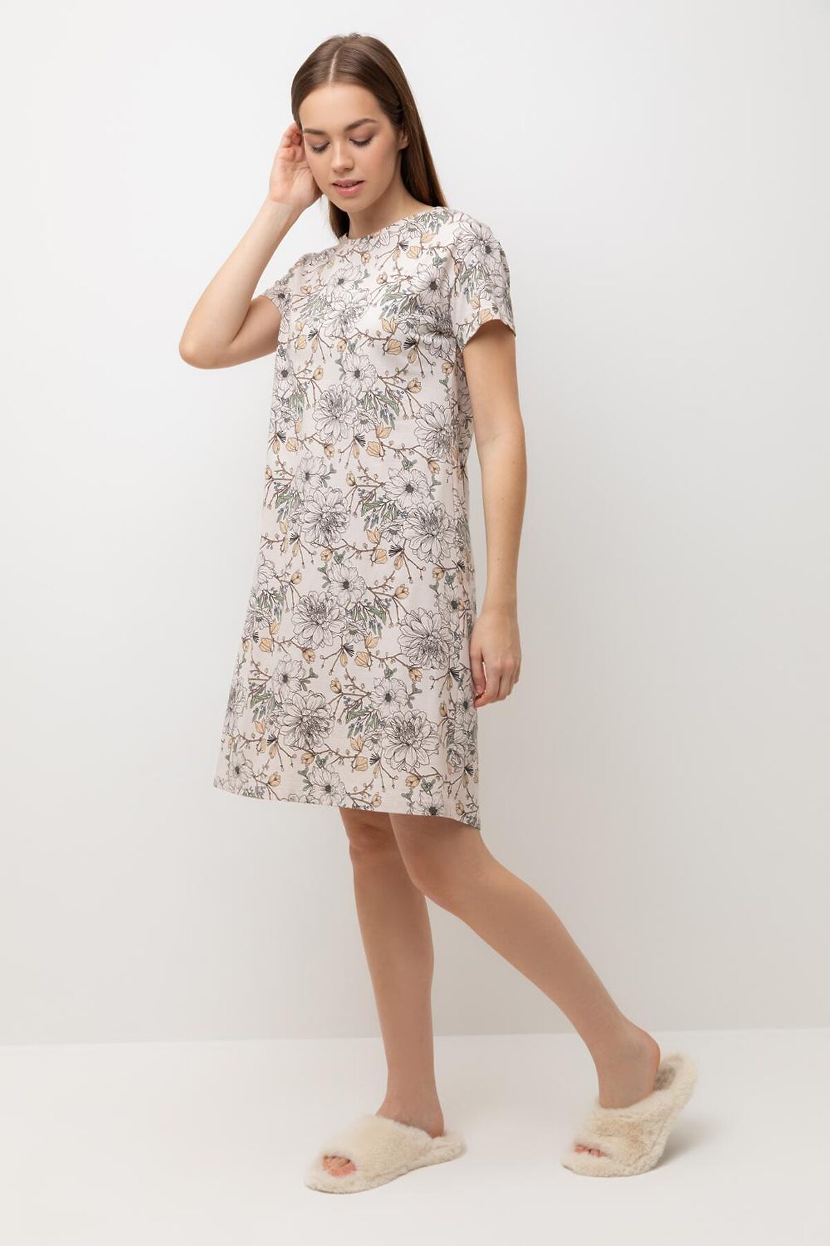 Уютная удлиненная сорочка с короткими рукавами из 100% натурального хлопка. Выполнена из набивного трикотажа супрем с нежным рисунком. Все трикотажные полотна производятся в соответствии с нормами Швейцарского сертификата ЭкоТекс. Сделано в Узбекистане. - 100% натуральный хлопок - гипоаллергенные красители - комфортная посадка