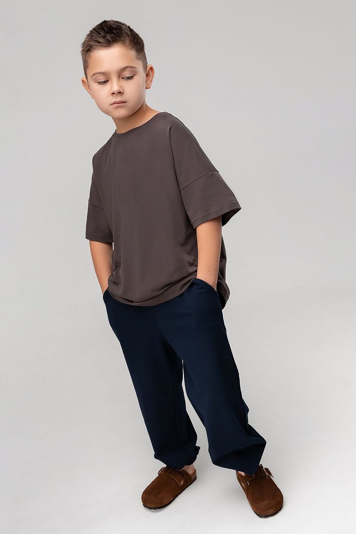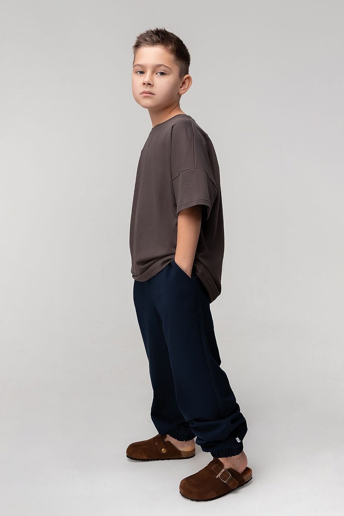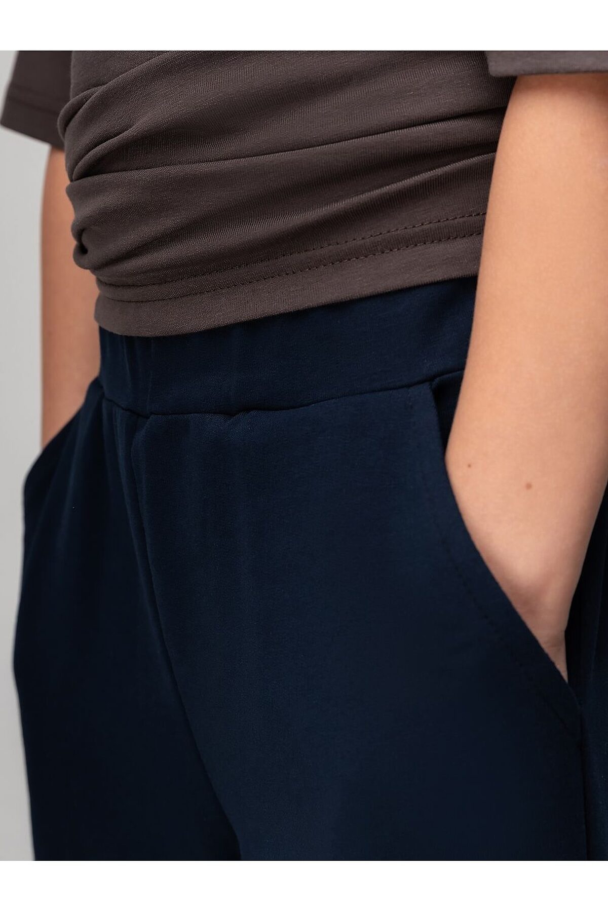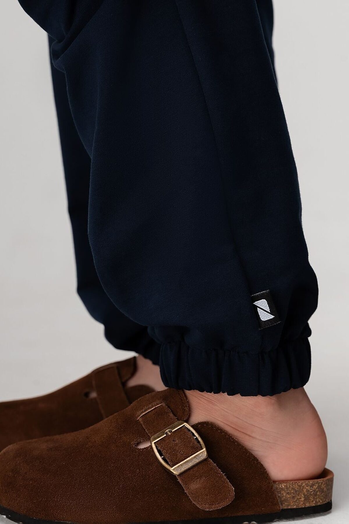 Свобоные брюки, низ с манжетой на резинке. Брюки с боковыми карманами, пояс с внутренней резинкой.
