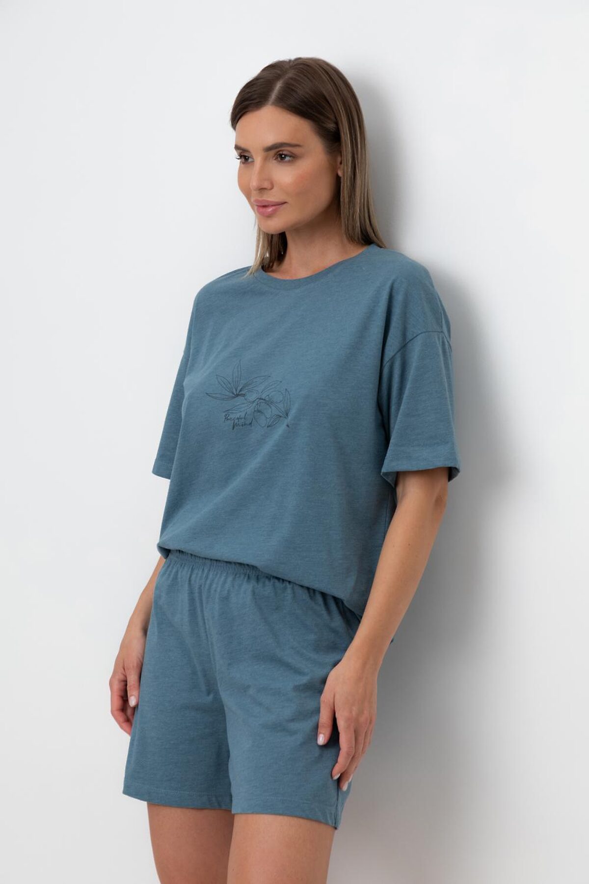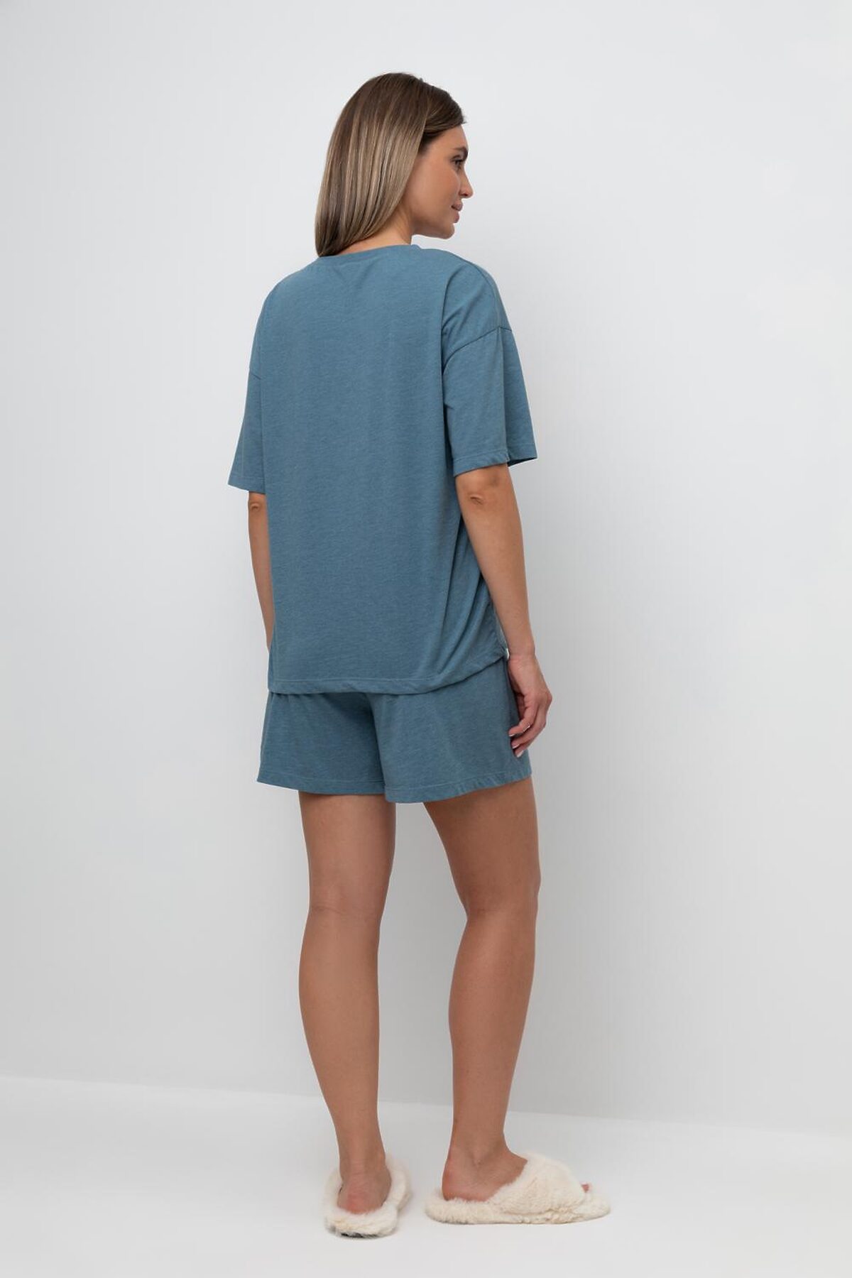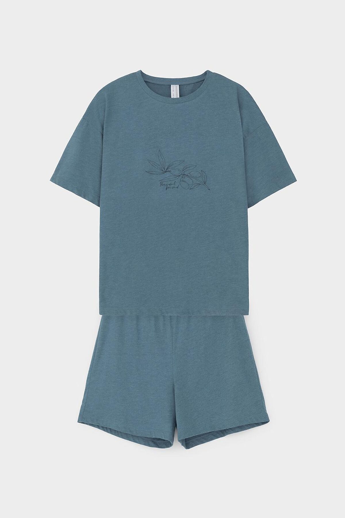 Комплект для комфортного сна и отдыха. Футболка с короткими рукавами, спущенной линией плеча и принтом комфортно садится по фигуре. Шорты с мягким поясом на резинке. В поясе шорт атласная лента. Свободный силуэт не сковывает движения. Все трикотажные полотна производятся в соответствии с нормами Швейцарского сертификата ЭкоТекс. Сделано в Узбекистане - 50% натуральный хлопок, 50% п/э - комфортная посадка - гипоаллергенные красители - эффект меланжа