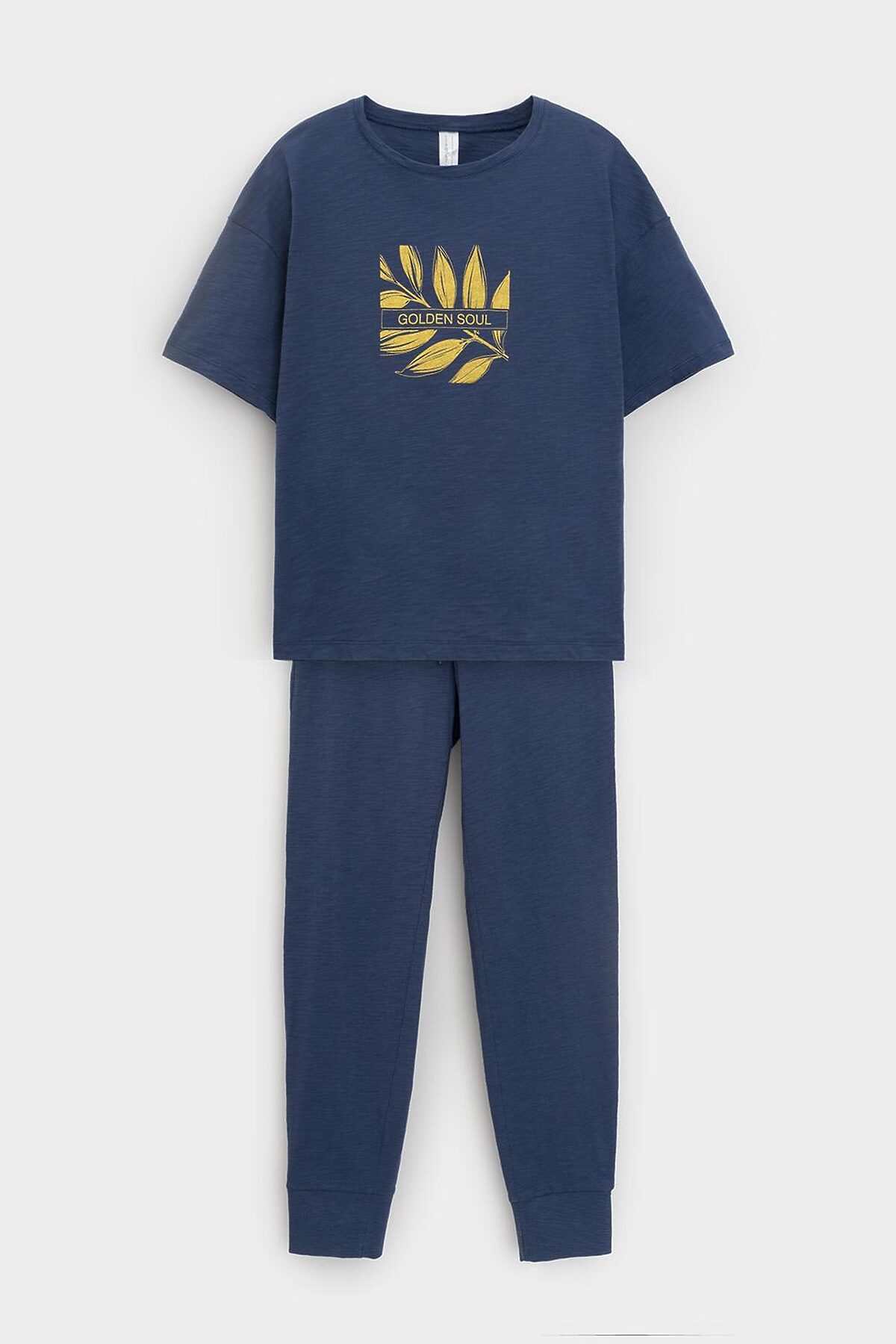 Легкий комплект для комфортного сна и отдыха из меланжевого трикотажа. Футболка с принтом и спущенной линией плеча комфортно садится по фигуре. Брюки с эластичными манжетами с боковыми карманами. Круглый шнур позволяет регулировать посадку. Гладкий материал приятен к телу и позволяет коже дышать. Все трикотажные полотна производятся в соответствии с нормами Швейцарского сертификата ЭкоТекс. Сделано в Узбекистане - комфортная посадка - гипоаллергенные красители