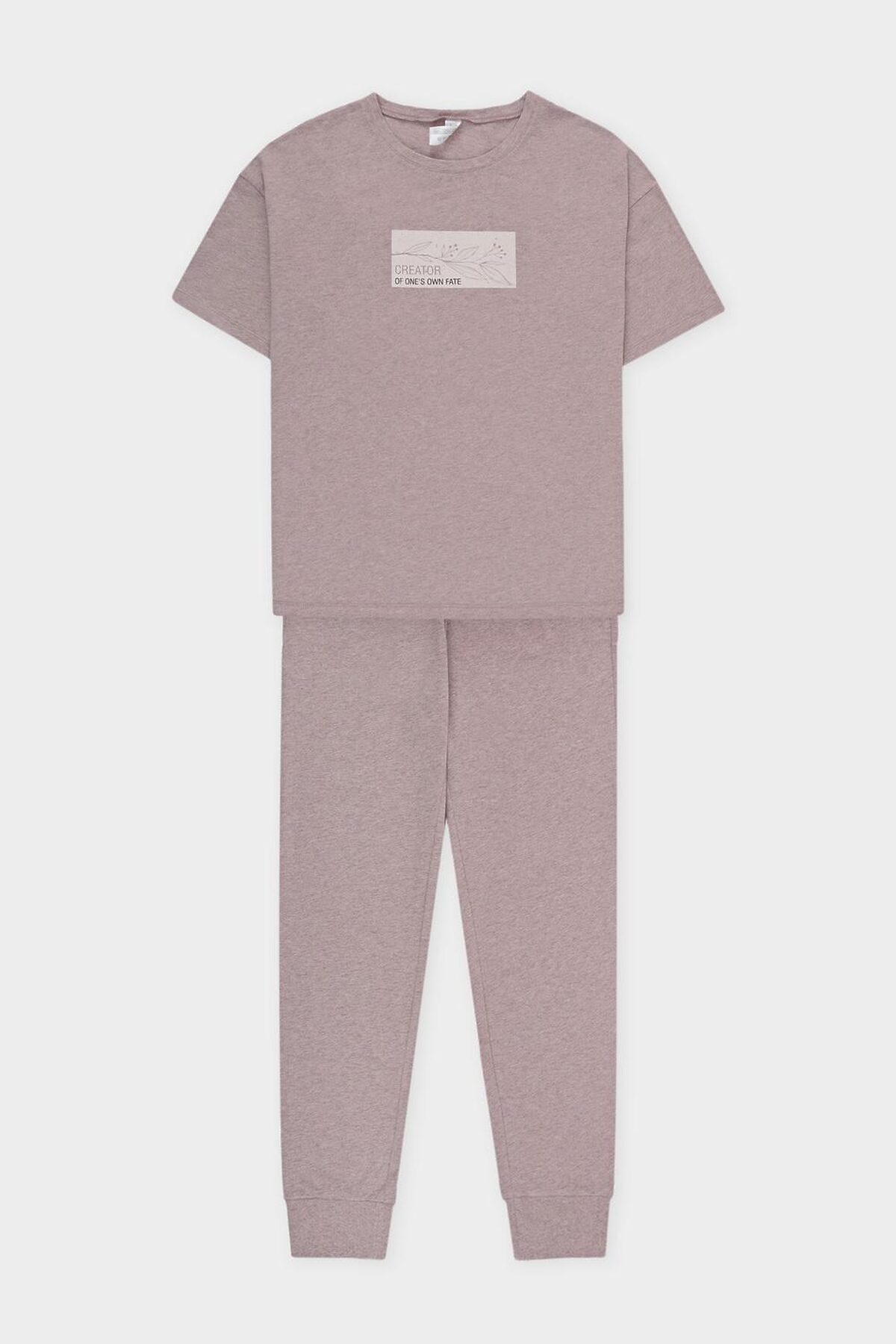 Легкий комплект для комфортного сна и отдыха из меланжевого трикотажа. Футболка с принтом и спущенной линией плеча комфортно садится по фигуре. Брюки с эластичными манжетами с боковыми карманами. Круглый шнур позволяет регулировать посадку. Гладкий материал приятен к телу и позволяет коже дышать. Все трикотажные полотна производятся в соответствии с нормами Швейцарского сертификата ЭкоТекс. Сделано в Узбекистане - комфортная посадка - гипоаллергенные красители