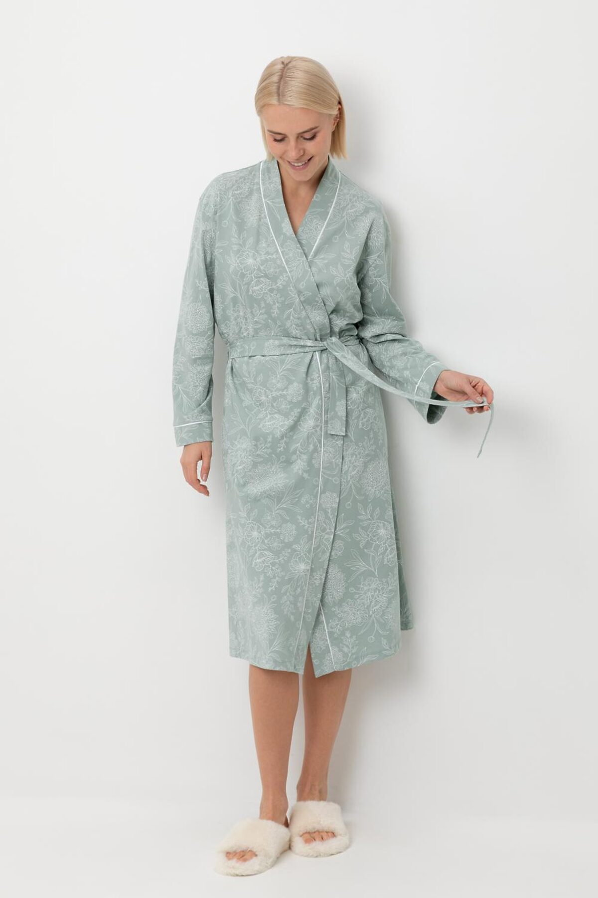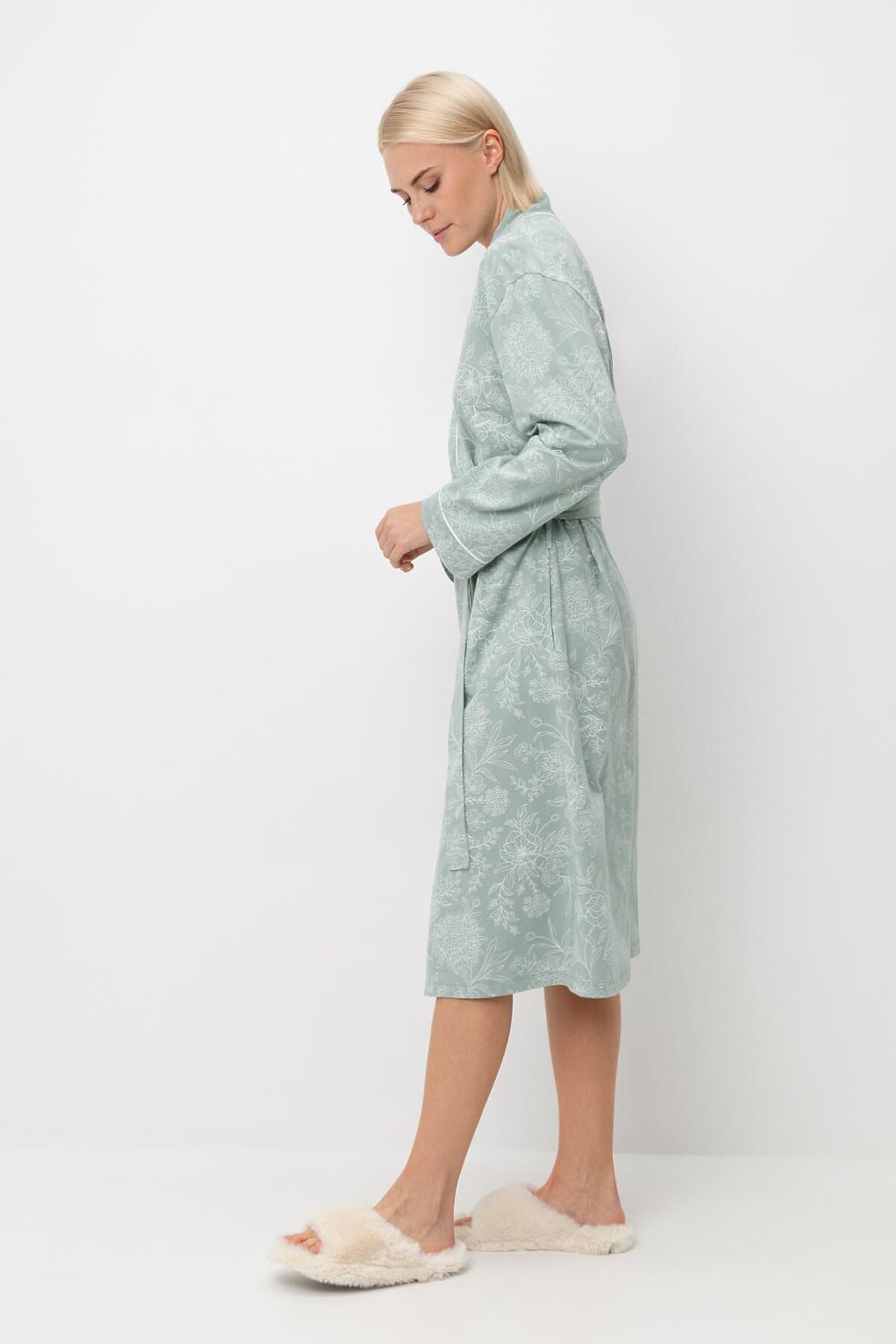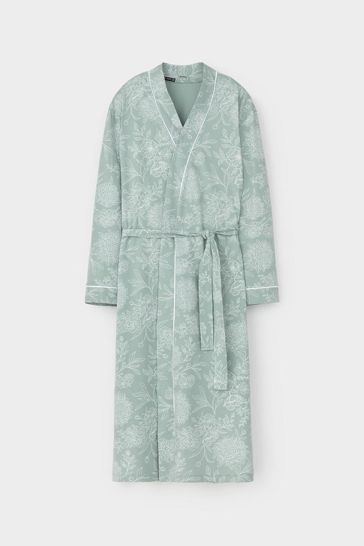 Уютный легкий халат из набивного трикотажа на запах с длинными рукавами. В боковых швах два удобных кармана. С помощью пояса можно регулировать посадку и силуэт. Гладкий материал приятен к телу и позволяет коже дышать. Все трикотажные полотна производятся в соответствии с нормами Швейцарского сертификата ЭкоТекс. Сделано в Узбекистане - 100% натуральный хлопок - гипоаллергенные красители