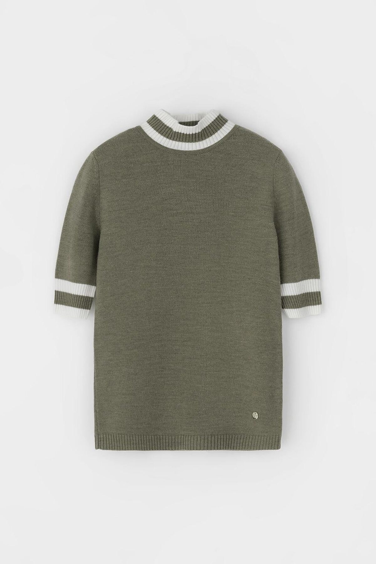 Джемпер в стиле прямой футболки, воротником-стойкой и короткими рукавами. Прямой силуэт, стандартная длина. Средняя плотность вязания, пластичная фактура. Выполнен гладью из мягкой полушерстяной пряжи. Шерсть в составе сохраняет тепло, а благодаря волокнам акрила изделие мягкое и дольше сохраняет форму. Все вязаные изделия проходят дополнительную влажно-тепловую обработку по итальянской технологии, что гарантирует минимальную усадку во время носки. Сделано в России
