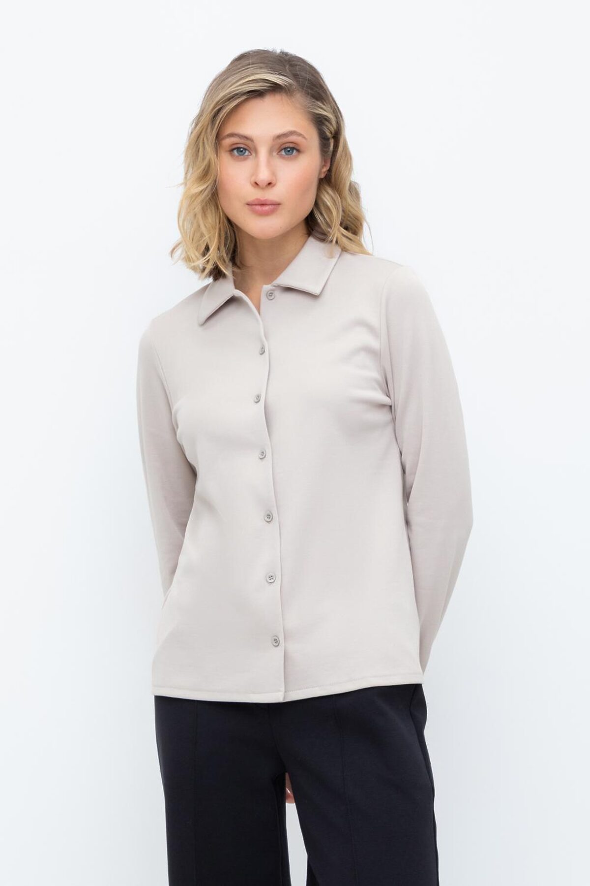 Рубашка прямого кроя из плотного гладкого трикотажа интерлок с длинными рукавами с застежкой на пуговицы.