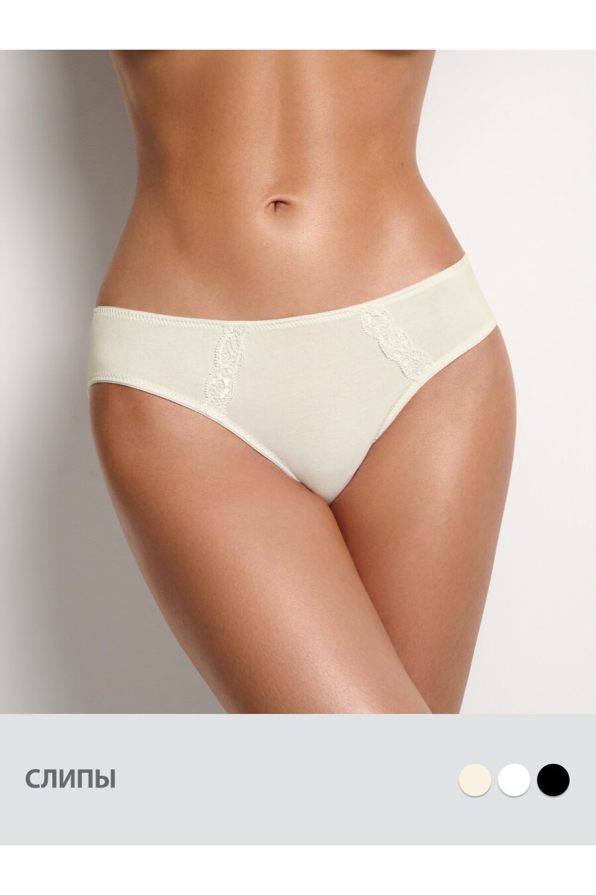 Трусы-слипы с низкой посадкой из качественного хлопка,с мягкой резинкой по поясу и ножкам, с декором из кружевной тесьмы спереди. Модель, сочетающая комфорт и женственный стиль