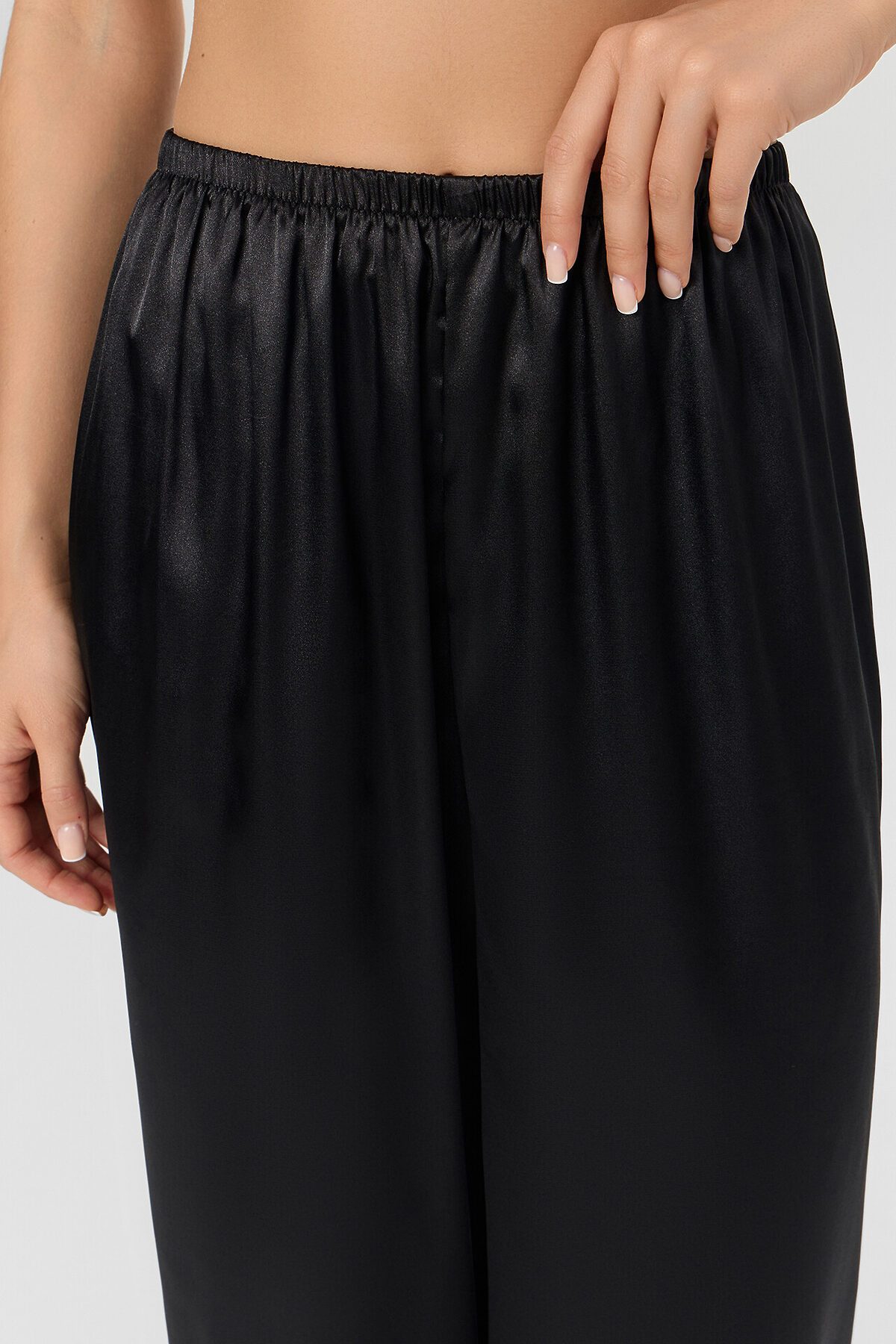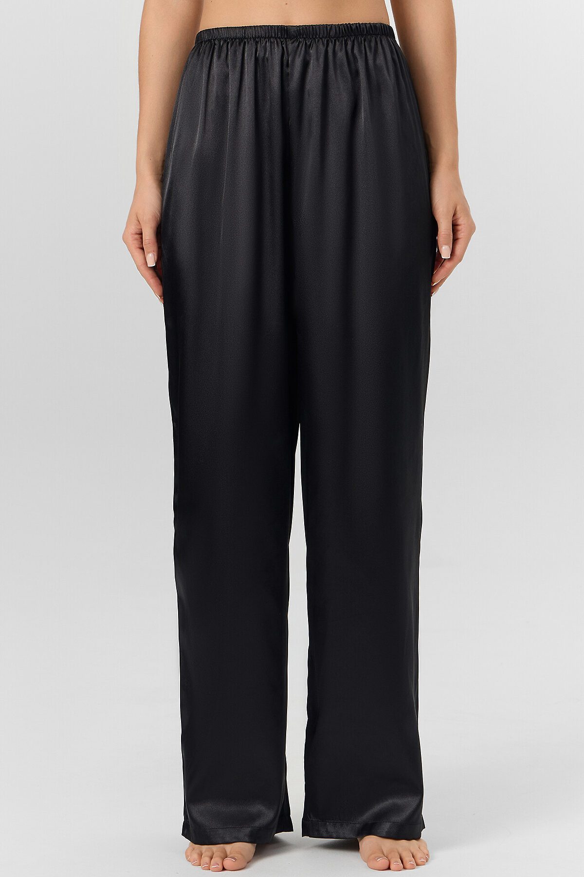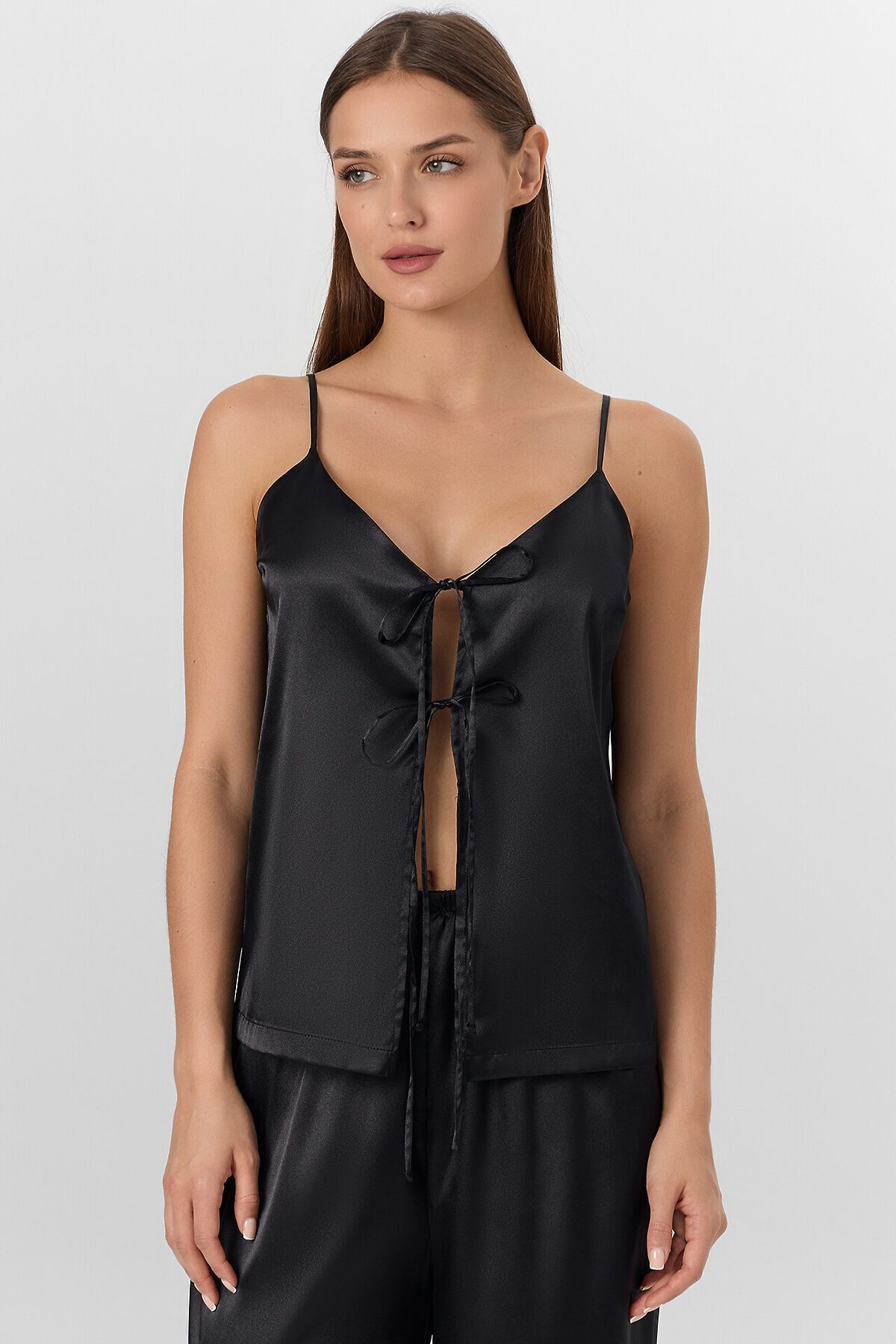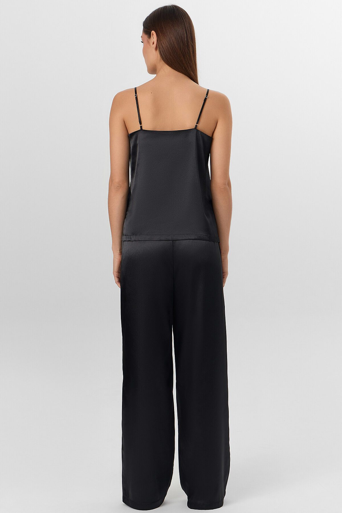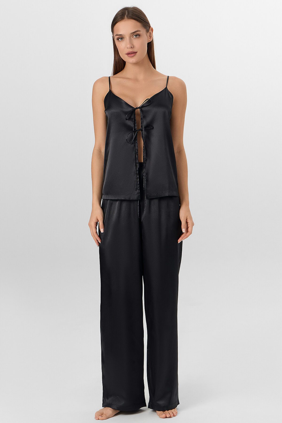 Комплект женский состоит из блузы и брюк. Блуза на тонких бретелях прямая, свободная. Бретели с регулировкой на регуляторы и кольца (пластик 6мм). Верхний срез обработан обтачкой из основного полотна. На передних половинках застрочены вытачки. По переду застежка на завязки. Брюки прямые длинные. Посадка срердняя. Пояс цельнокроеный с эластичной тесьмой внутри (внутр. 20мм 20Rv). Нижние срезы брюк и блузы обработаны швом вподгибку с закрытым срезом.