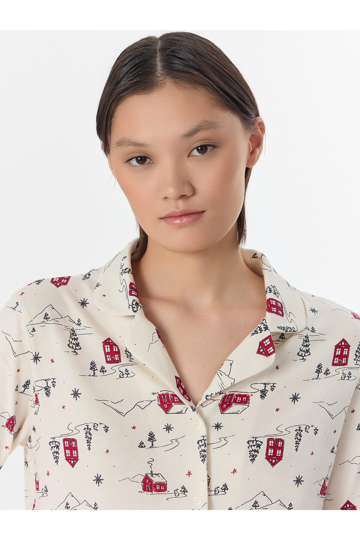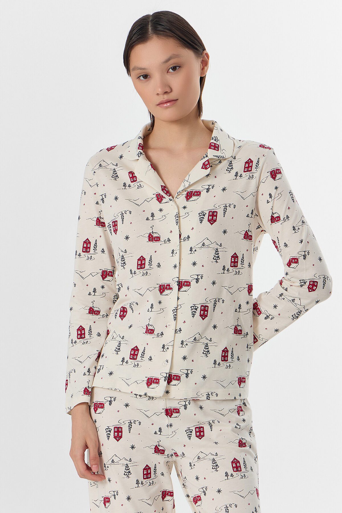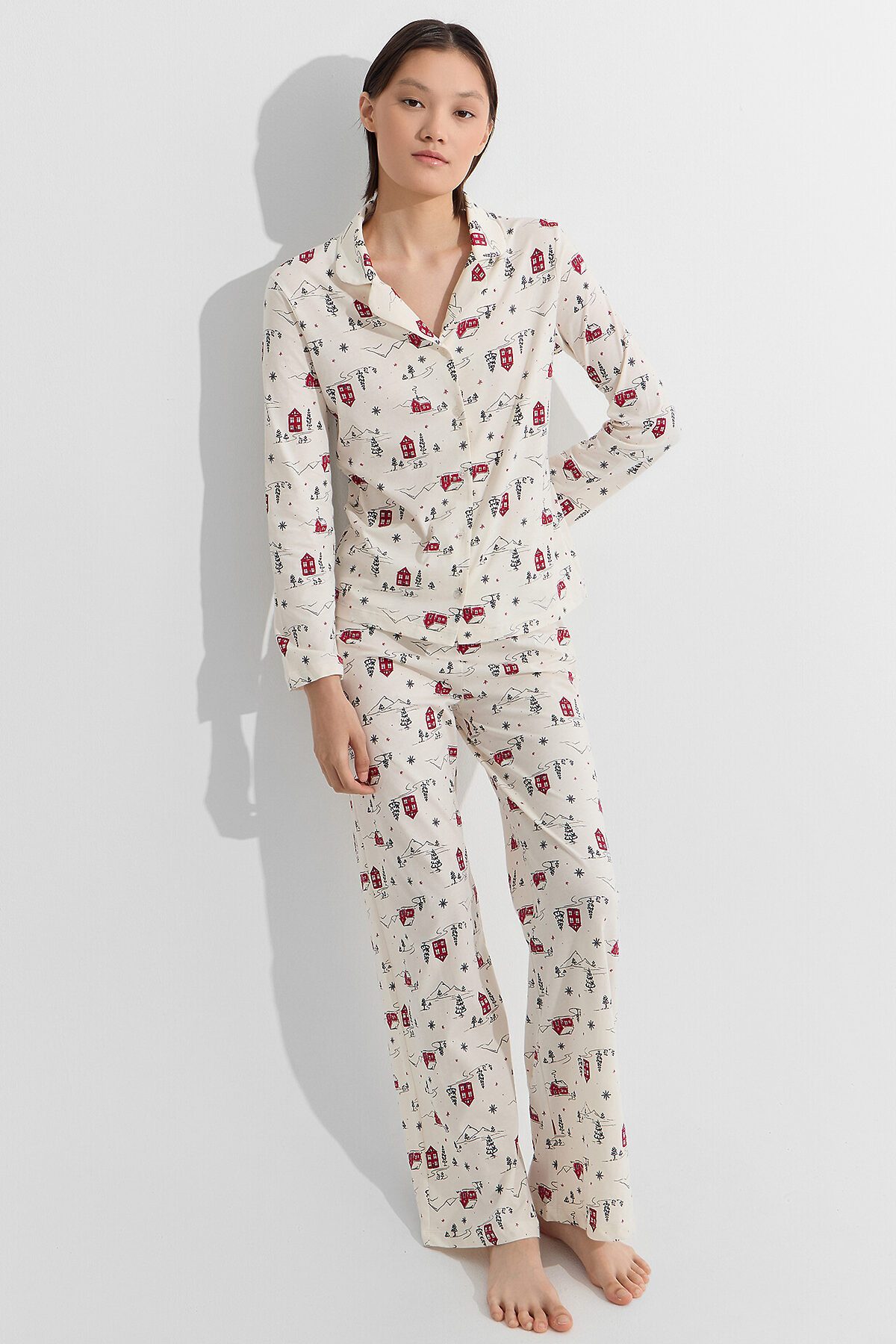 Бежевая пижама с зимним рисунком подарит вам ощущение тепла и уюта в холодные вечера. Этот очаровательный комплект состоит из удлиненного жакета и свободных брюк — идеальный выбор для спокойного сна и расслабленного отдыха.