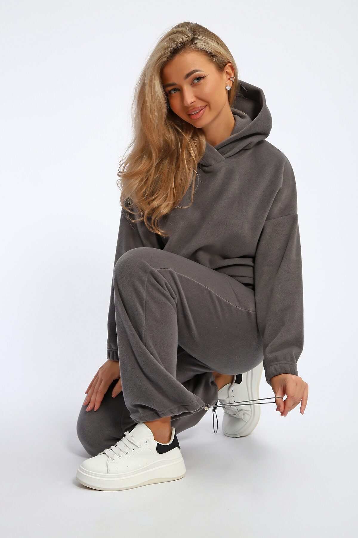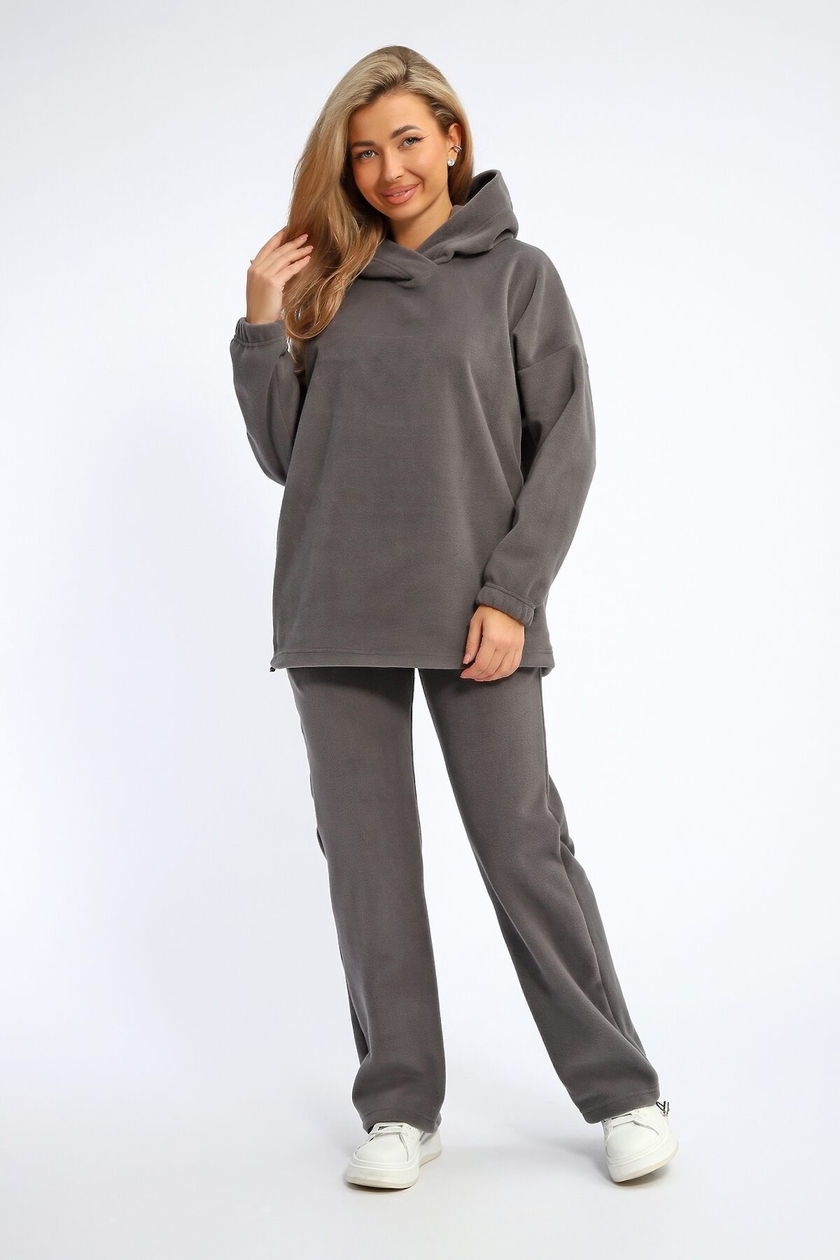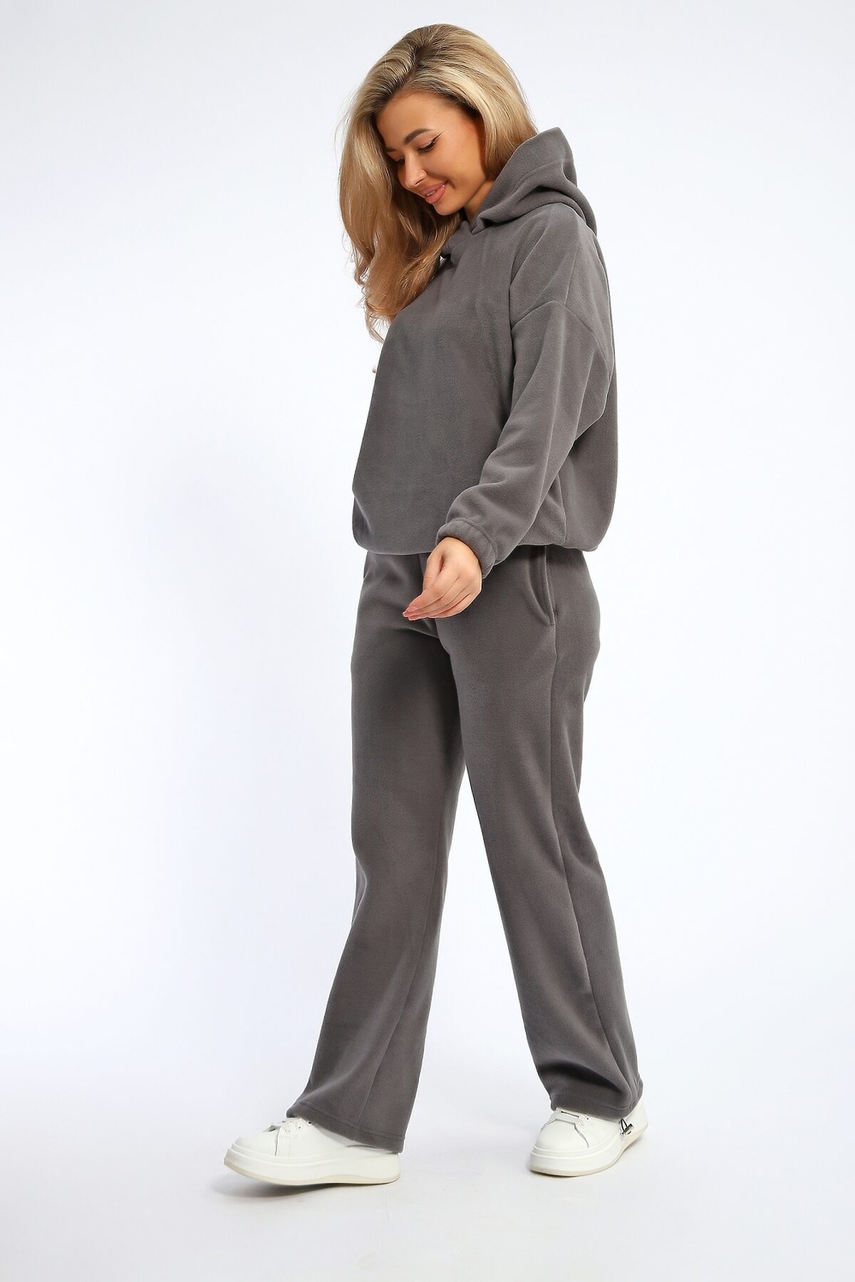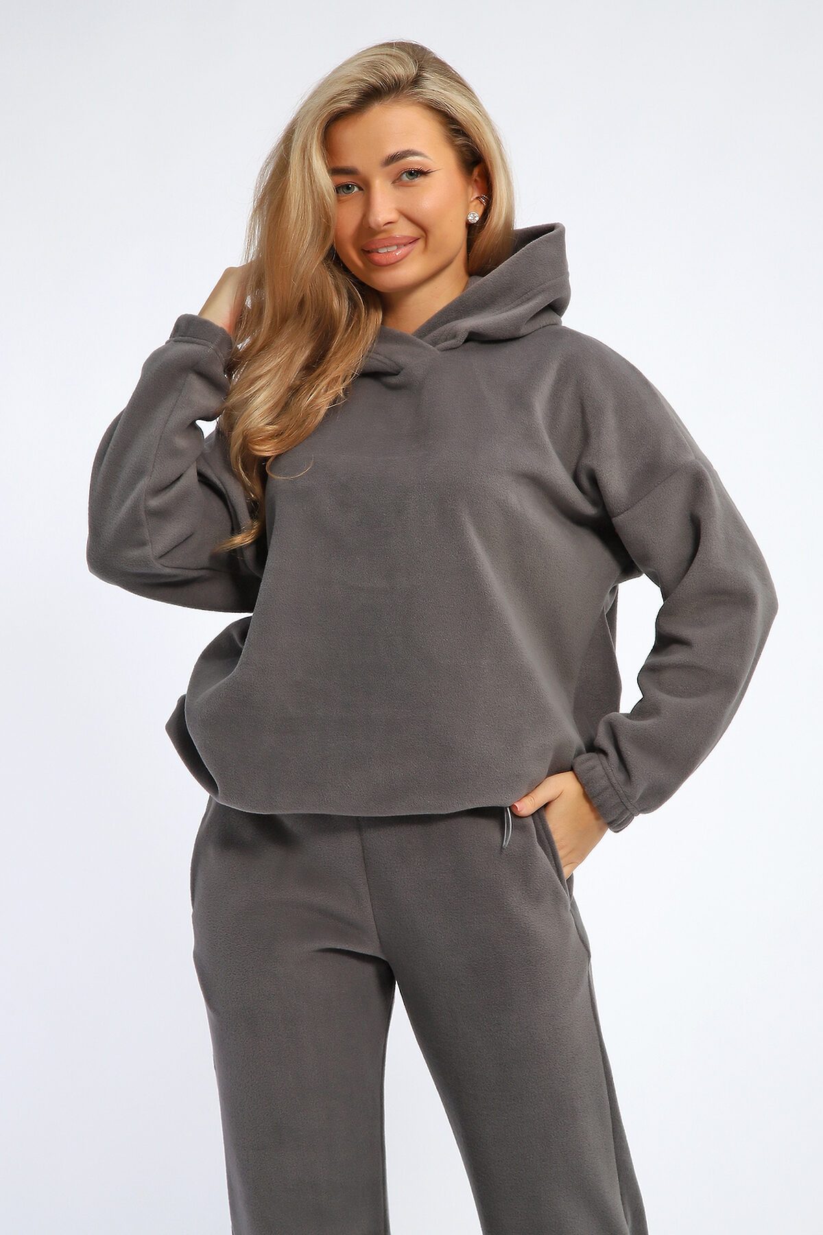 Костюм женский флисовый состоит из худи свободного кроя и брюк. Худи с капюшоном, рукав на резинке, по низу утягивается эластичным шнурком с фиксаторами. Брюки свободные, с карманами, внизу можно также утягивать эластичным шнурком с фиксаторами. Костюм мягкий, комфортный, отлично подойдет для прогулок в прохладное время года.