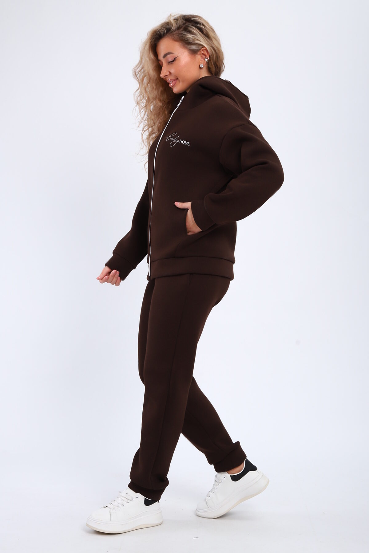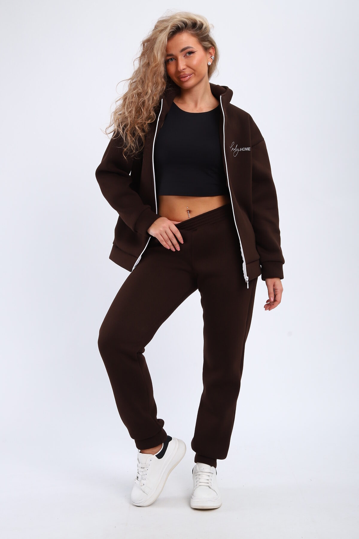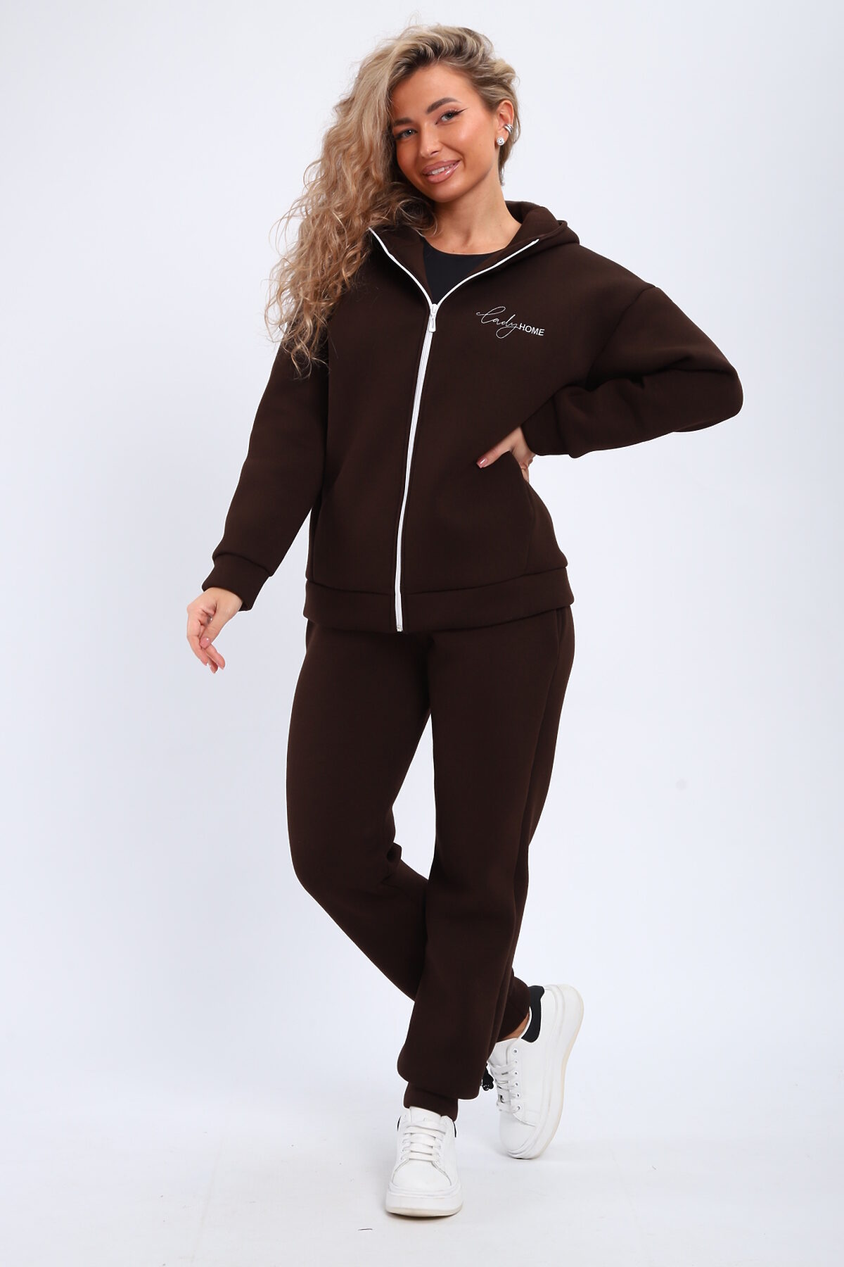 Женский костюм из футера 3-х нитки с начесом. Костюм состоит из толстовки и брюк. Толстовка свободная на молнии с капюшоном, на полочке оригинальная вышивка Lady HOME, по боковому шву в шве карман. Толстовка со спущенным рукавом на манжете. Брюки свободные. По боковому шву карман в шве, низ брюк на манжете. Пояс обработан на поясной машине, что делает брюки практичными при носке резинка не скручивается. Костюм теплый, удобный, комфортный. Идеальное решение для повседневной носки в прохладную погоду!
