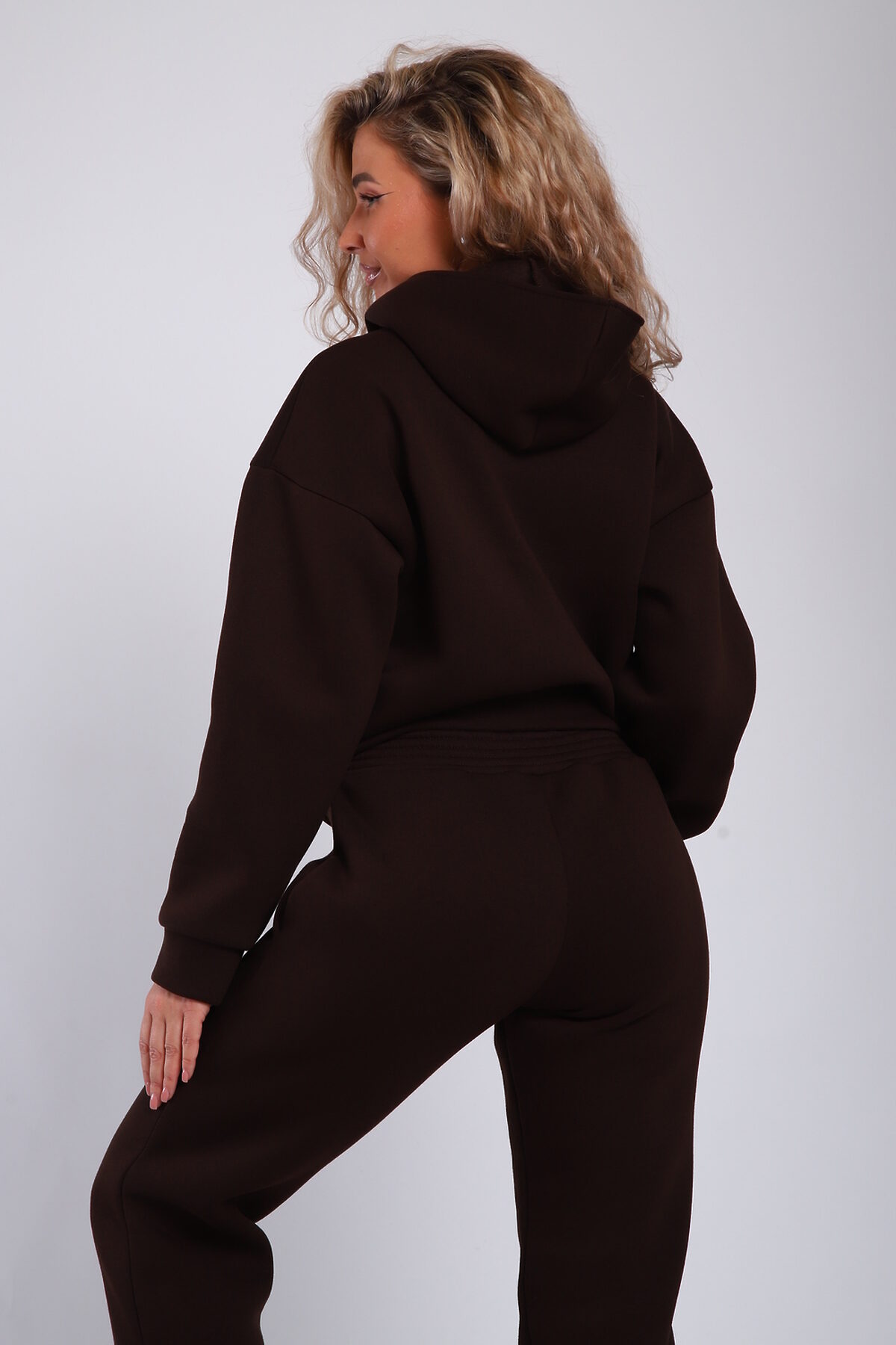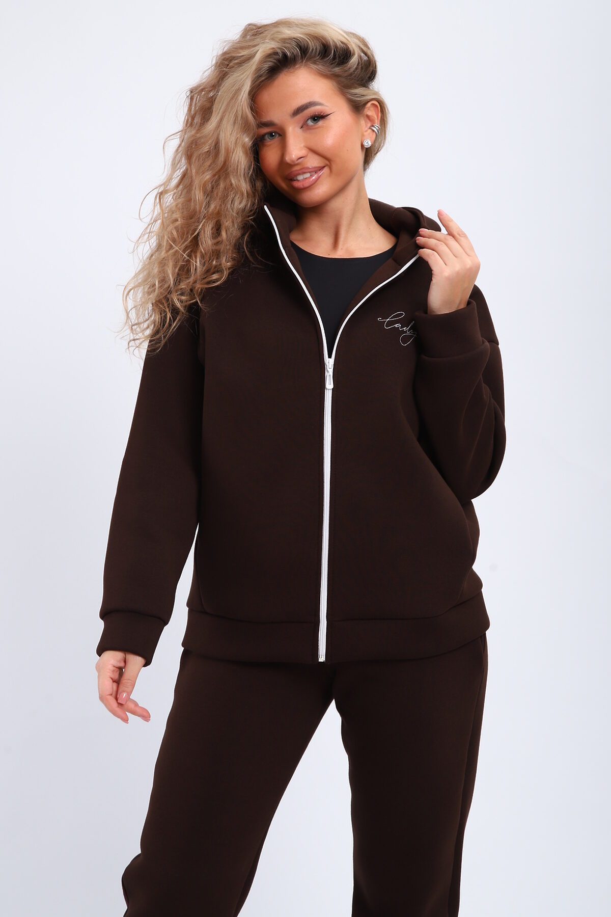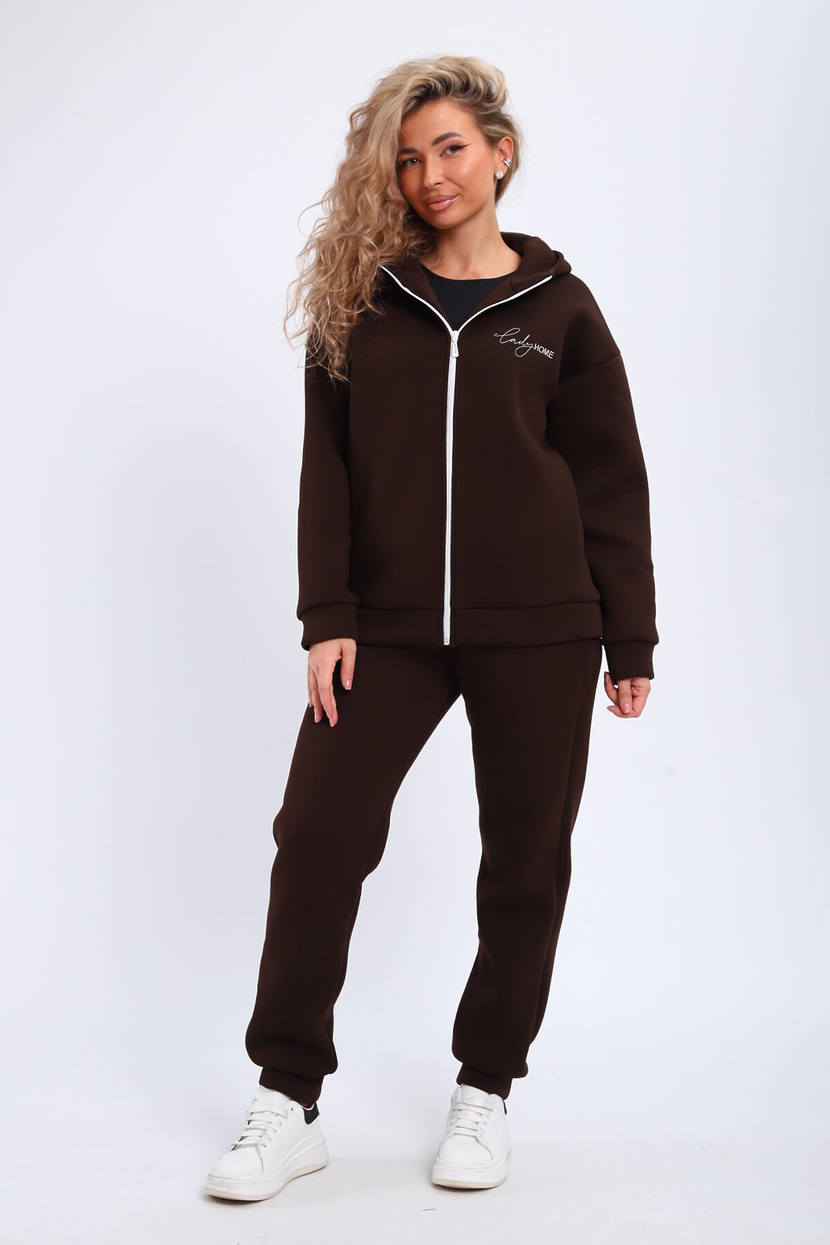 Женский костюм из футера 3-х нитки с начесом. Костюм состоит из толстовки и брюк. Толстовка свободная на молнии с капюшоном, на полочке оригинальная вышивка Lady HOME, по боковому шву в шве карман. Толстовка со спущенным рукавом на манжете. Брюки свободные. По боковому шву карман в шве, низ брюк на манжете. Пояс обработан на поясной машине, что делает брюки практичными при носке резинка не скручивается. Костюм теплый, удобный, комфортный. Идеальное решение для повседневной носки в прохладную погоду!