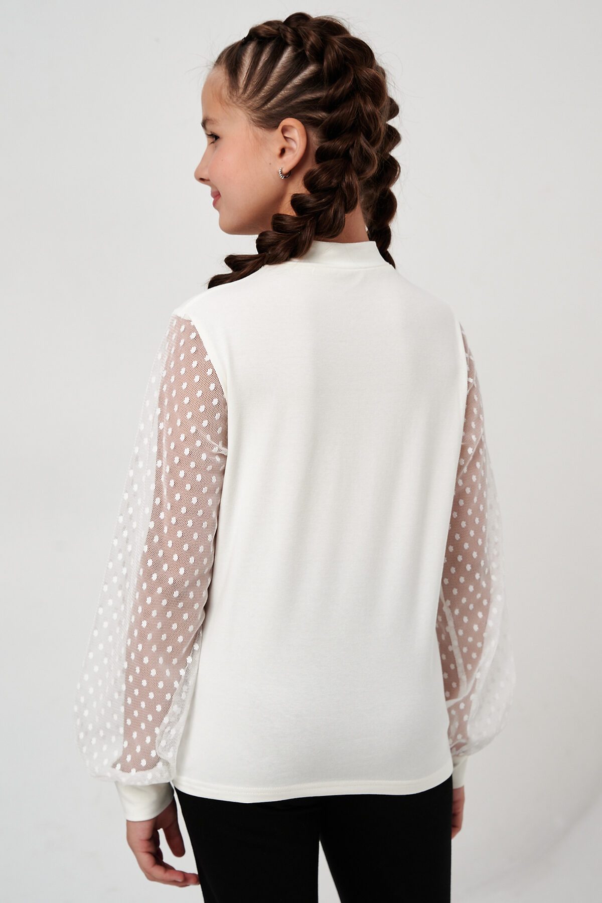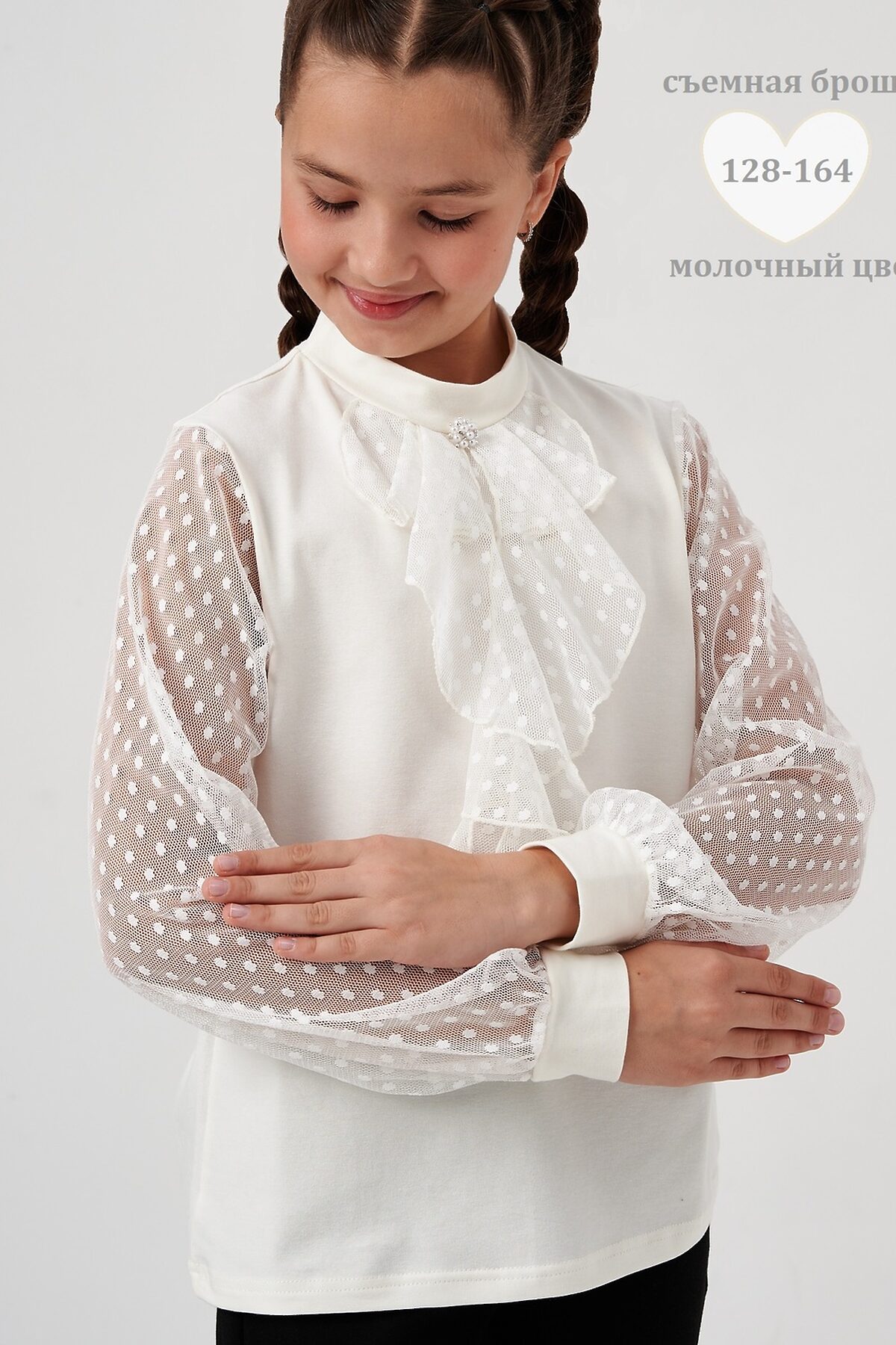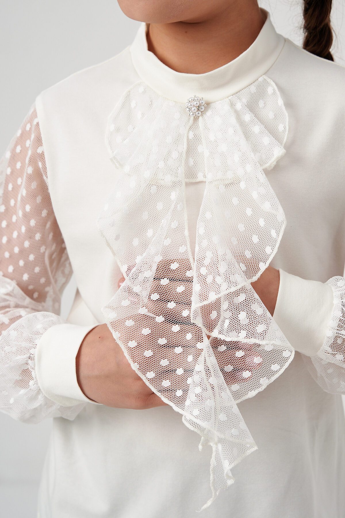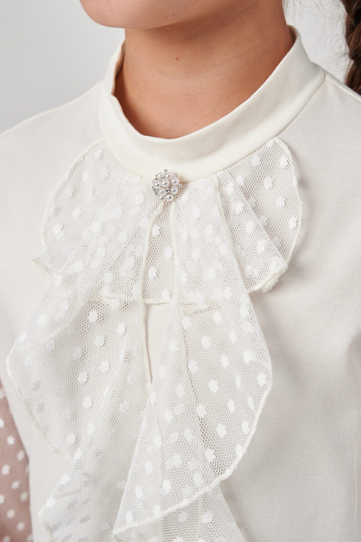 Блузка школьная для девочек с длинными рукавами из фатина. Красивый джемпер для девочек с жабо на каждый день.