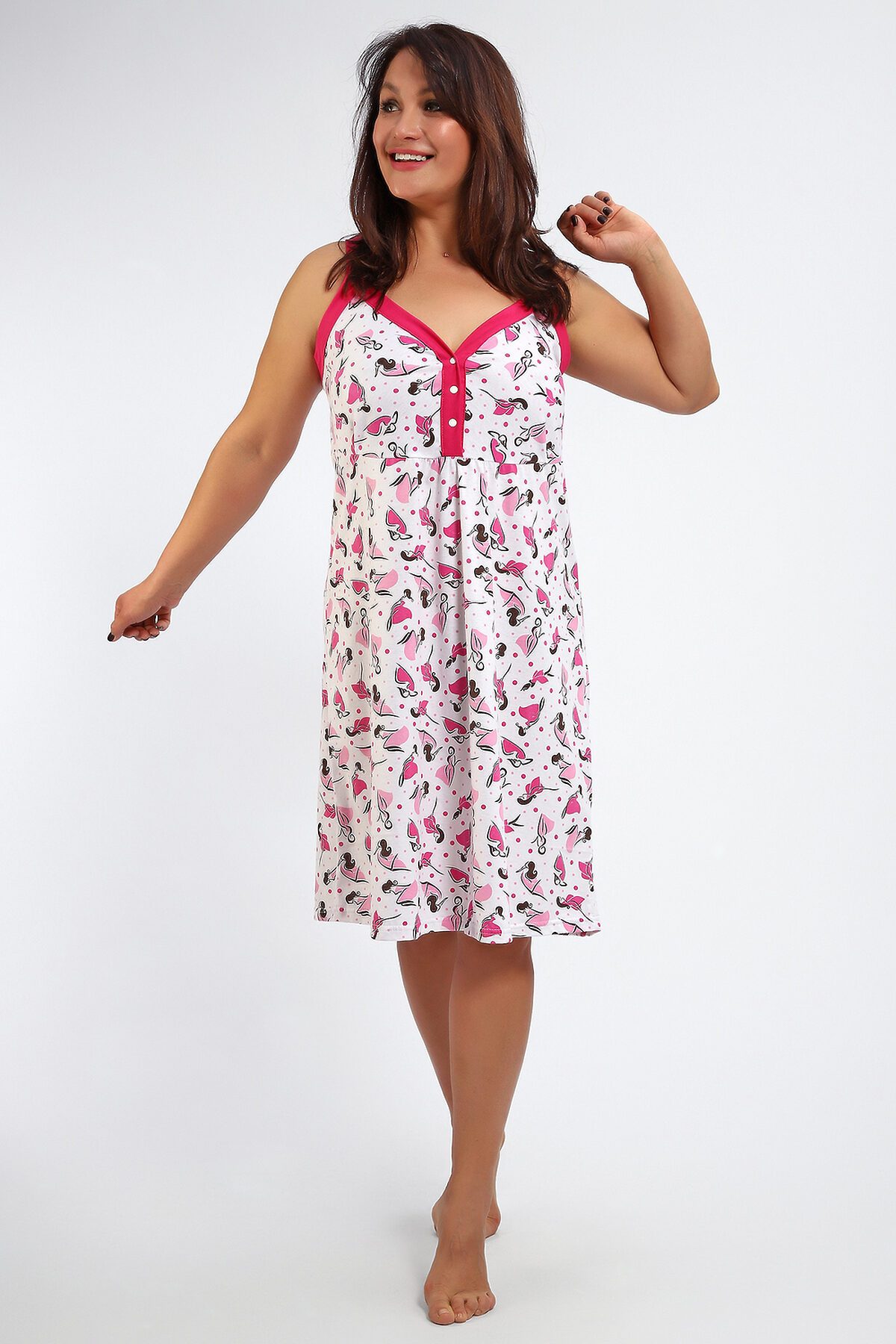 Сорочка женская без рукава на брителях . Данная модель выполнена из трикотажного полотна кулирка ( хлопок 100%). Полочка отрезная с кнопками. Горловина обработана широкой окантовкой. Отличная модель для сна и кормления.