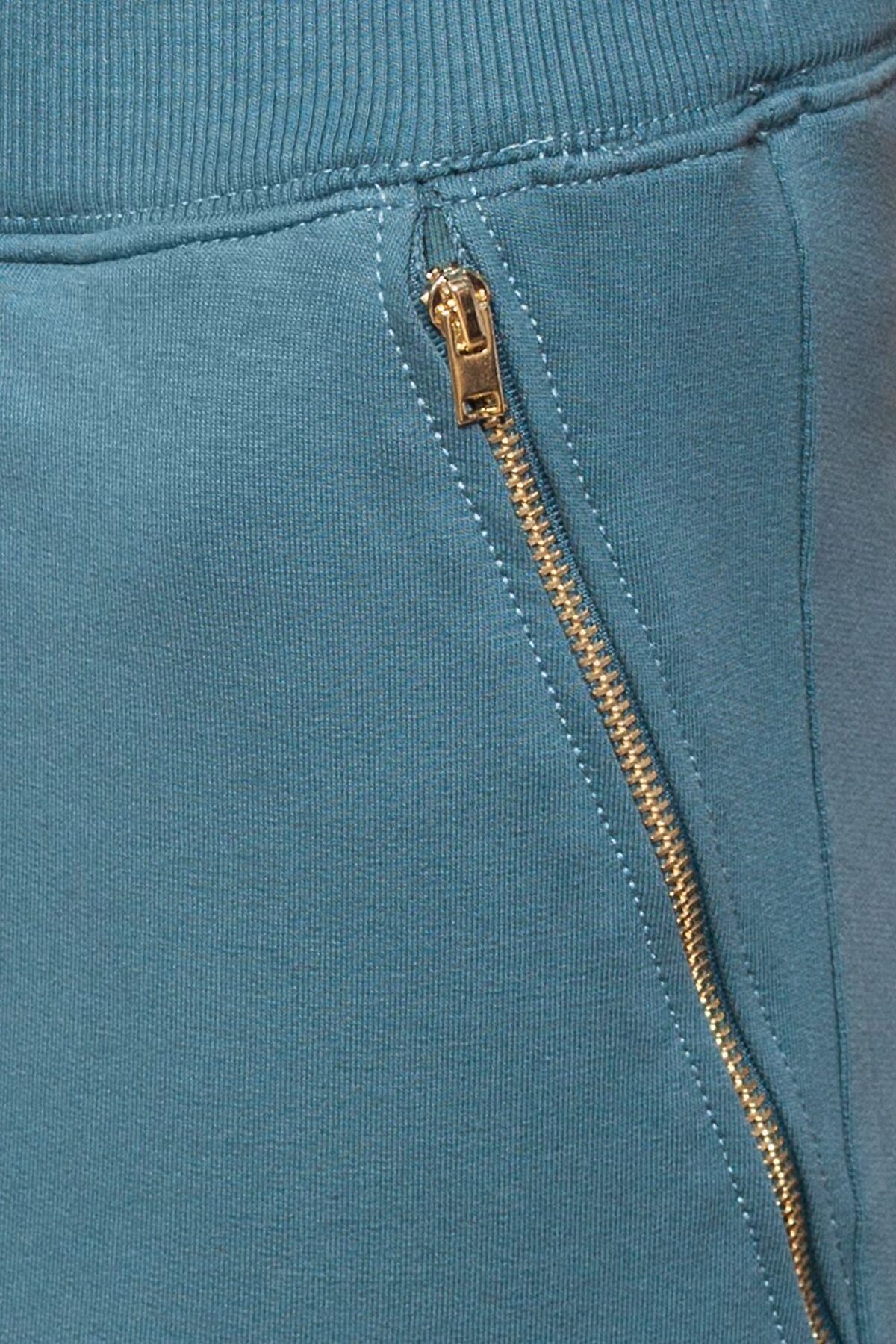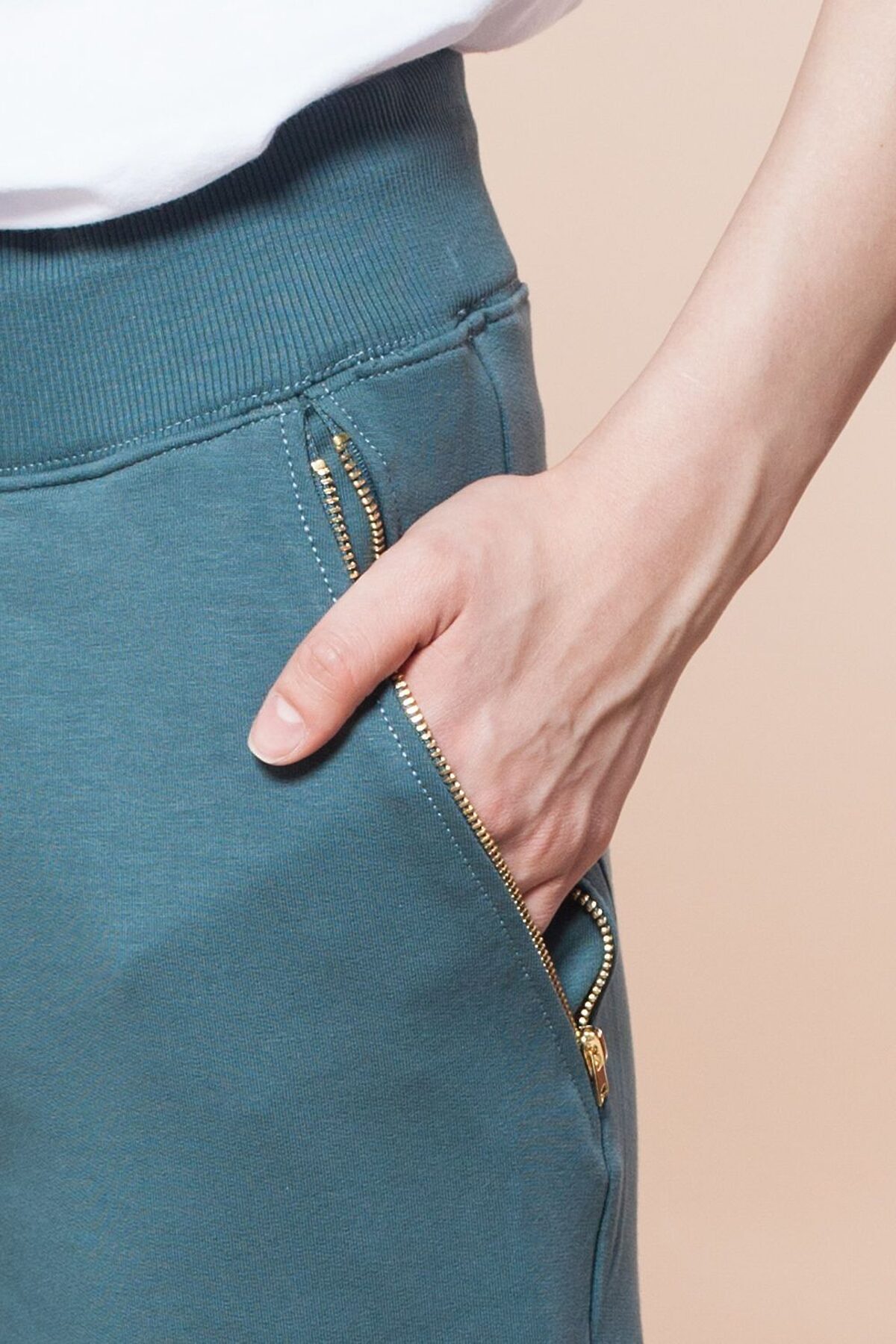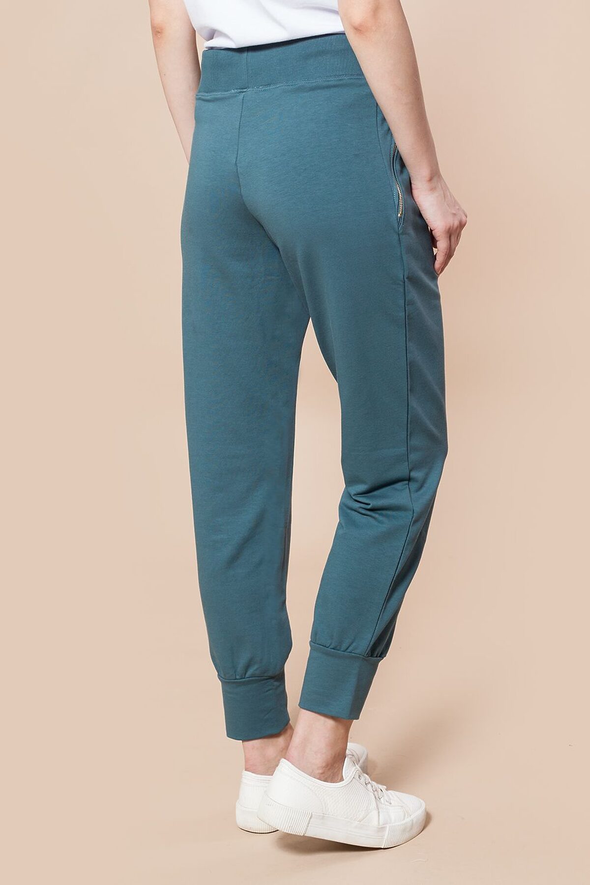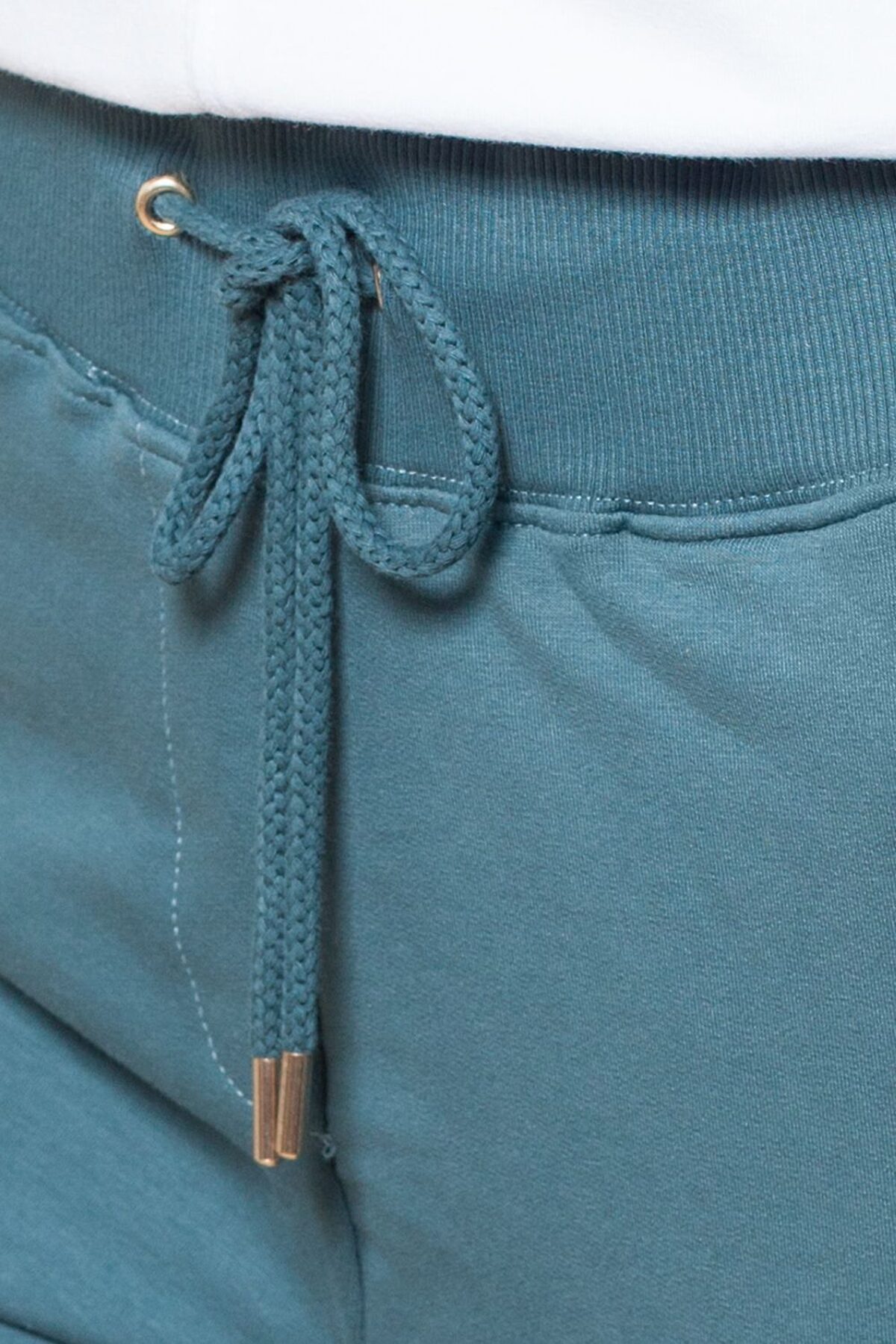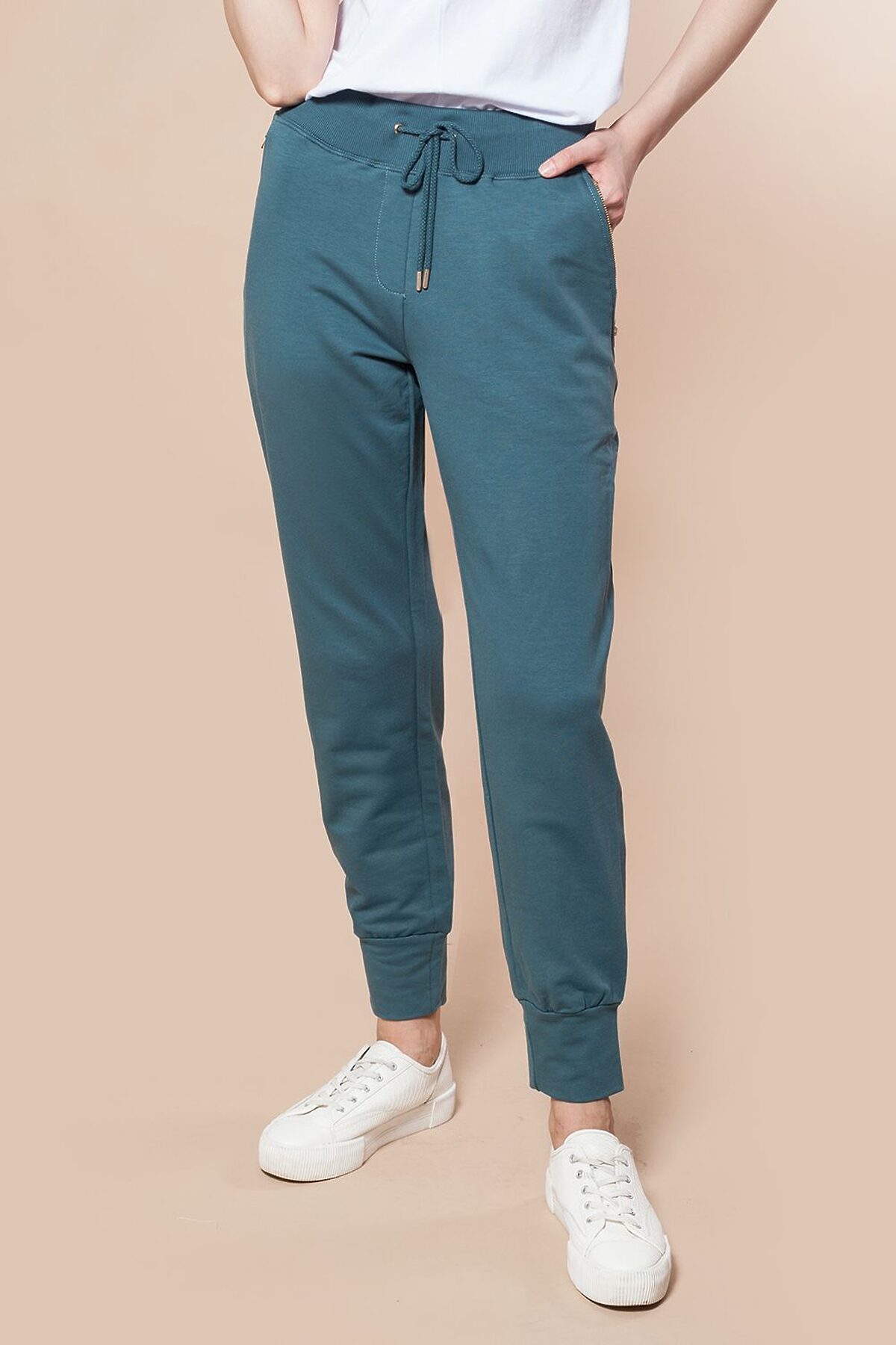 Брюки выполнены из эластичного футера двухнитки. Пояс из рибаны 2*2. Карманы закрываются на металлические молнии. Шнур выходит из металлических люверсов и украшен металлическими наконечниками.