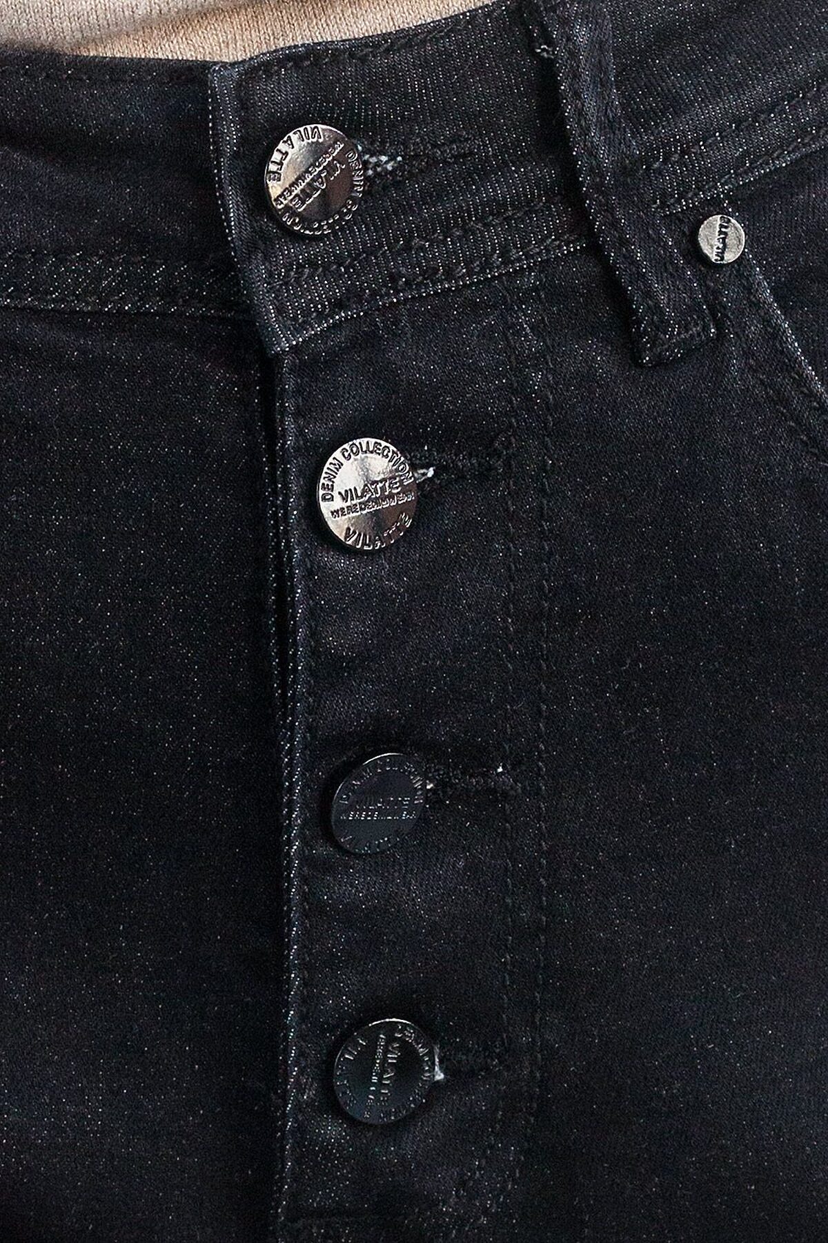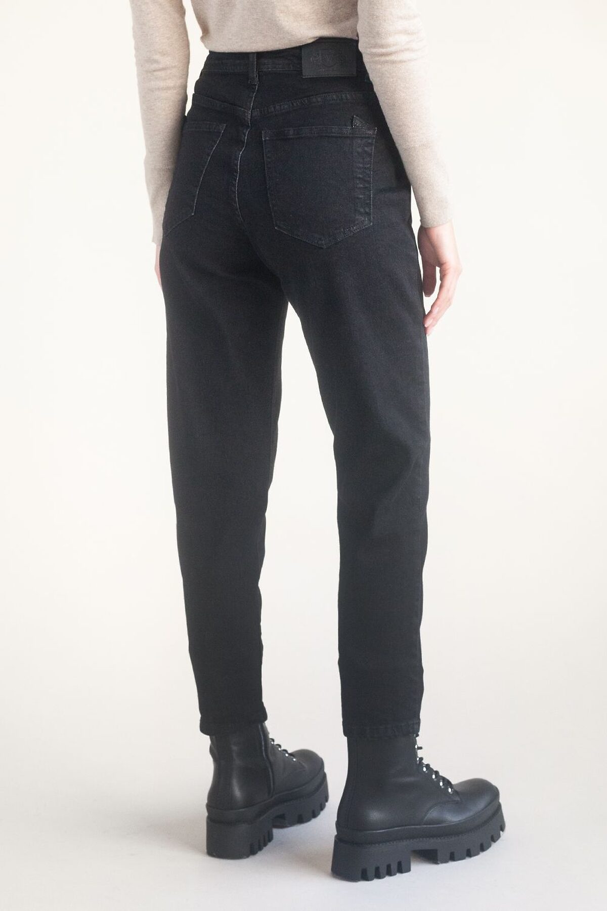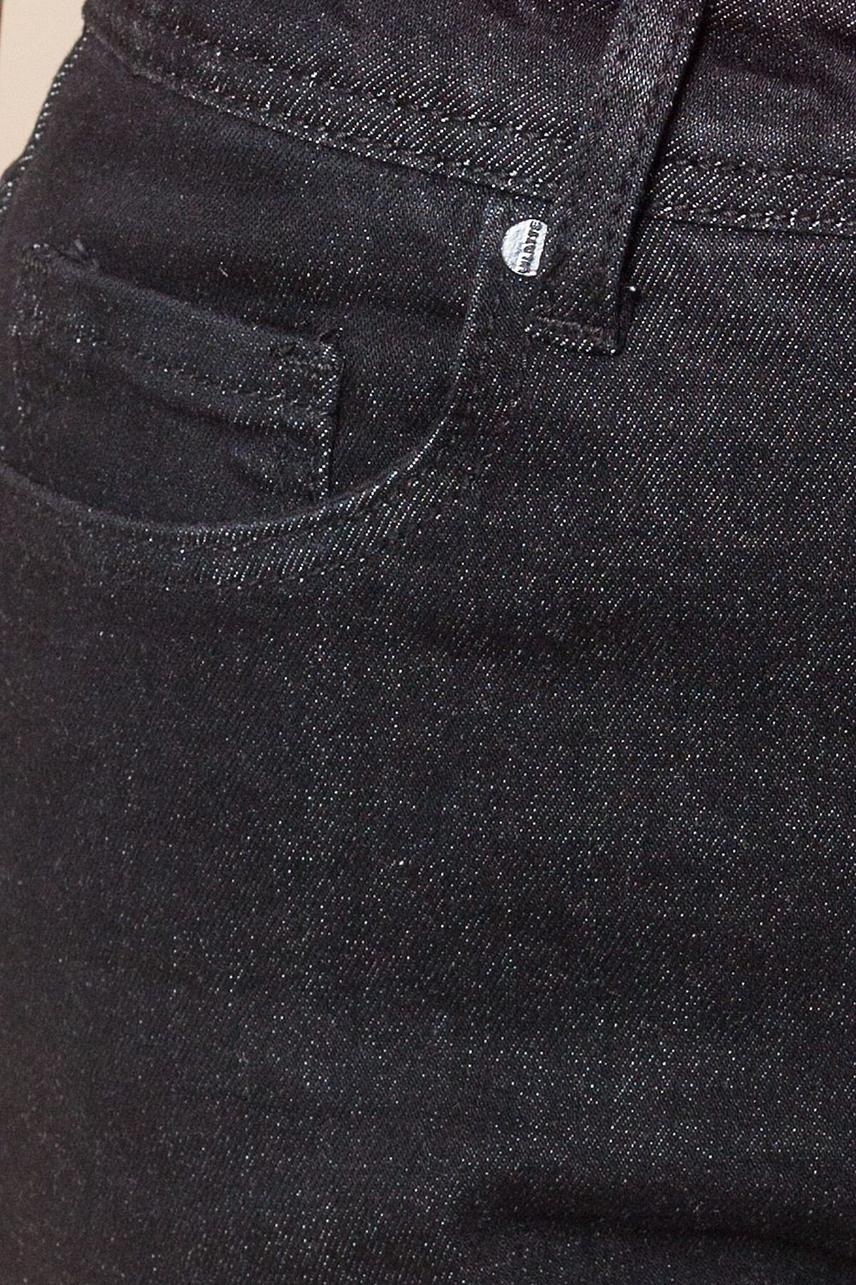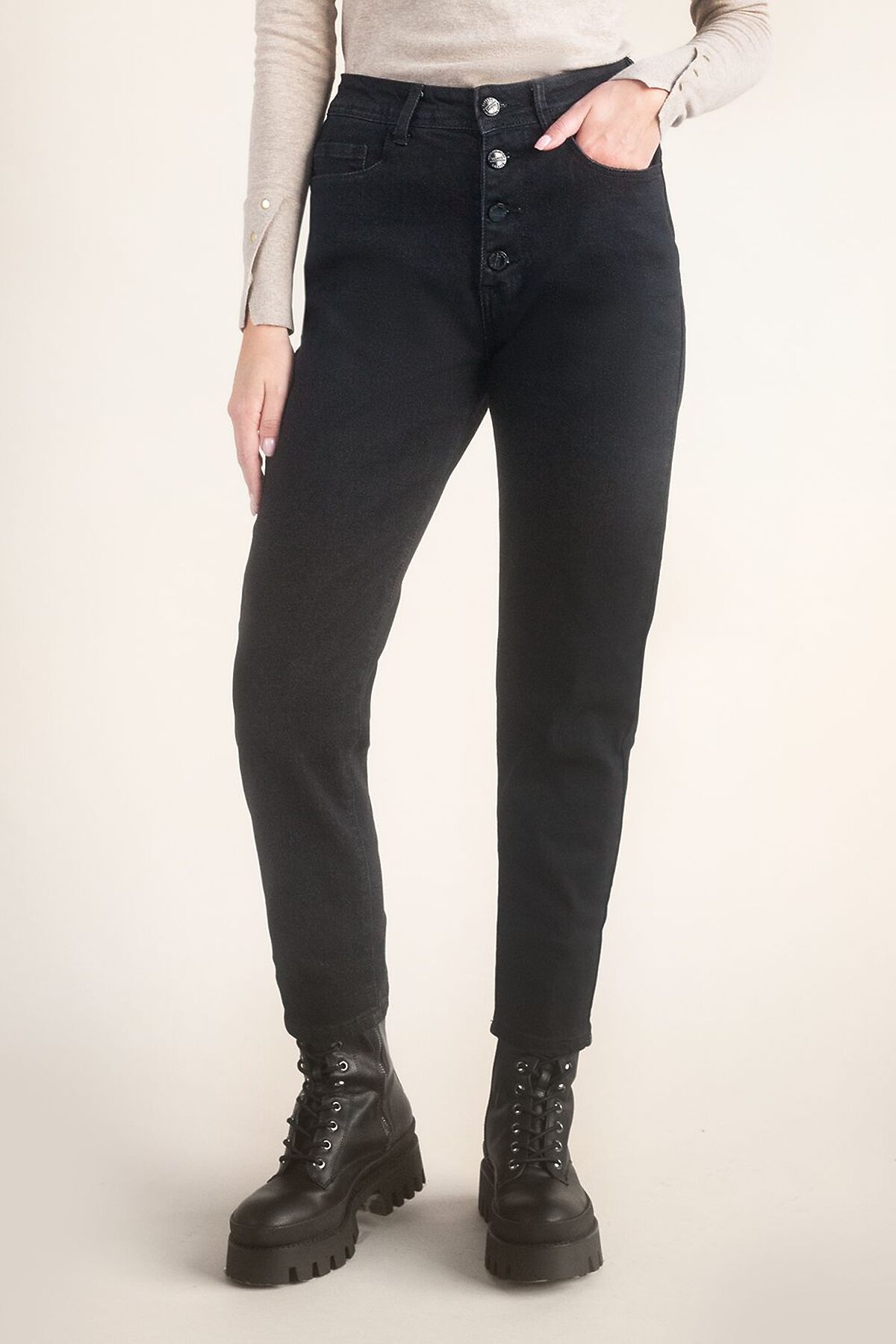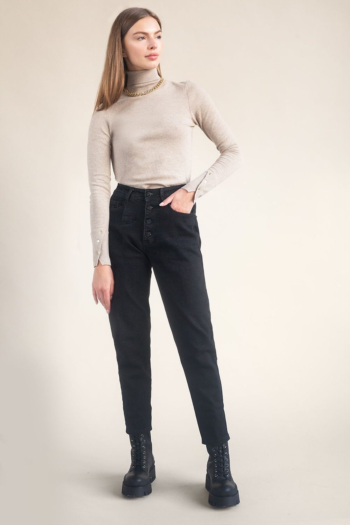 Главный must have осенне-зимнего сезона - черные джинсы mom-fit c завышенной талией. Выполнены из плотного эластичного денима. Эффекный элемент - застежка на черные болты - выделит из толпы и украсит любой лук ненавязчивым блеском.