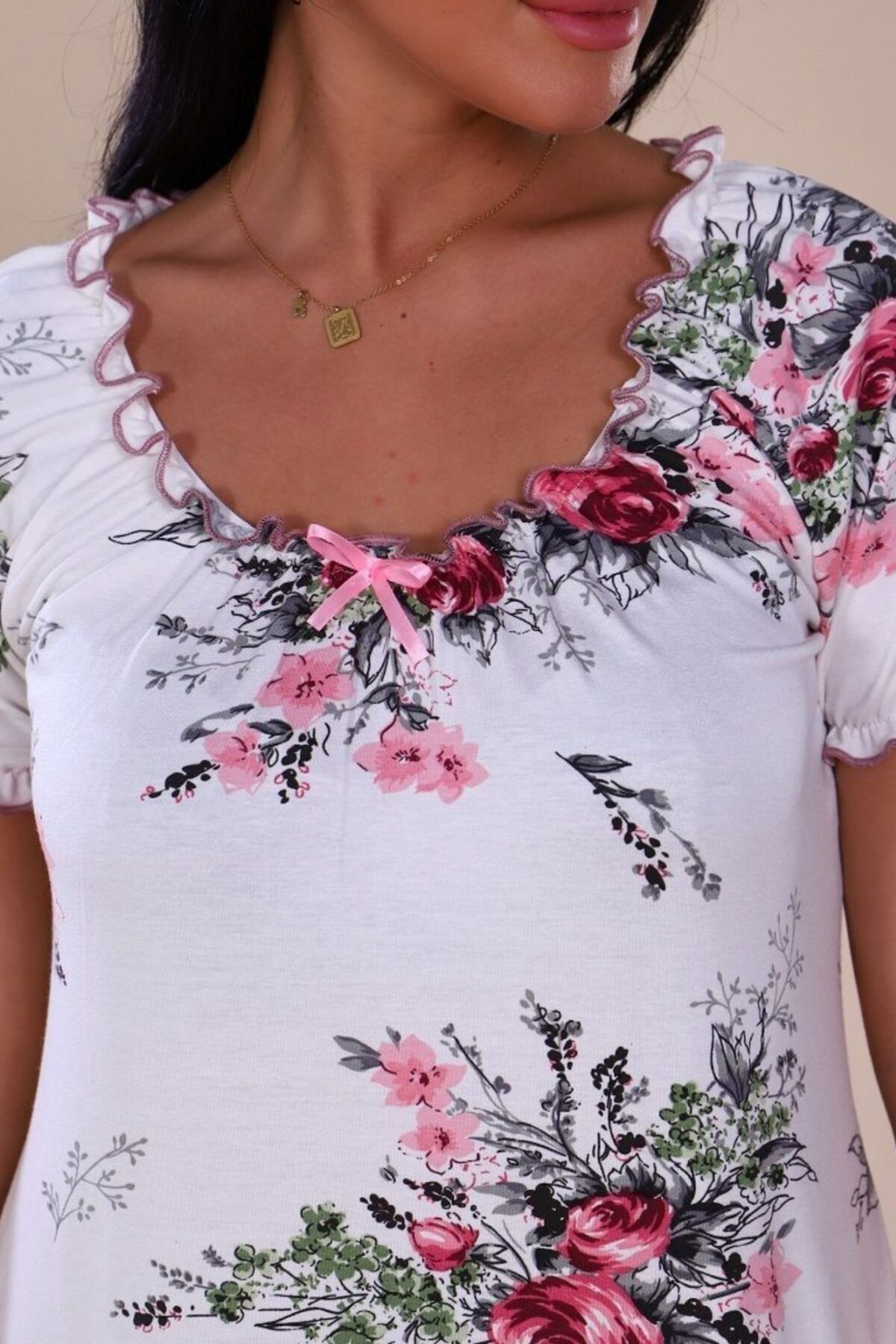 Сорочка из вискозы - маленькая женская радость. Элегантная женская сорочка сшита из легкой струящейся вискозы. Ткань нежная, приятная на ощупь, она не мнется. Домашнее платье с коротким рукавом не стесняет движений, удобный А-силуэт отлично смотрится на девушках с любым типом фигуры. Платье выполнено в насыщенном синем и молочном цвете и украшено нежным цветочным принтом. Горловина и рукава сорочки собраны на резинку, благодаря чему создается эффект рюши. Маленький атласный бантик добавляет кокетства. Трикотажное платье на каждый день просто создано для комфортного сна и отдыха.