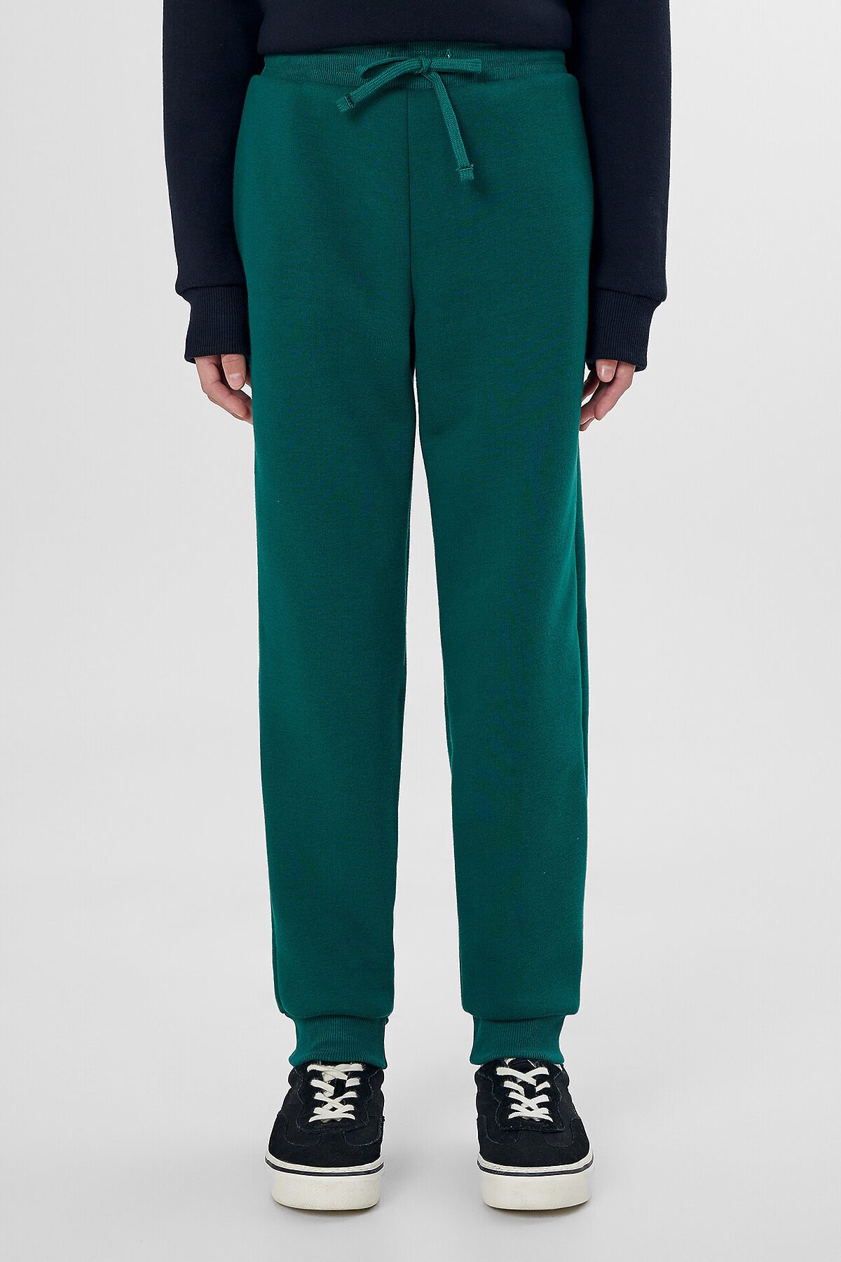 Комплект состоит из джемпера и брюк. Джемпер свободного, прямого силуэта. Длина до середины ягодиц. Перед и спинка цельнокроеные. Горловина круглой формы, обработана обтачкой из рибаны. Шов втачивания обтачки распошит. Рукава длинные, втачные. Шов втачивания рукава отстрочен. По низу рукавов притачные манжеты из рибаны. По низу джемпера притачивается пояс из рибаны. Шов притачивания пояса отстрочен. Брюки свободного силуэта. Пояс отрезной из рибаны с резиной внутри, по поясу проложены 2 отделочные строчки, по центру пробиты петли для шнура. Шнур кругловязаный, концы шнура застрочены. Карманы в боковых швах.