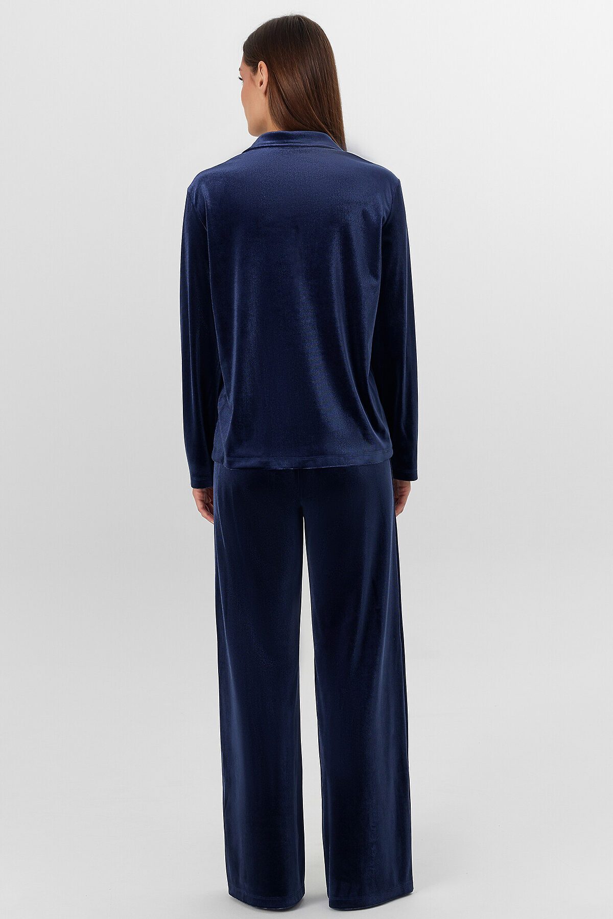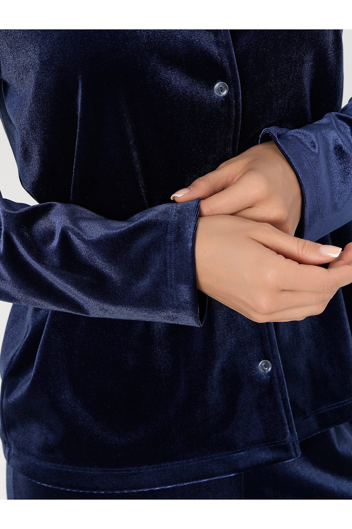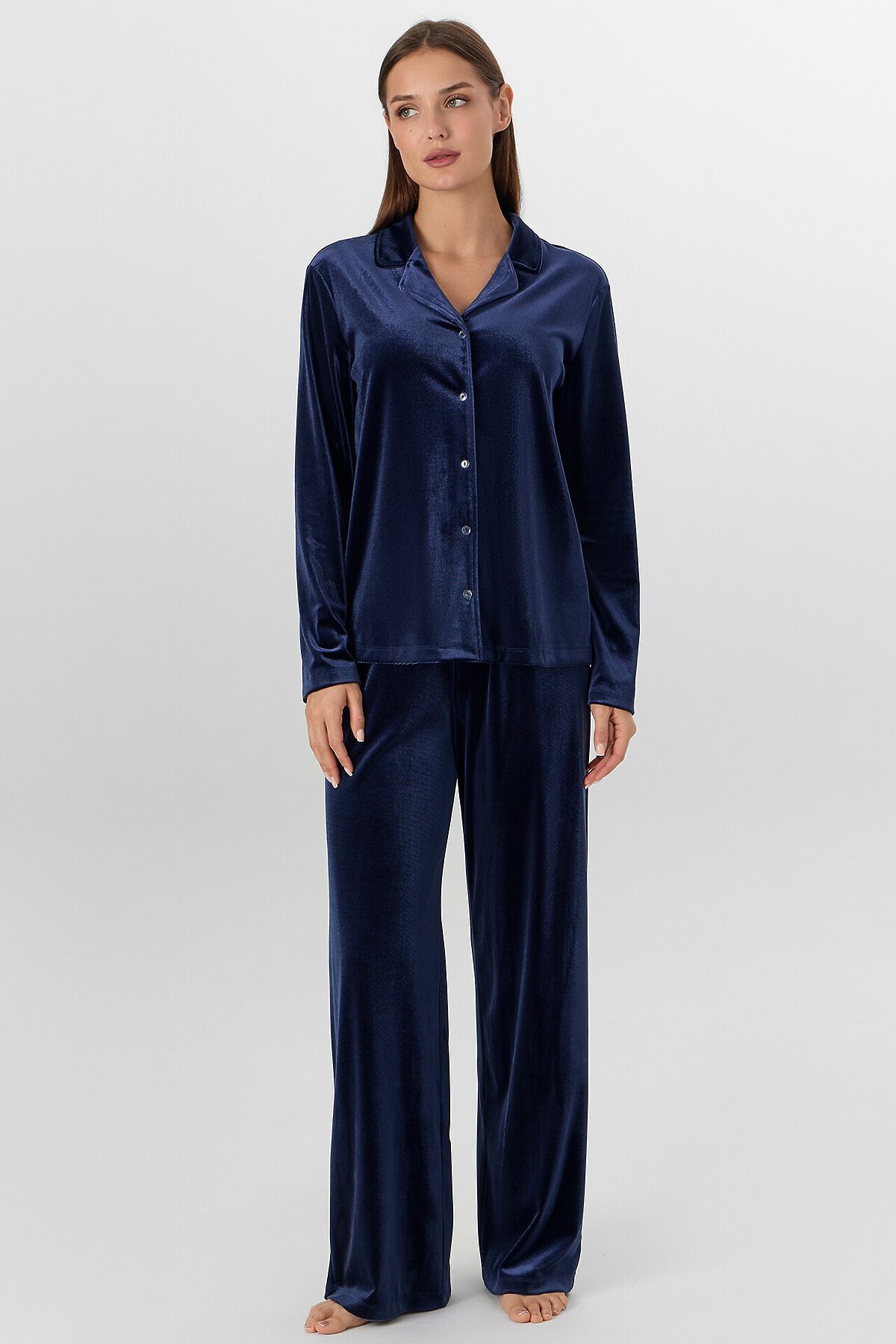 Жакет прямого силуэта. Горловина V-образной формы с отложным воротником и лацканами. По переду обработана центральная застежка на петли и пуговицы (D10 мм). Рукава втачные длинные. Нижний срез жакета и рукавов обработан швом вподгибку. Брюки прямые, свободные. Посадка средняя. Пояс цельнокроеный с эластичной тесьмой внутри (внутр. 20мм 20RV). Нижний срез брюк обработан швом вподгибку