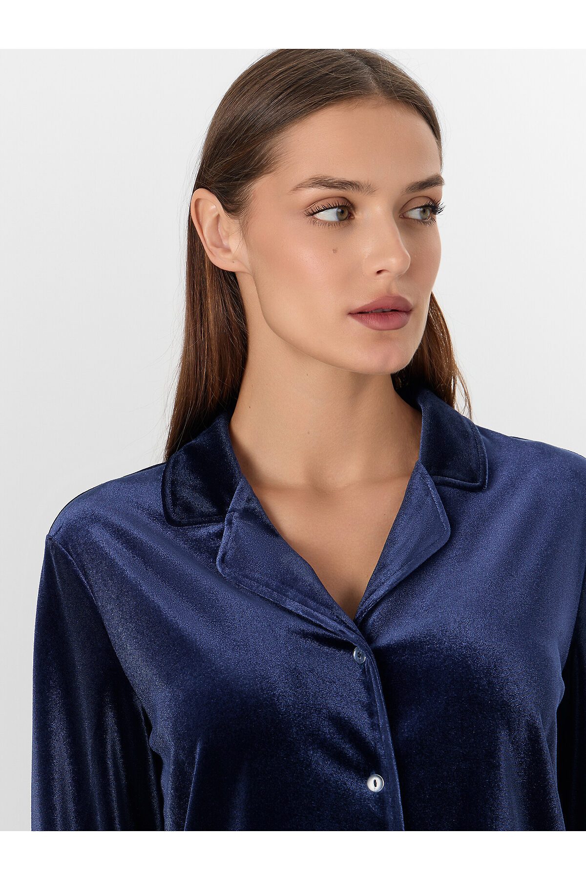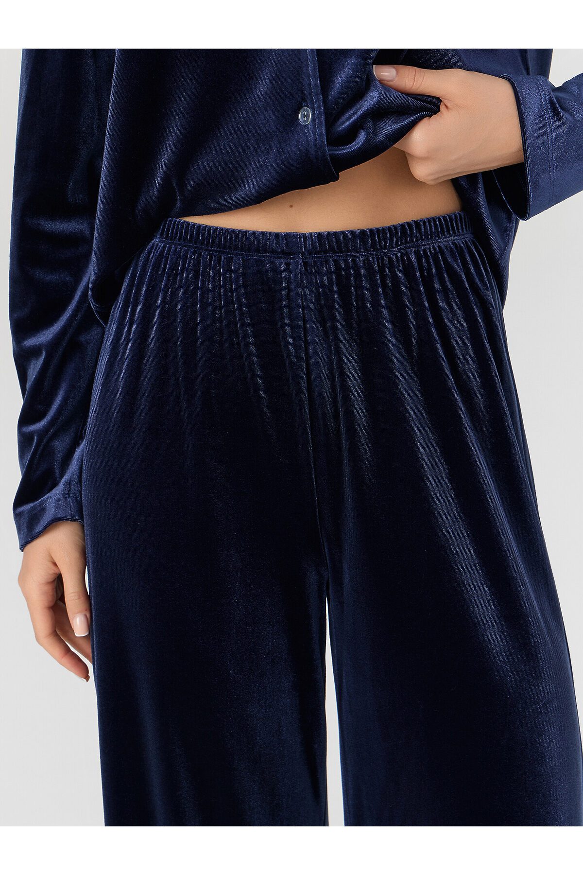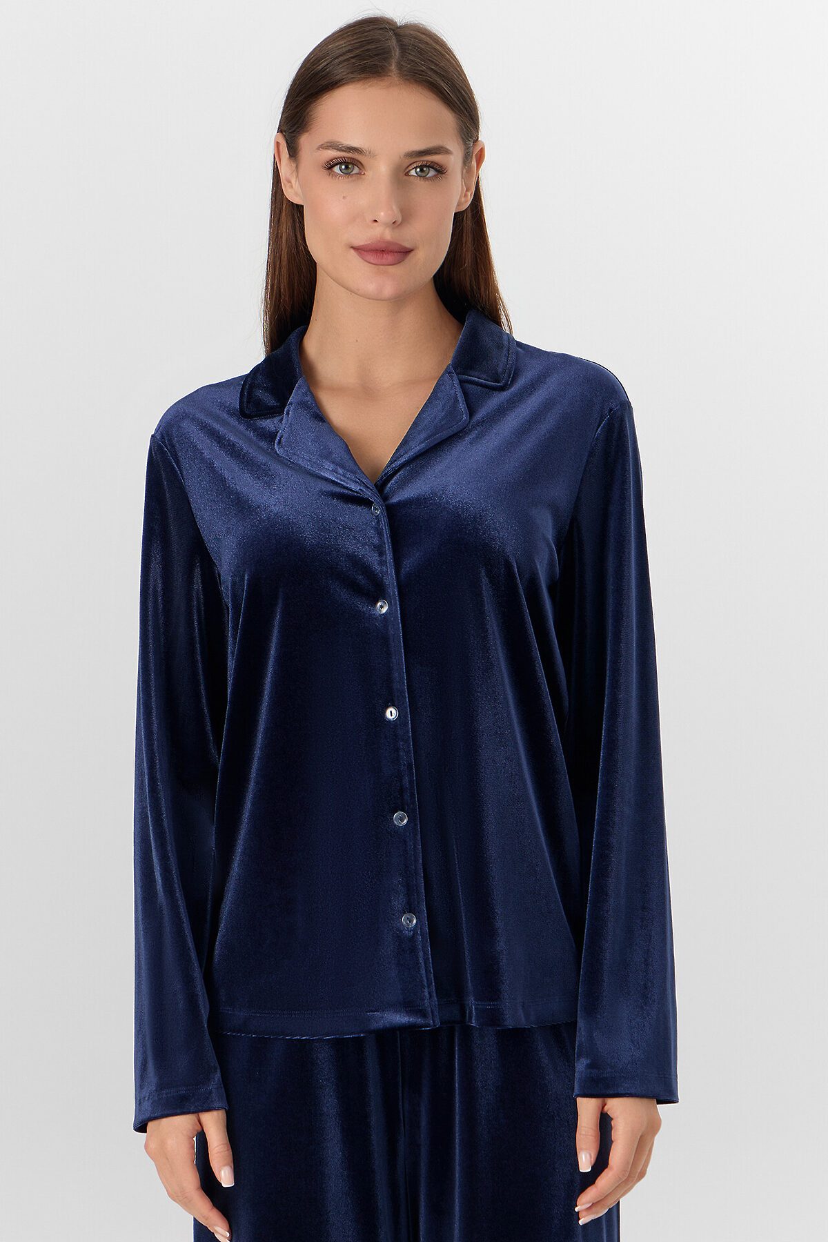 Жакет прямого силуэта. Горловина V-образной формы с отложным воротником и лацканами. По переду обработана центральная застежка на петли и пуговицы (D10 мм). Рукава втачные длинные. Нижний срез жакета и рукавов обработан швом вподгибку. Брюки прямые, свободные. Посадка средняя. Пояс цельнокроеный с эластичной тесьмой внутри (внутр. 20мм 20RV). Нижний срез брюк обработан швом вподгибку