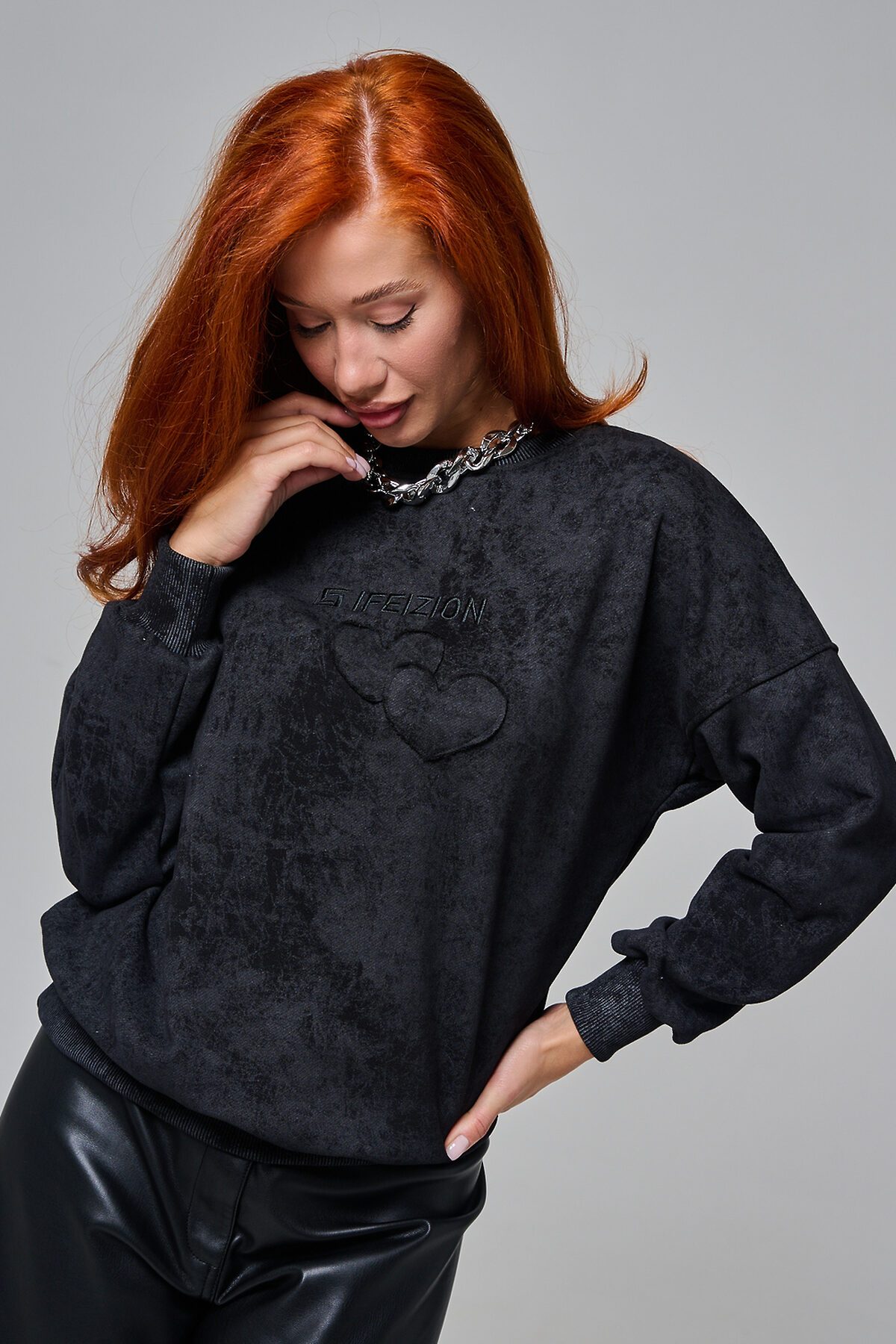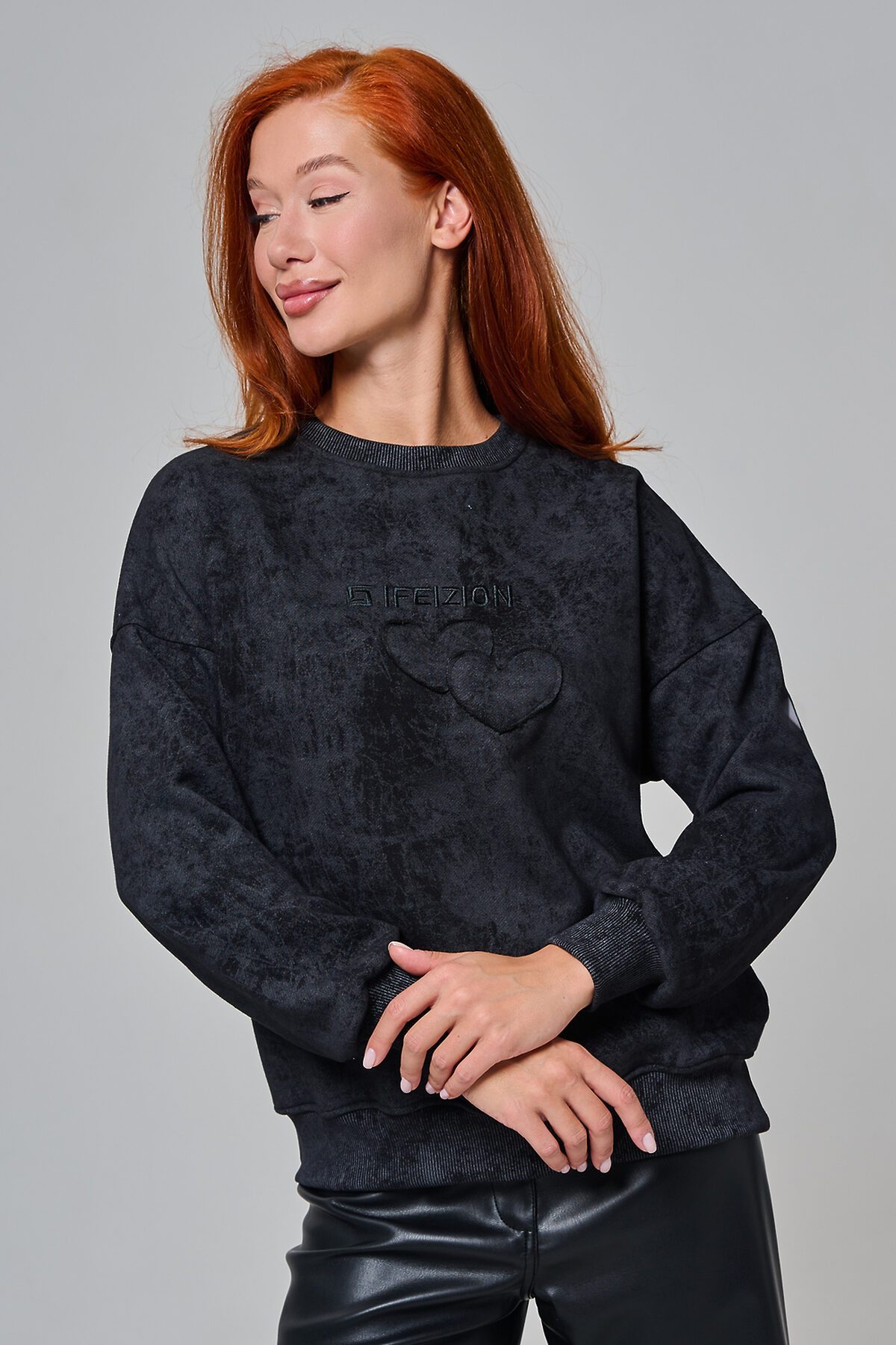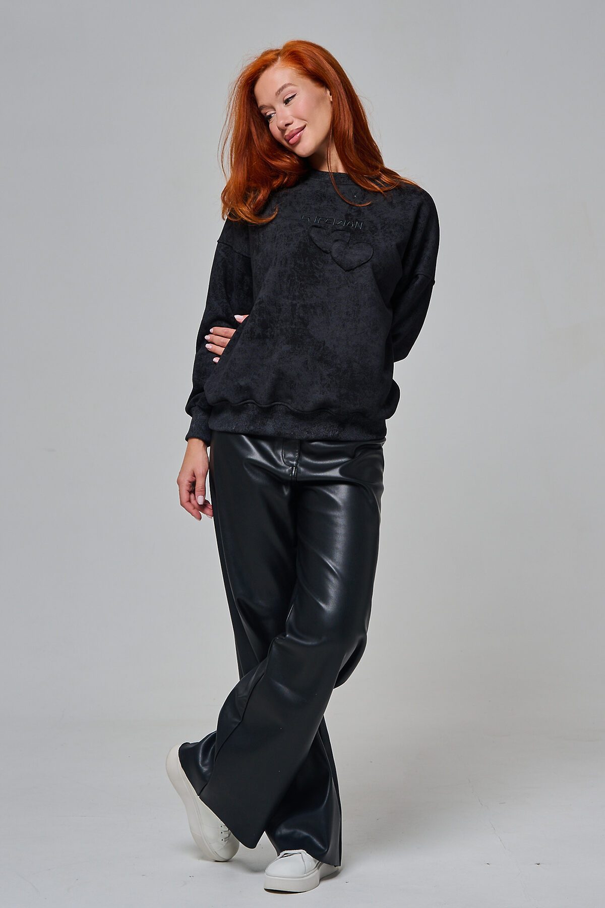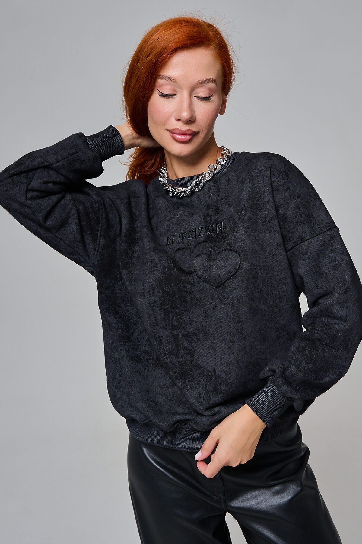 Толстовка женская оверсайз с вышивкой на полочке. Горловина, пояс, манжеты из кашкорсе в цвет основной ткани. Вверху по центру спинки - элемент в виде сердца.