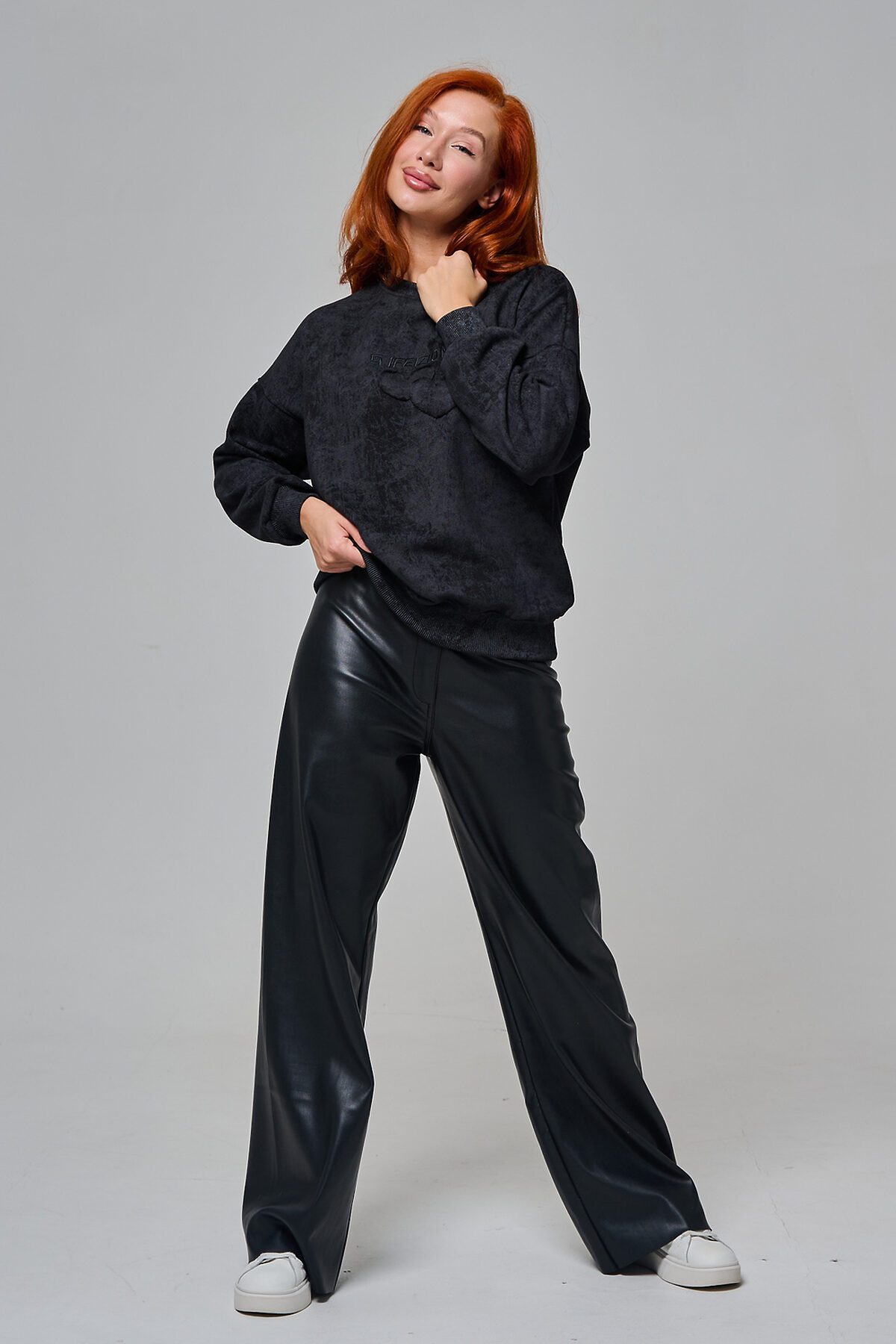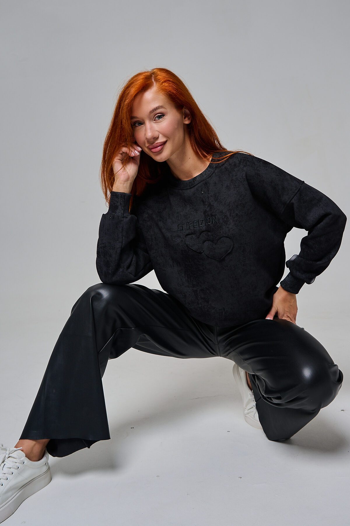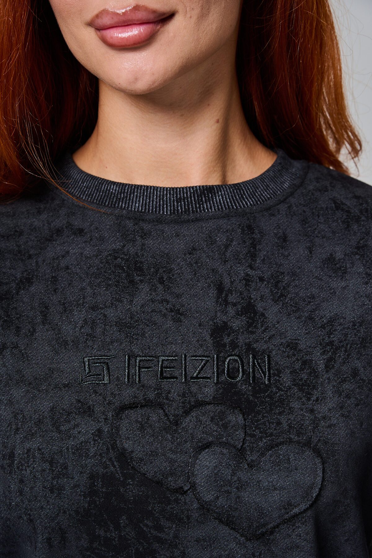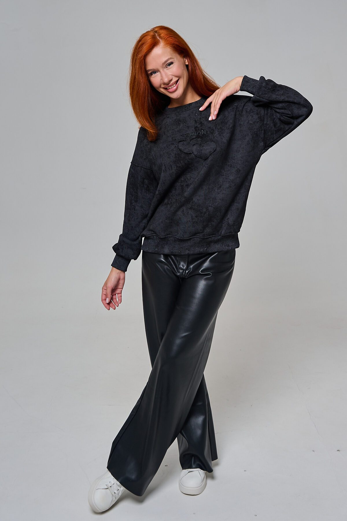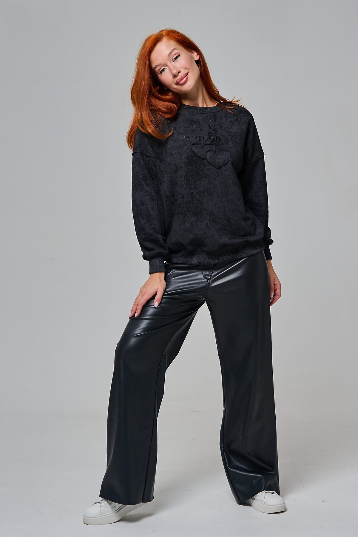 Толстовка женская оверсайз с вышивкой на полочке. Горловина, пояс, манжеты из кашкорсе в цвет основной ткани. Вверху по центру спинки - элемент в виде сердца.