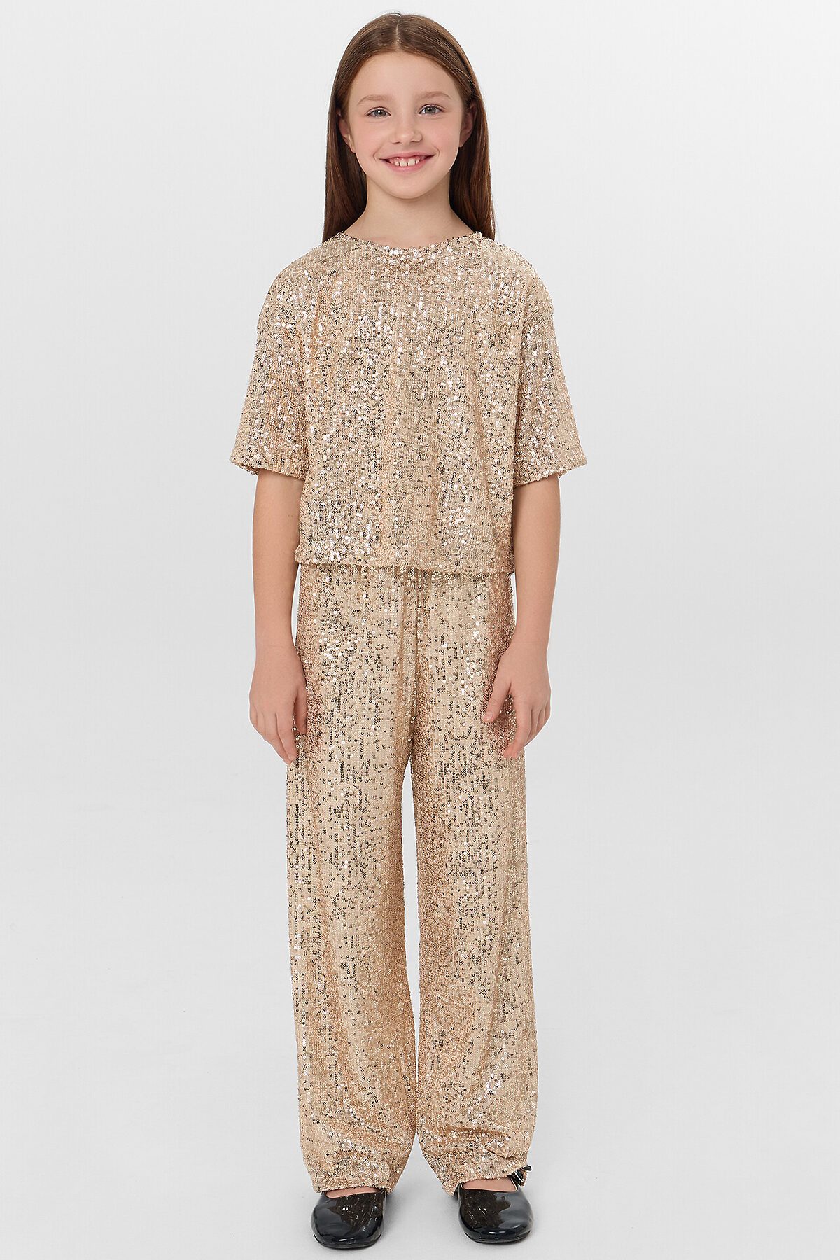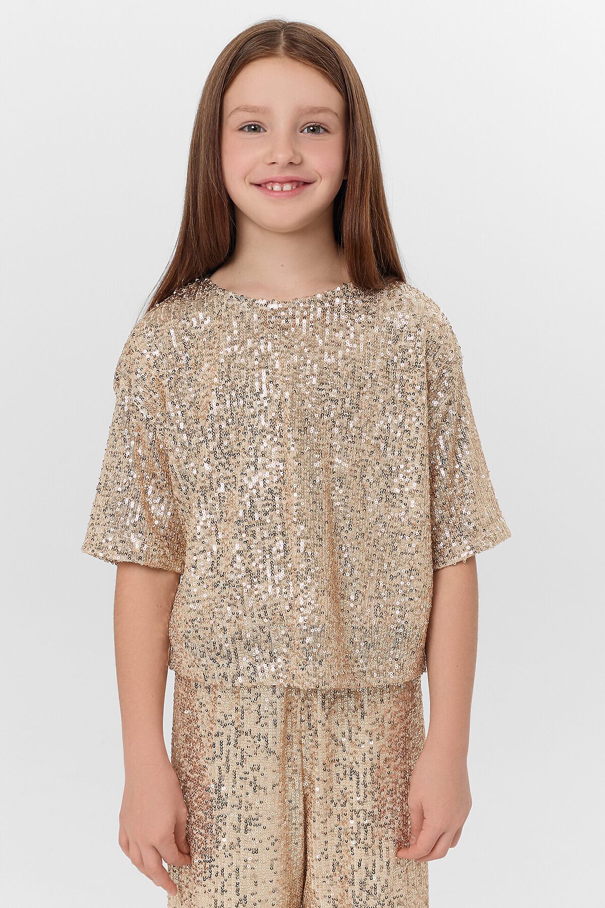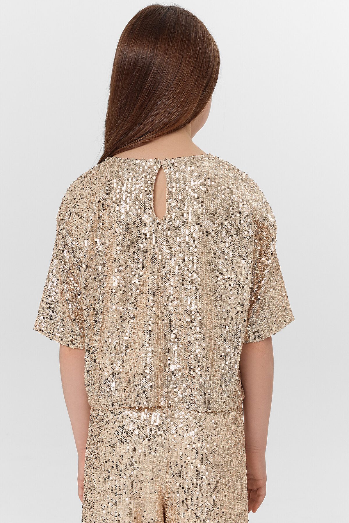 Блузка прямого силуэта, выполнен из пайеток. Вырез горловины круглый. Рукава короткие. Спинка и полочка цельнокройные, спинка длиннее переда. По спинке застежка-капелька на одну петлю WT4-6 и пуговицу d=10mm.