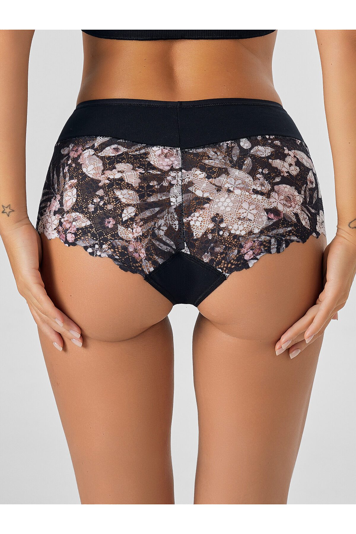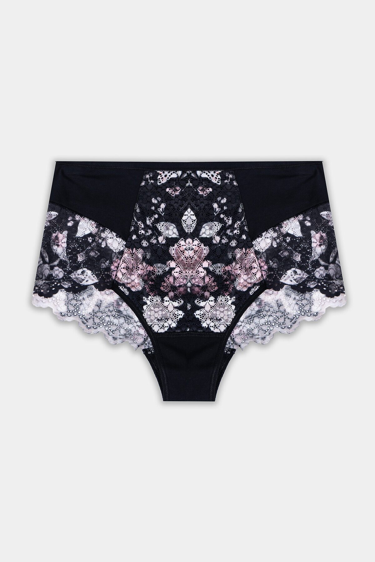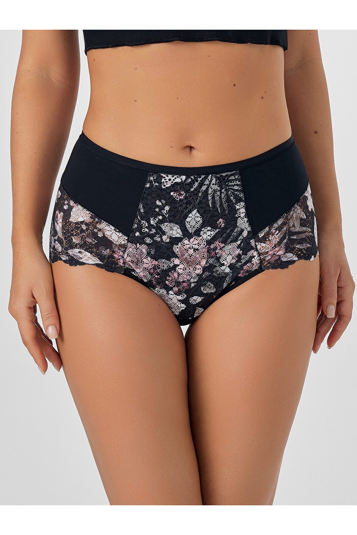 Трусы женские макси с высокой посадкой из кулирного полотна и эластичного кружева. Перед с вертикальным и горизонтальным членением. Передняя центральная деталь из кулирного полотна с наложением наверх эластичного кружева. Ластовица отрезная на подкладке из основного полотна. Срезы ластовицы обработаны эл тесьмой 6 мм (жилка тканая Wt4-6, девсел 13460 W) с наложением на лицевую сторону полотна и с узким верхним застилом в край. Задняя деталь со средним швом и с горизонтальным членением. Вертикальные и горизонтальные швы собраны на ширителе. Верхний срез обработан эластичной тесьмой 10 мм (жилка тканая Wt4-10, девсел 13460 W) с наложением на лицевую сторону полотна и с узким верхним застилом в край.