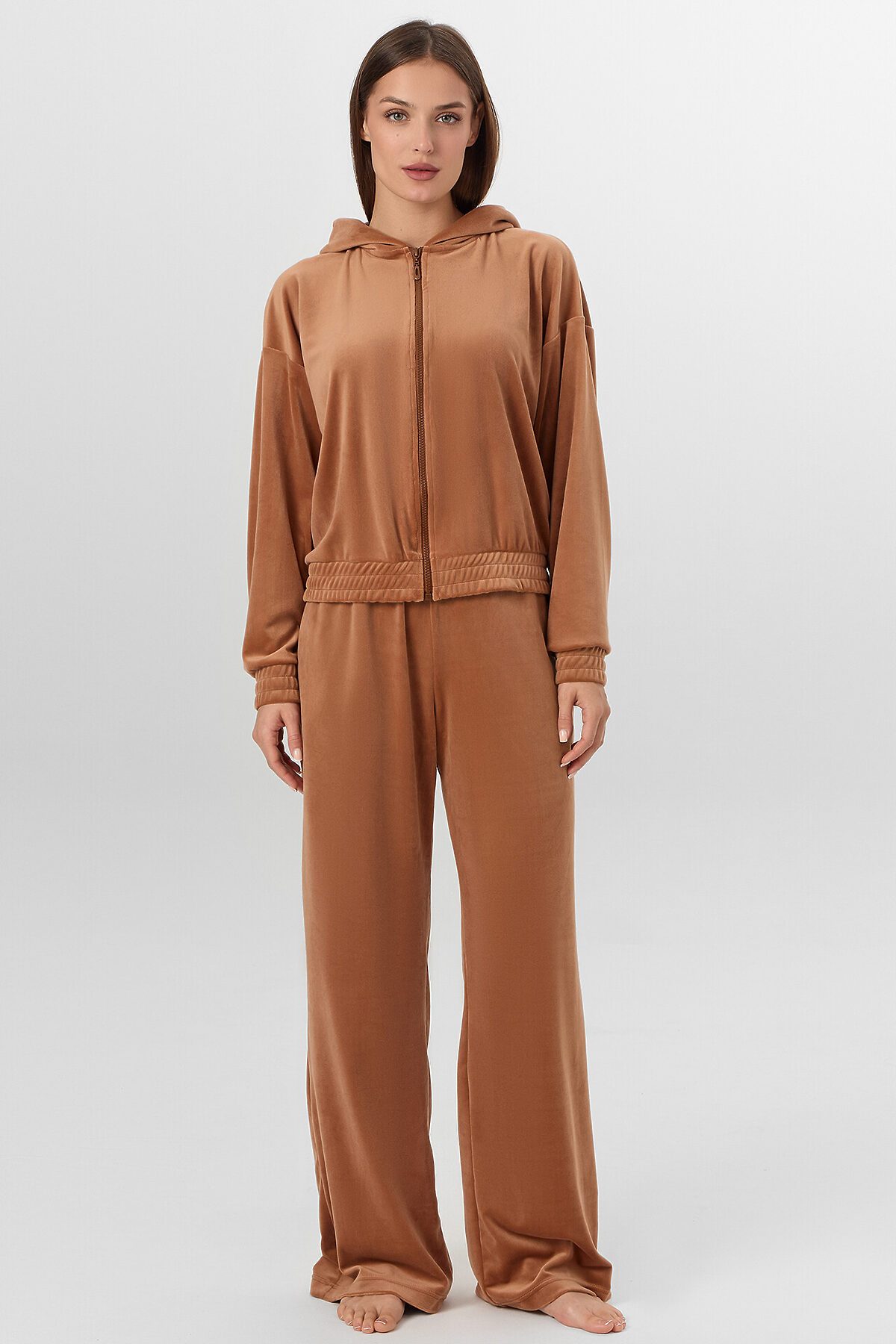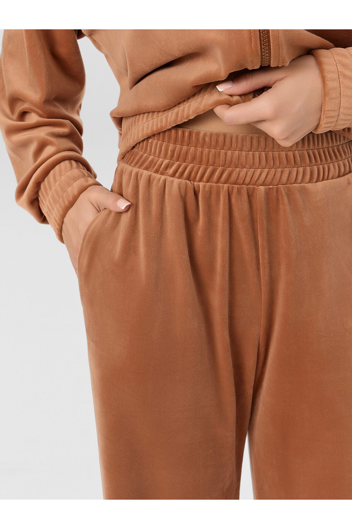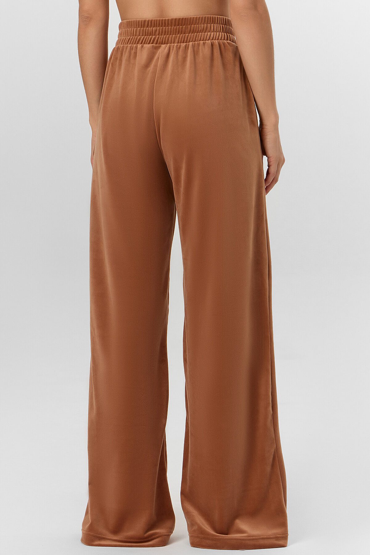 Мягкий велюр приятен к телу и обладает легким блеском. Широкий пояс со встроенной эластичной резинкой не давит на талию, а две отделочные строчки добавляют модели аккуратности. Удобные карманы в боковых швах практичны для хранения мелочей.