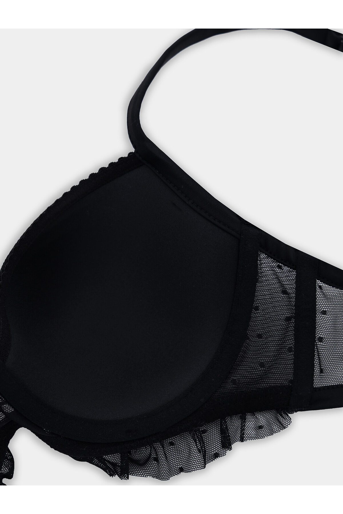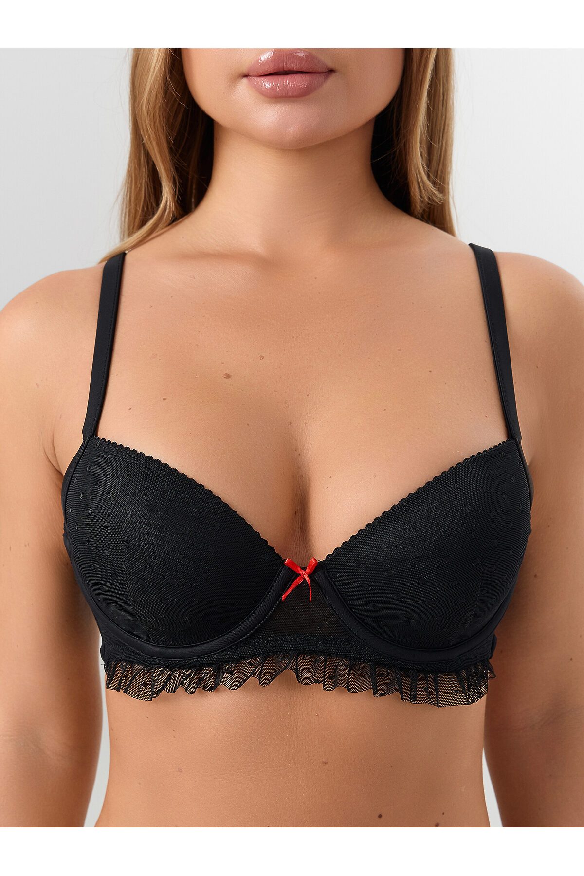 Бюстгальтер тишот с формованными чашками (CN-53.16m), на стане, на каркасах (2 ТИП), из кружевного полотна в горошек, декорирован микрофиброй. Верхняя деталь чашки с вытачкой из кружевного полотна, по верхнему срезу с изаночной стороны декорирована эл тесьмой 8 мм (жесткая с зубом WTE1-8, девсел 558W) . Ластовица и деталь стана из кружевного полотна, на подкладке из монокапрона. Нижний срез стана обработан эл тесьмой 10 мм (жесткая без зуба WTWE1-10, девсел 487W), и декорирован рюшей из круж полотна с сырым срезом. По каркасам с лицеdвой стороны настрочены декоративные обтачки из микрофибры. Верхний срез бочка и проймы окантованы бейкой из микрофибры с эл тесьмой 10 мм внутри (жесткая без зуба WTWE1-10, девсел 487W), переходящей в бретель. Бочки отрезные, из круж полотна. В бочках пластины. Нижний срез бочка окантован бейкой из микрофибры с эл тесьмой 10 м внутри (жесткая без зуба WTWE1-10, девсел 487W). Бретель 10 мм (SWE3, девсел 1979W) с регулировкой по длине. Кольца-регуляторы 10 мм. Застежка двойная 38 мм . Декорирован 1 бантиком по центру ластовицы.