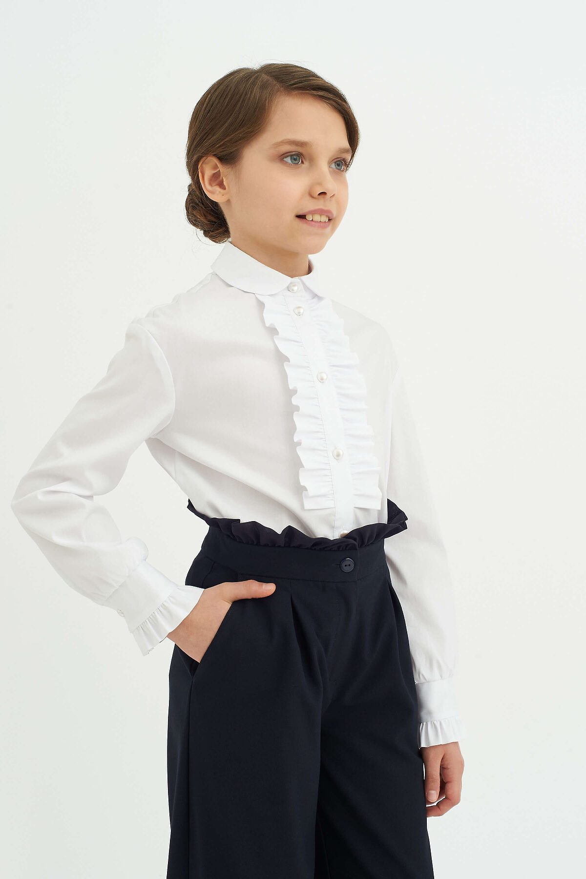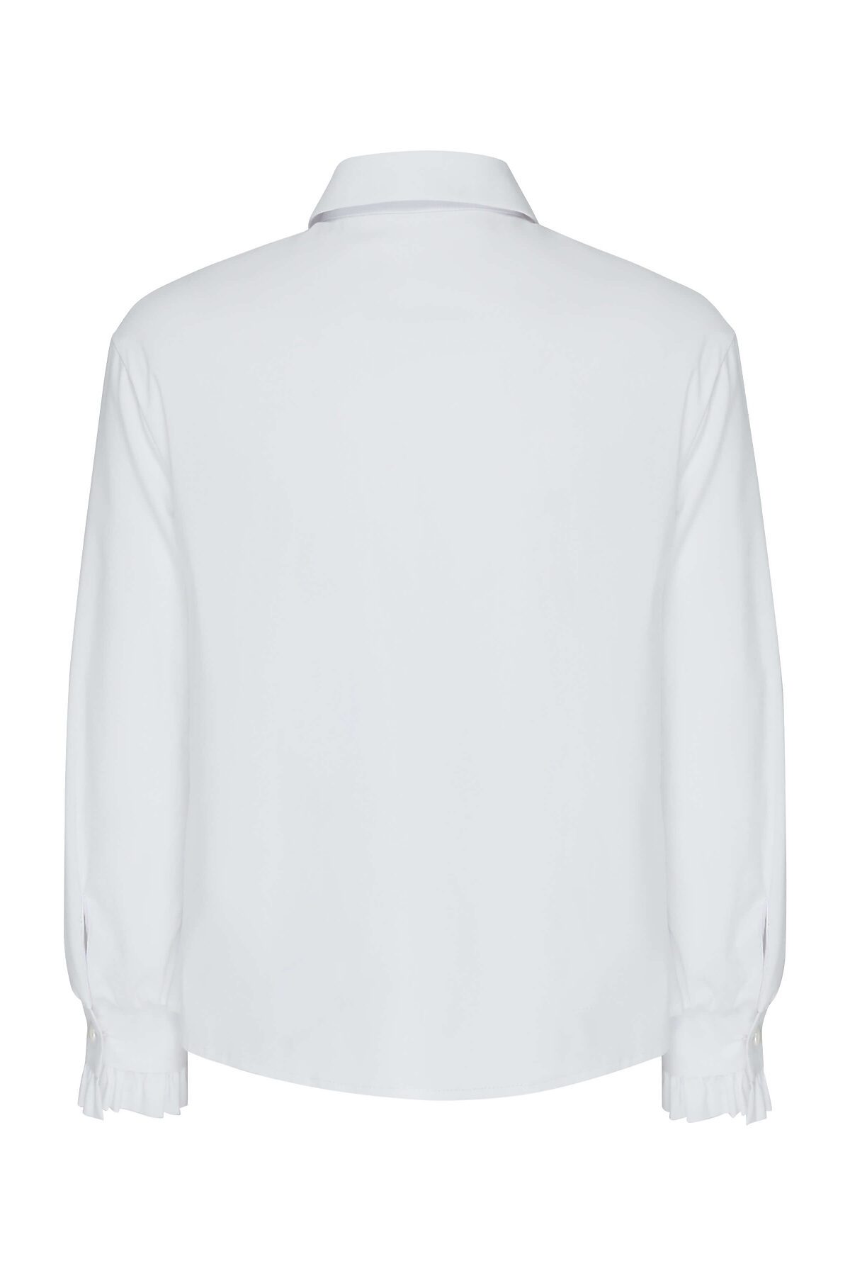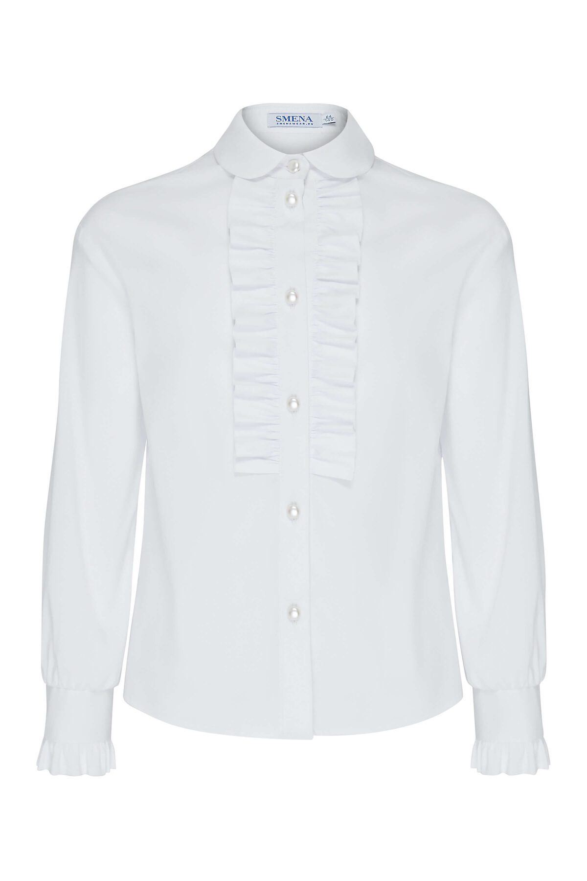 Классическая блузка из смесового хлопка полуприлегающего силуэта с отложным воротником. Длинные спущенные рукава с манжетами, по краю манжет выполнена декоративная оборка. Полочка декорирована оборками по центральной застёжке с пуговицами Высокое содержание хлопка в составе обеспечивает отличную воздухопроницаемость и комфорт в повседневной носке.